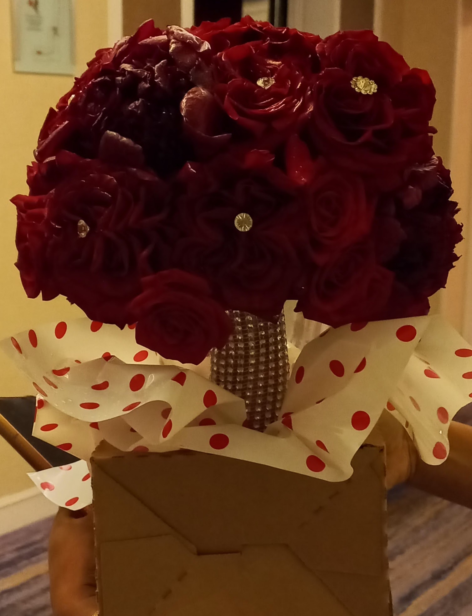 This stunning red roses and red peony bridal bouquet features red garden roses, peonies, spray roses with a rhinestone band. Price includes taxes and delivery fees. Delivery to Miami-Dade and Broward Counties