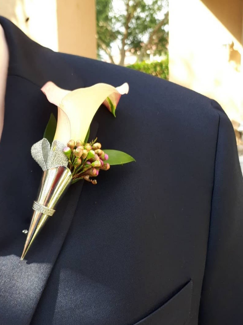 this mini calla lily boutonniere has wax flowers, silver ribbon in a silver vase. This is a sleek look and it pin on the jacket. We deliver to Miami-Dade and Broward Counties. Price includes taxes and delivery fees.
