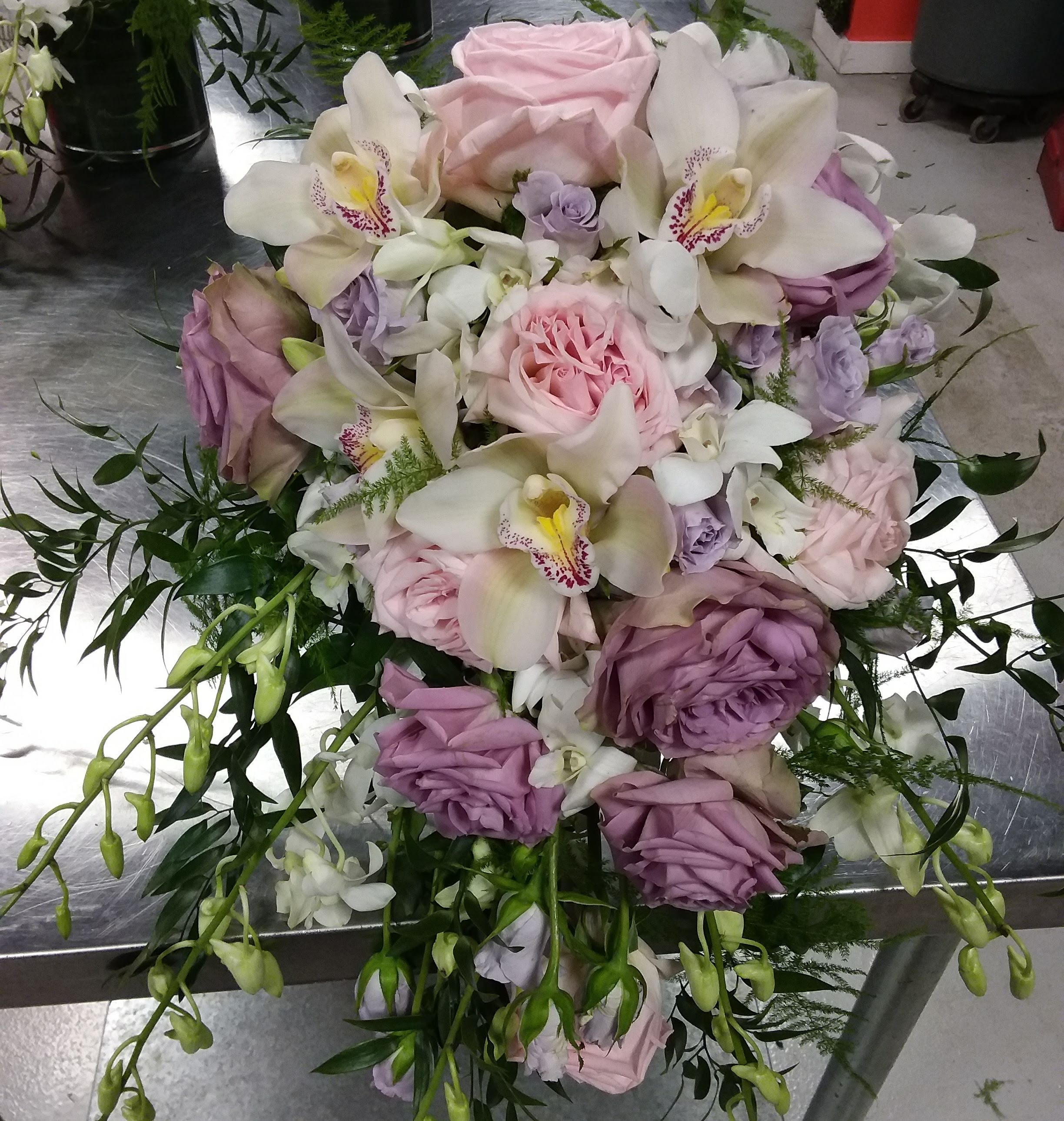This beautiful full bloom bridal bouquet features white dendrobium orchids, white Cynbidium Orchids, lavender and light pink garden roses,lavender spray roses nestled in Italian ruscus. Price includes tax and delivery fees. We deliver to Miami-Dade and broward counties and Palm Beach