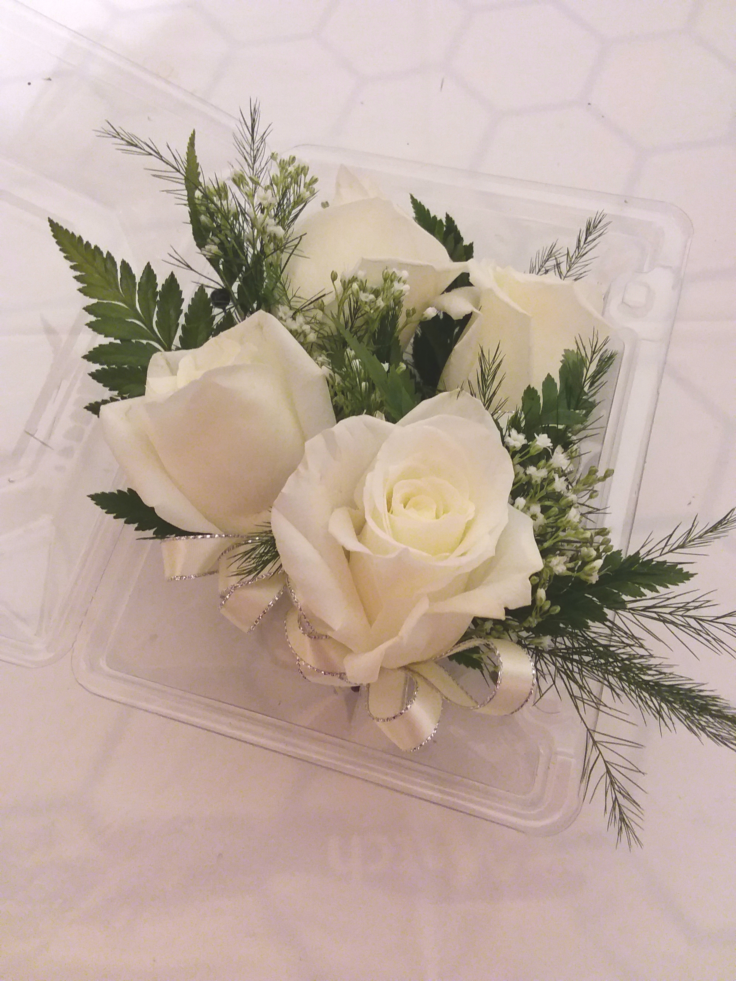 This beautiful all white roses boutonniere nicely accented with white satin with silver, white wax flowers and greens. Price includes tax and delivery fees. We deliver to Miami-Dade and broward counties.