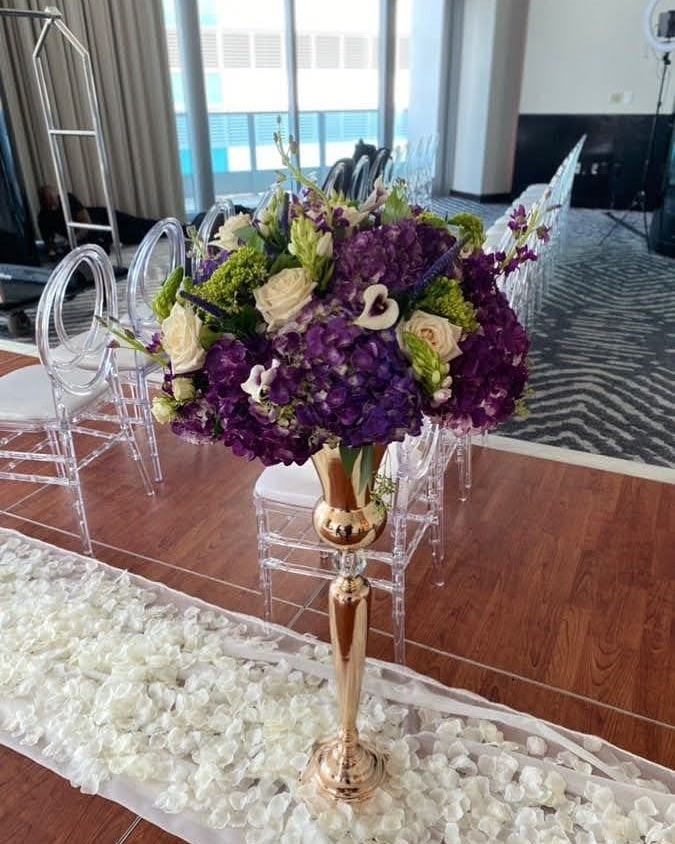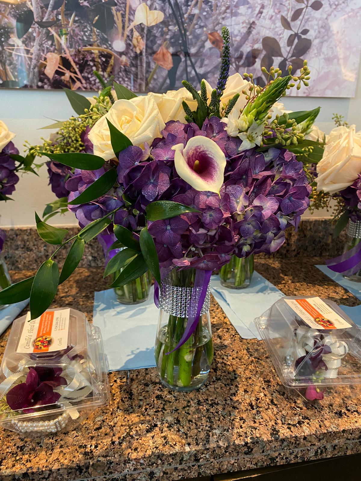 This beautiful hydrangeas arrangement features purple elite hydrangeas, cream Equadorian roses, Picasso mini calla lilies, purple veronicas and star of david, spray roses and seeded Eucalyptus. Price includes taxes. We deliver and set up to your venue. We deliver to Miami-Dade and broward counties and Palm Beach.delivery fees not included