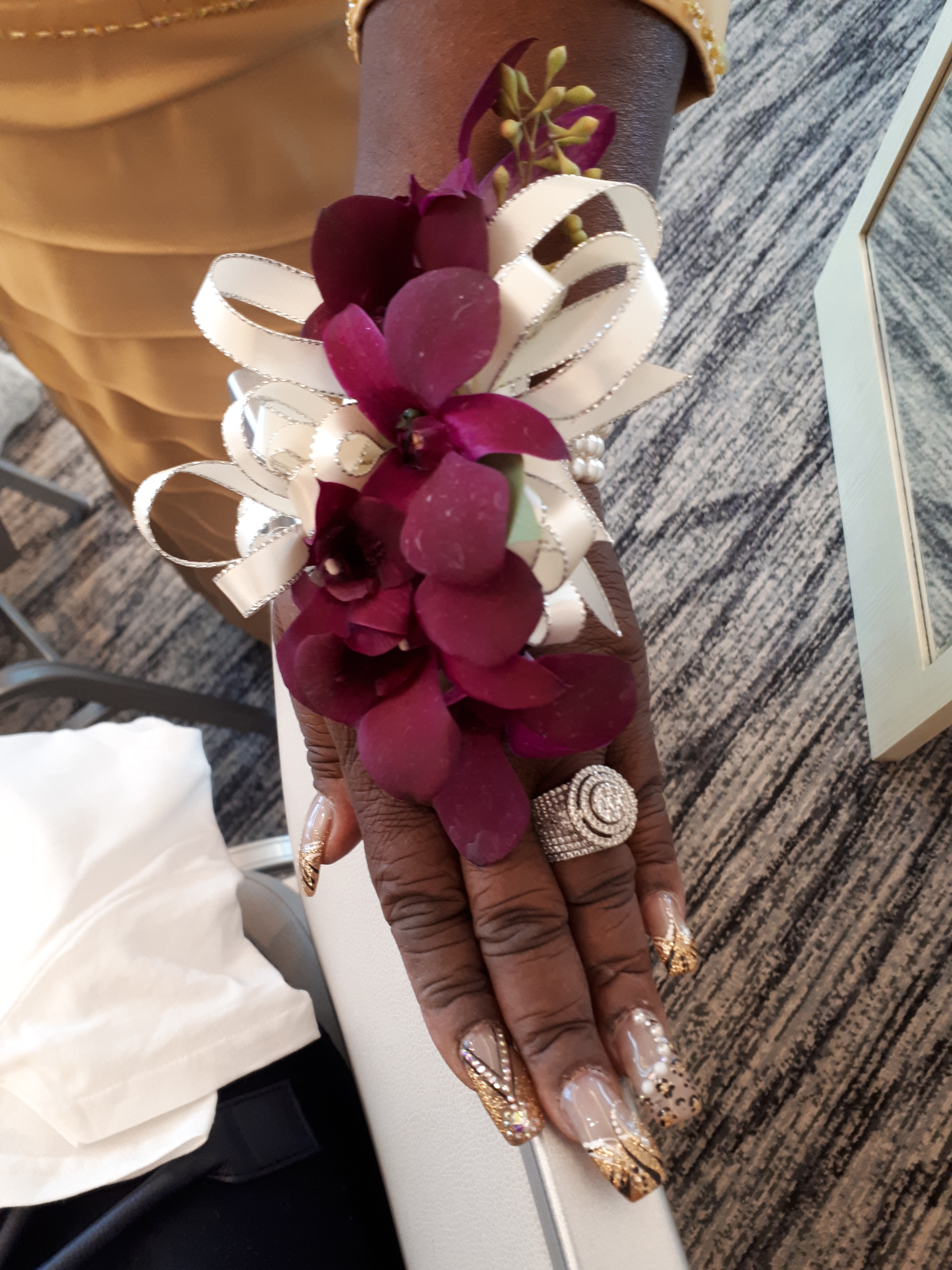 This beautiful light weight dendrobium orchid wrist corsage features purple dendrobium orchids, wax flowers accented nicely with silver ribbons. With matching boutonniere. This is available in other colors. Price includes tax and delivery fees. We deliver to Miami-Dade and broward counties.