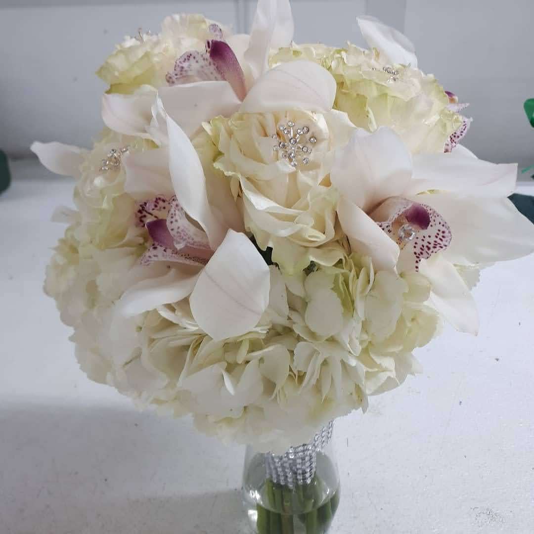 This beautiful hand tied wedding bouquet will be one of the many highlights from your wedding. It features hydrangeas, cream garden roses, white Cynbidium Orchids beautifully accented with rhinestone pins and rhinestone band. We deliver to Miami-Dade and broward. Price includes taxes. Delivery fee not included.