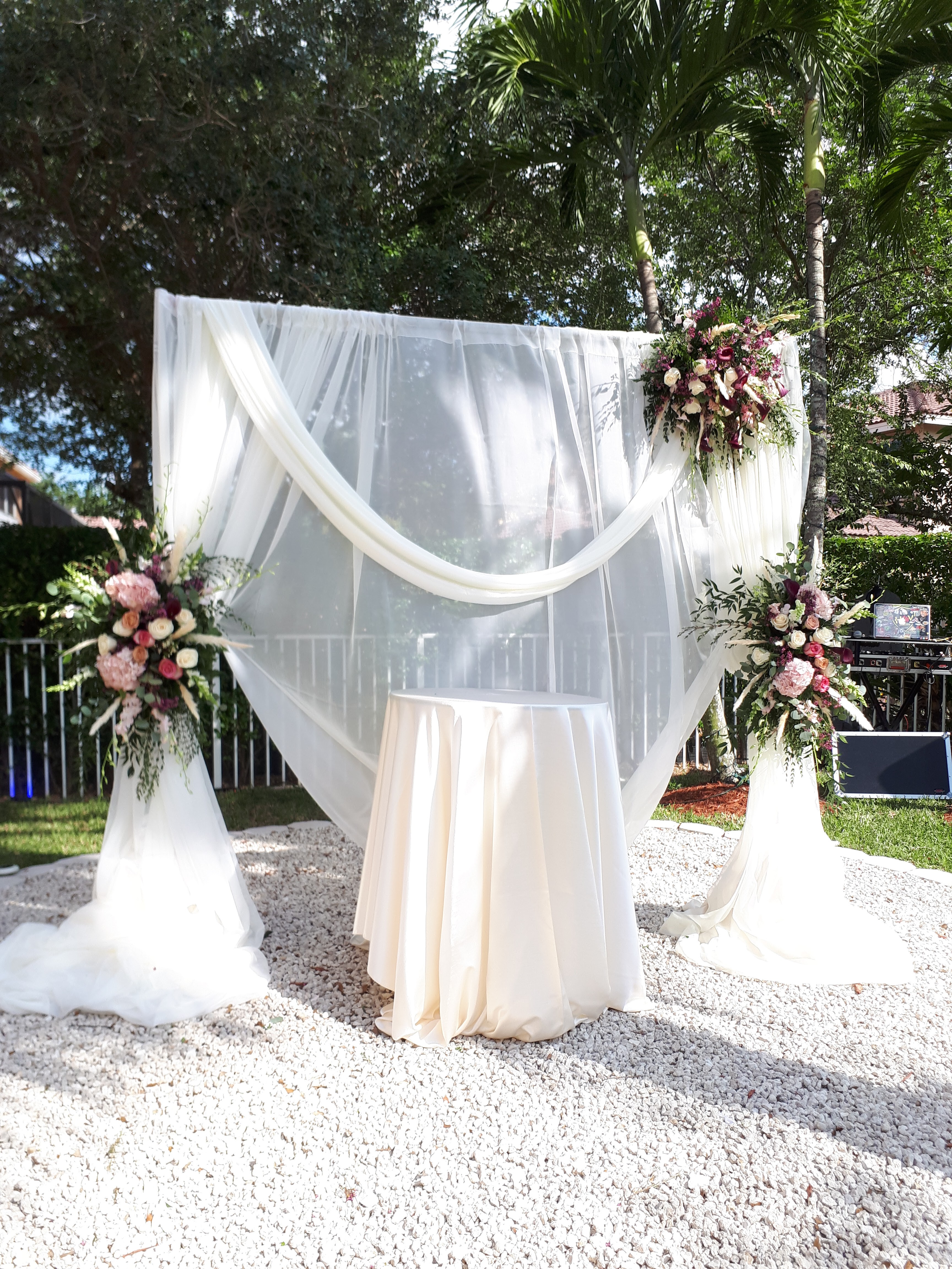This beautiful large bridal arch arrangements can accentuate your wedding day while you say your vows. This one piece arrangement is perfect for an intimate setting fit. It fits perfectly on any size arch. It is made onsite at your venue on your special day. It features burgundy mini calla lilies, cream colored roses, white snapdragons, pink dendrobium orchids, purple wax flowers, silver dollar greens, Italian ruscus greens, leather leaves and bleached pampas grass.We can customize it to fit your color theme.We sheer material not included. Price includes taxes. We deliver to Miami-Dade and broward. Delivery fee not included.