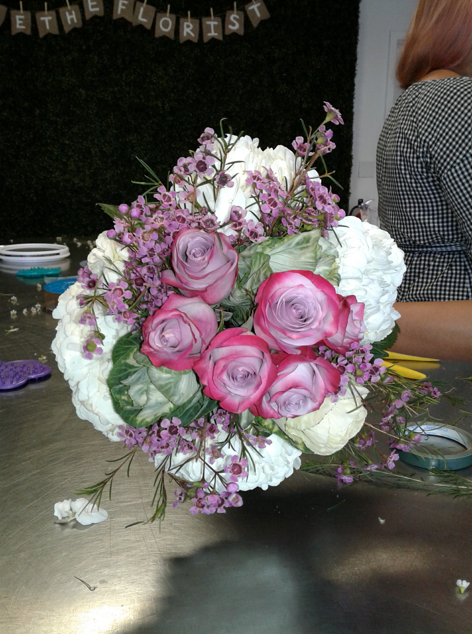 This beautiful bridal bouquet features purple roses, kale. white hydrangeas and wax filler flowers. (color of roses can be changed upon request). We deliver to bride’s location, Price includes taxes and delivery fees. We deliver to Miami-Dade and broward Counties