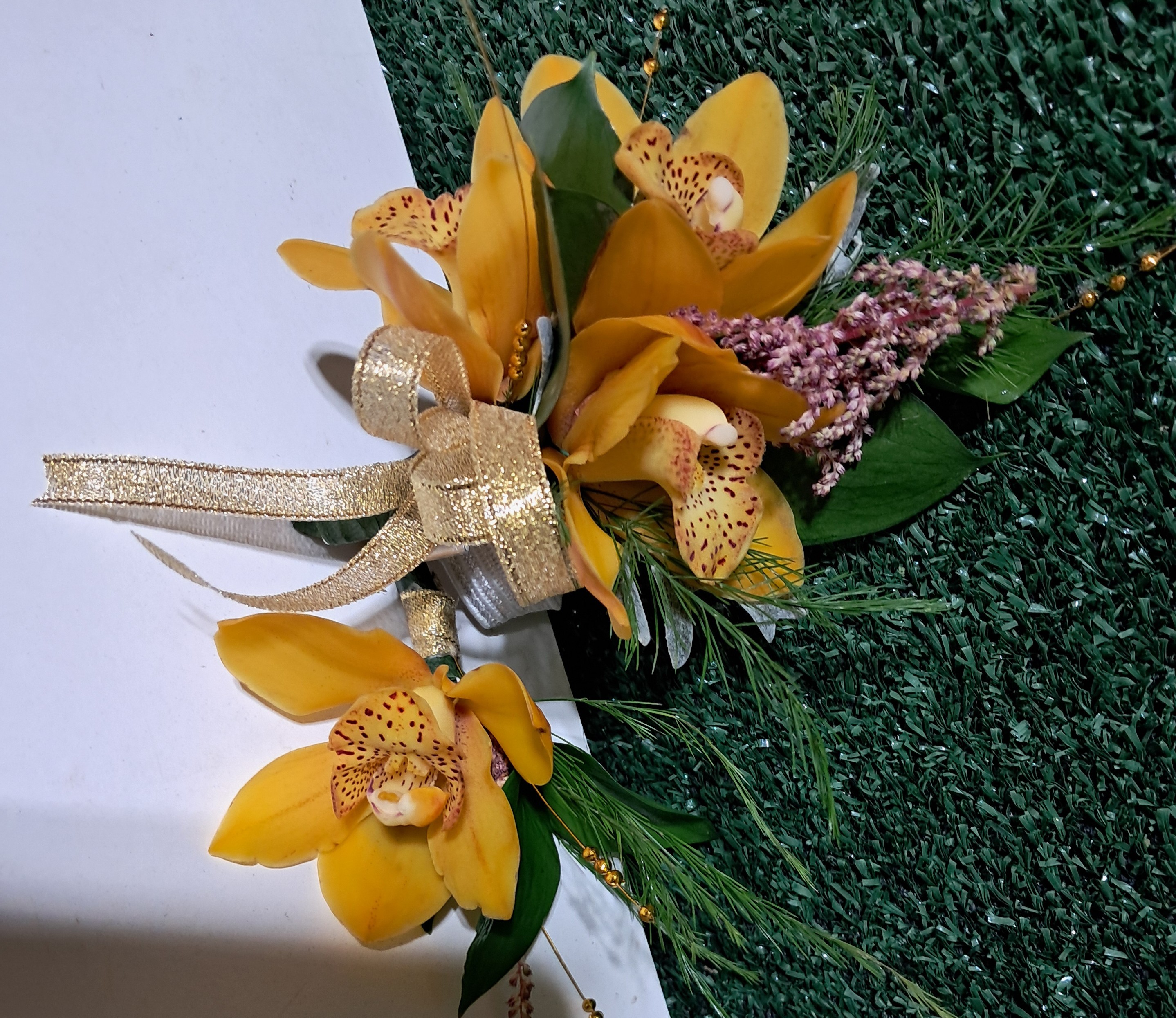 This beautiful mini (if available)cynbidium (gold) hand corsage and bouttoniere set is great for your wedding. Price includes taxes and delivery fees. We deliver to Miami-Dade and broward counties.