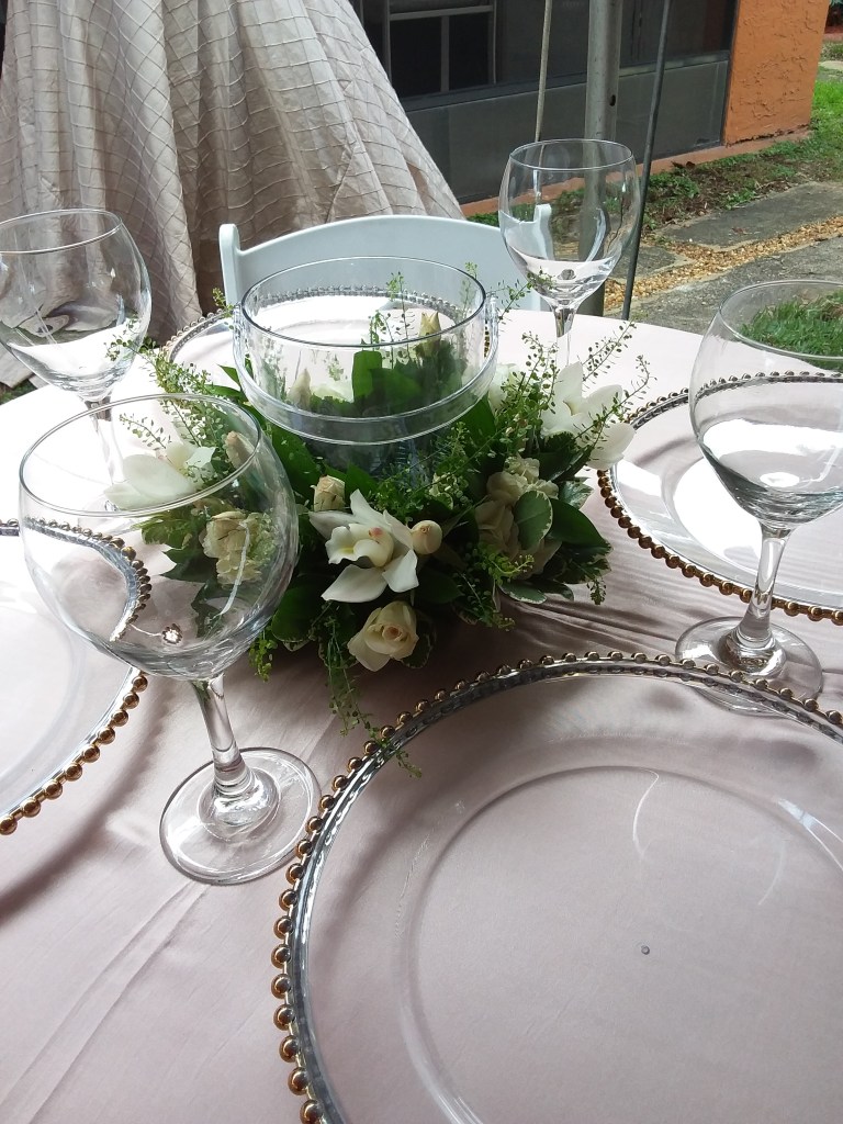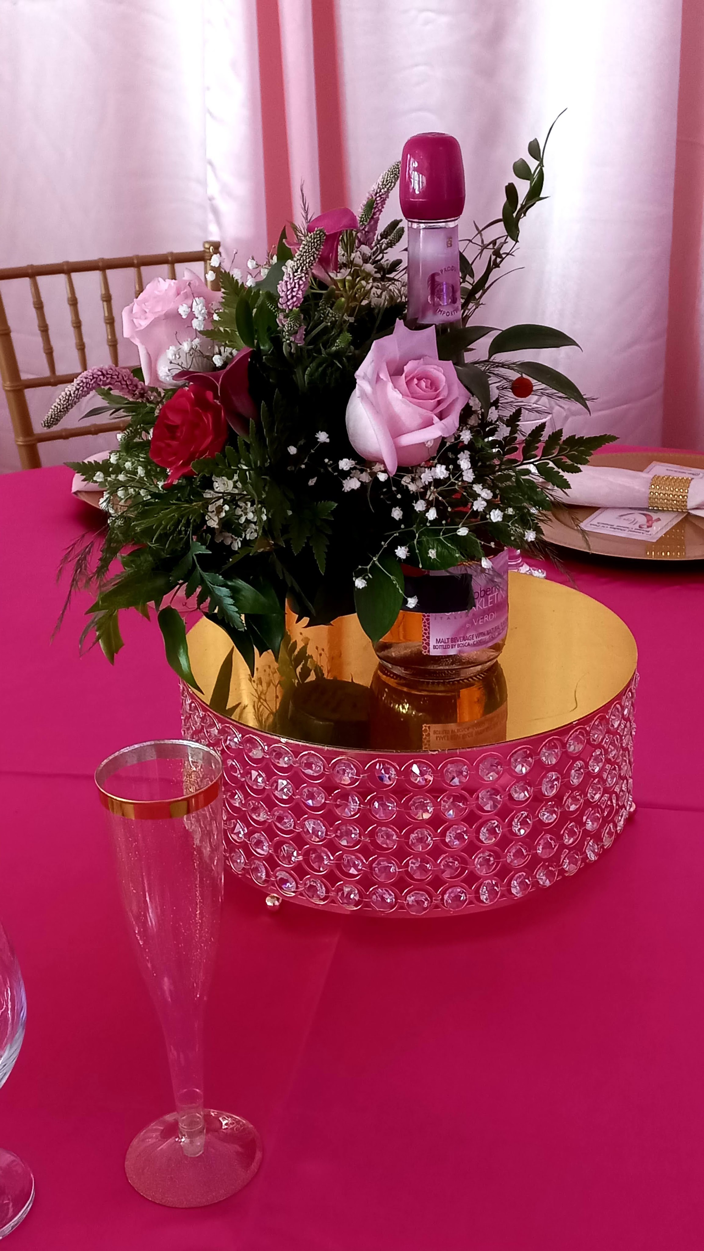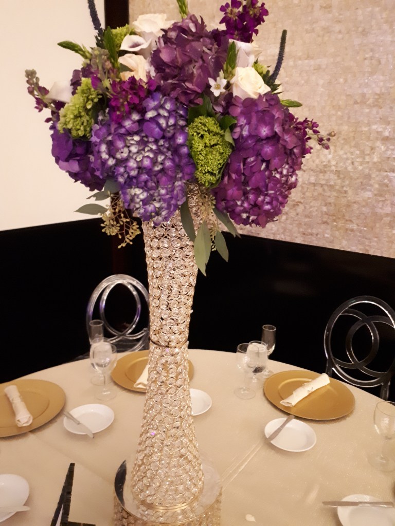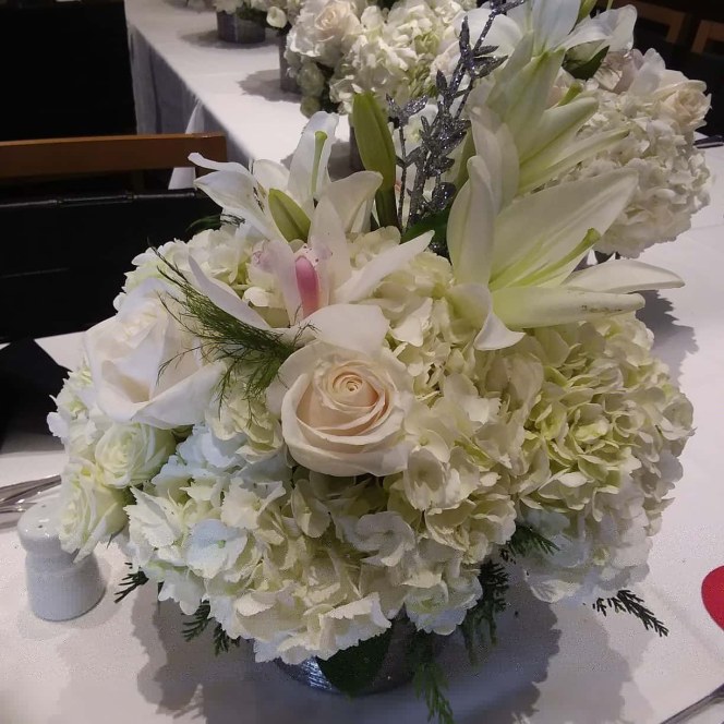 BOTTLE BOUQUETSReception Party Centerpieces WHITE HYDRANGEAS/Roses/white Lilies and orchids IN SILVER VASE CENTERPIECESBaby christening