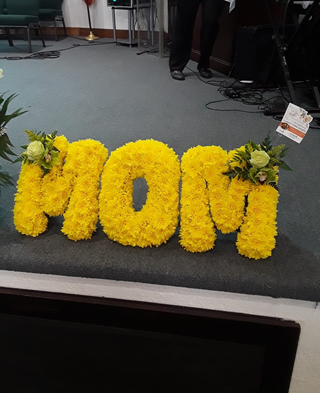 This beautiful large MOM arrangement says it all. Honor your mom, grandmother favorite MOM. Your choice of colors. Features gold chrysanthemums and green roses. Price includes taxes and delivery fees. We deliver to Miami-Dade and broward counties.