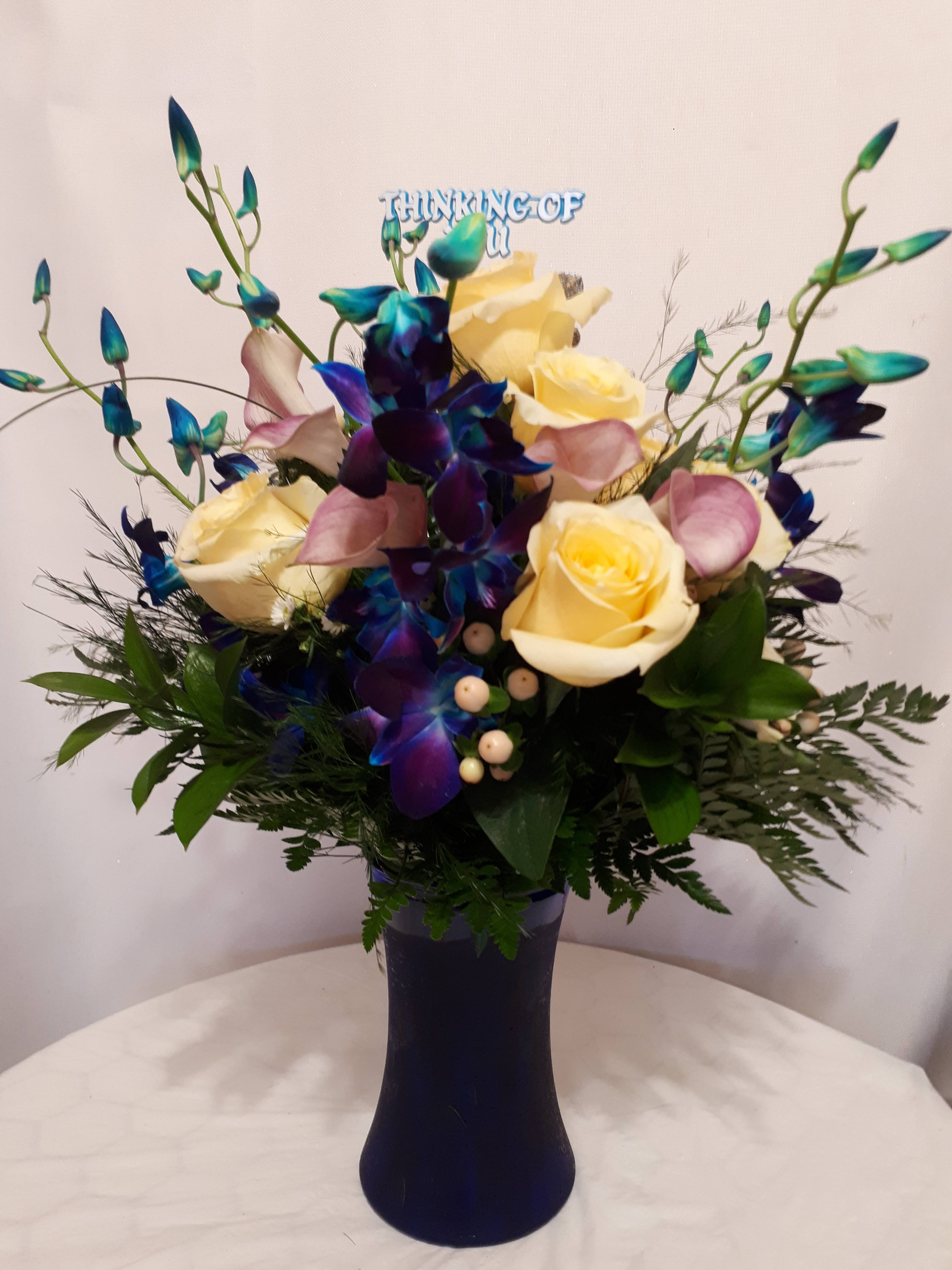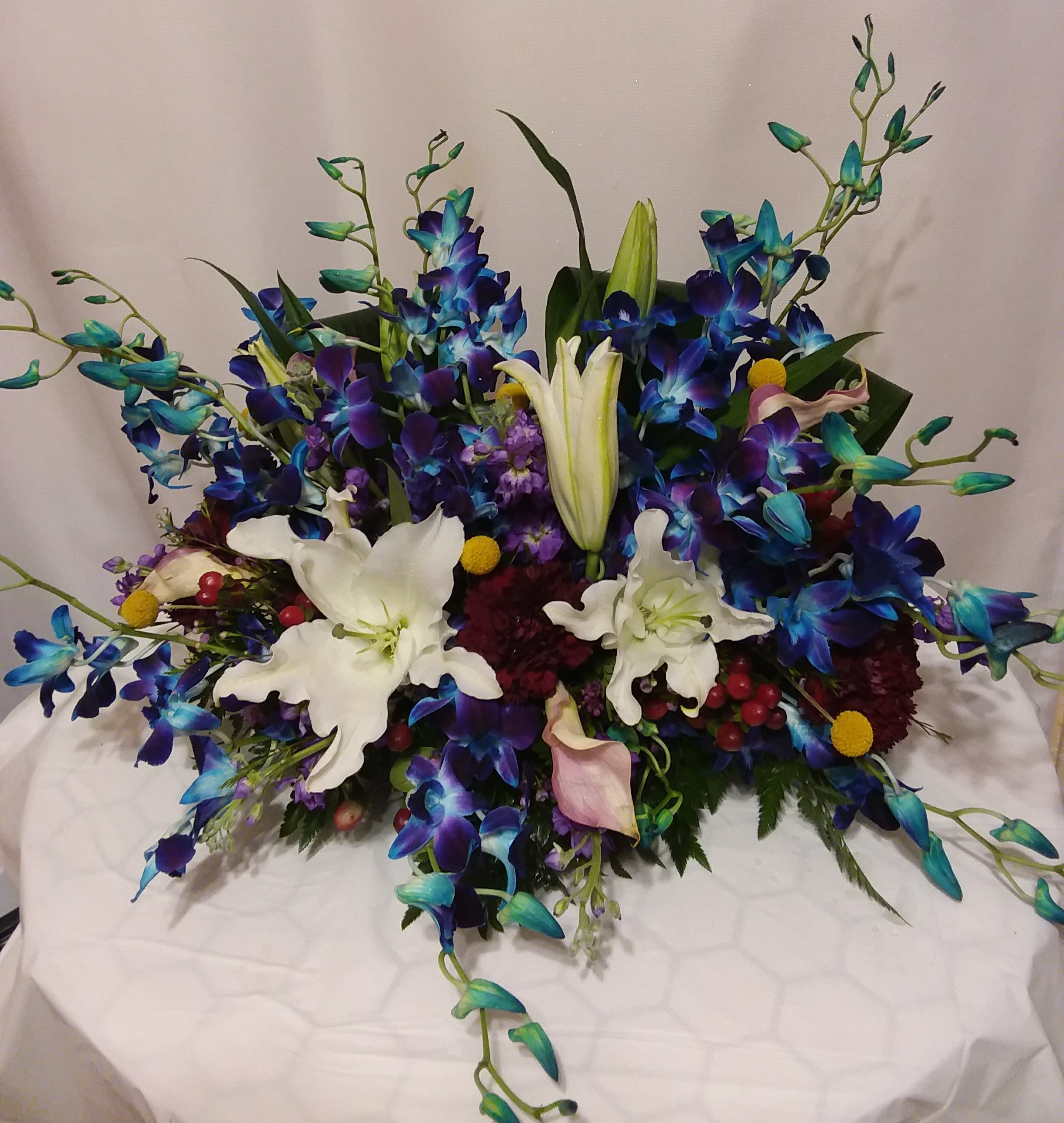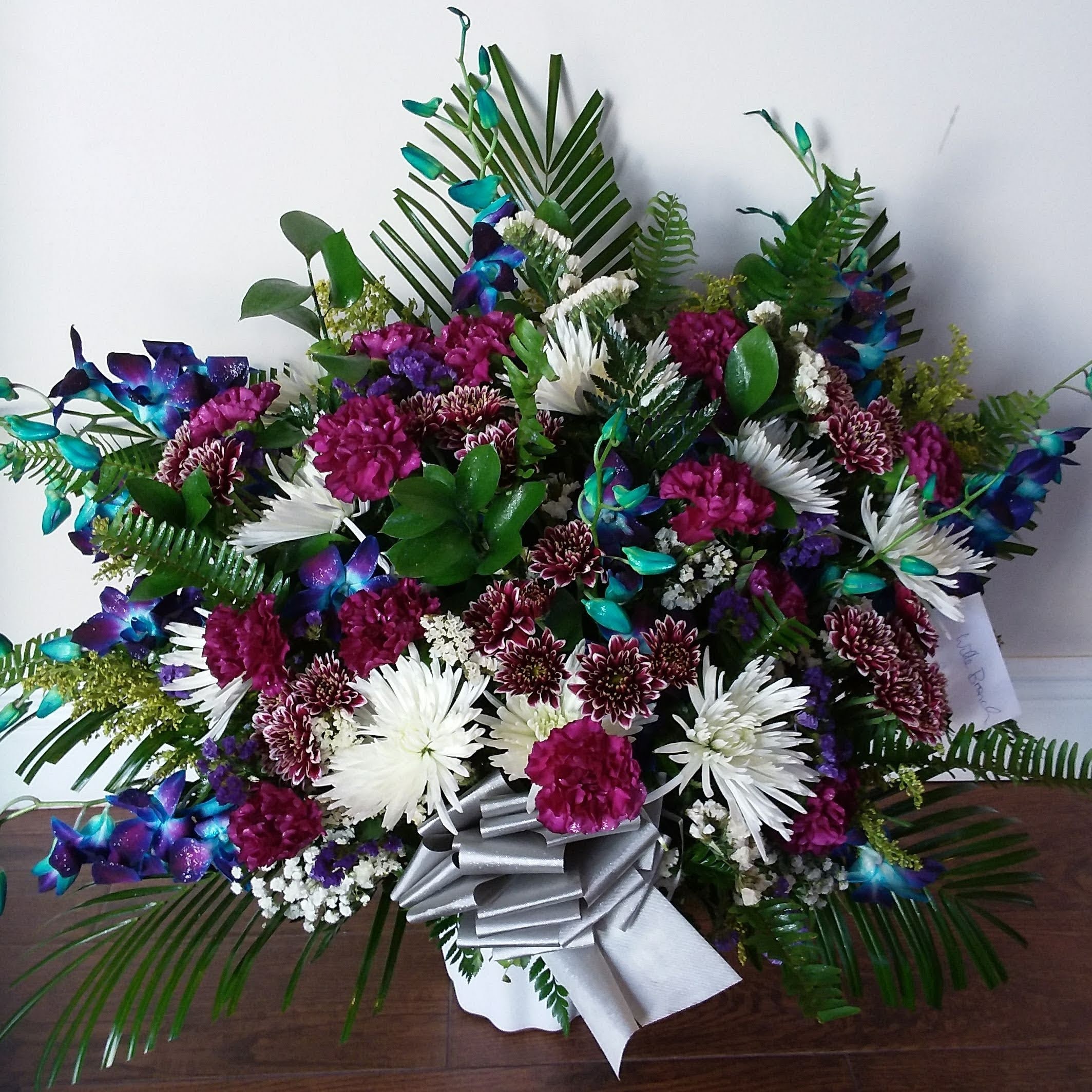 This beautiful large sympathy tribute arrangement features blue dendrobium orchids, white roses, white lilies, Picasso mini calla lilies, purple stock, purple asters, and mixed greens. Price includes taxes and delivery fees. We deliver to Miami-Dade and broward counties.