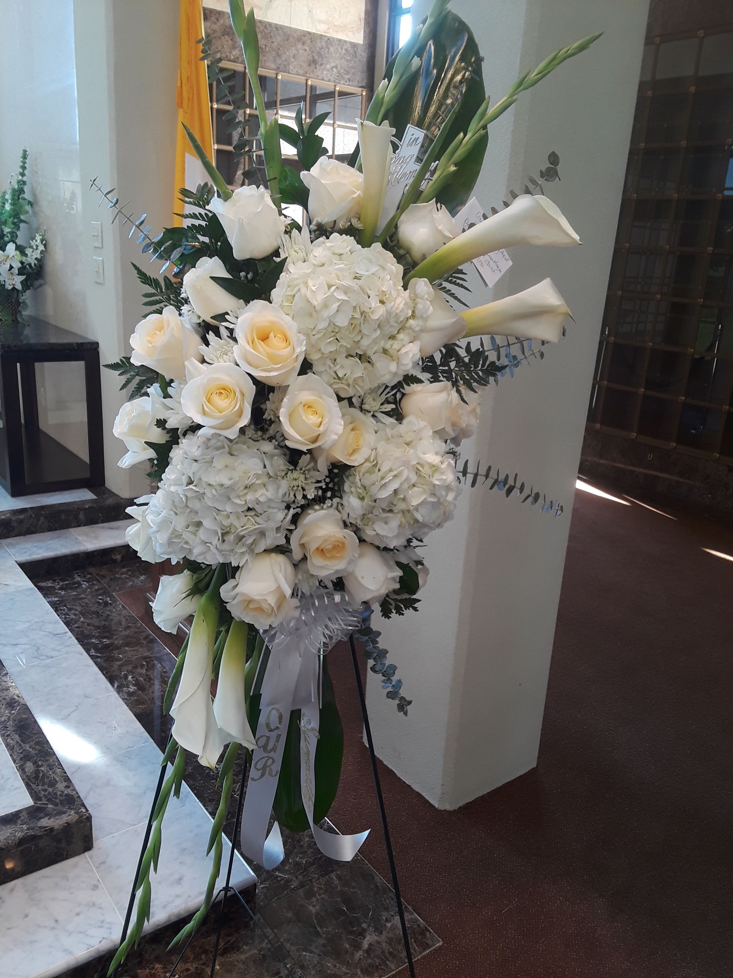 Peaceful sleep Sympathy Standing Spray features White Hydrangeas, cream vandela roses, large White Calla Lilies and White Gladiolas if available during season., Eucalyptus. Price include delivery fees. We deliver to Miami-Dade and broward counties. Contactless delivery