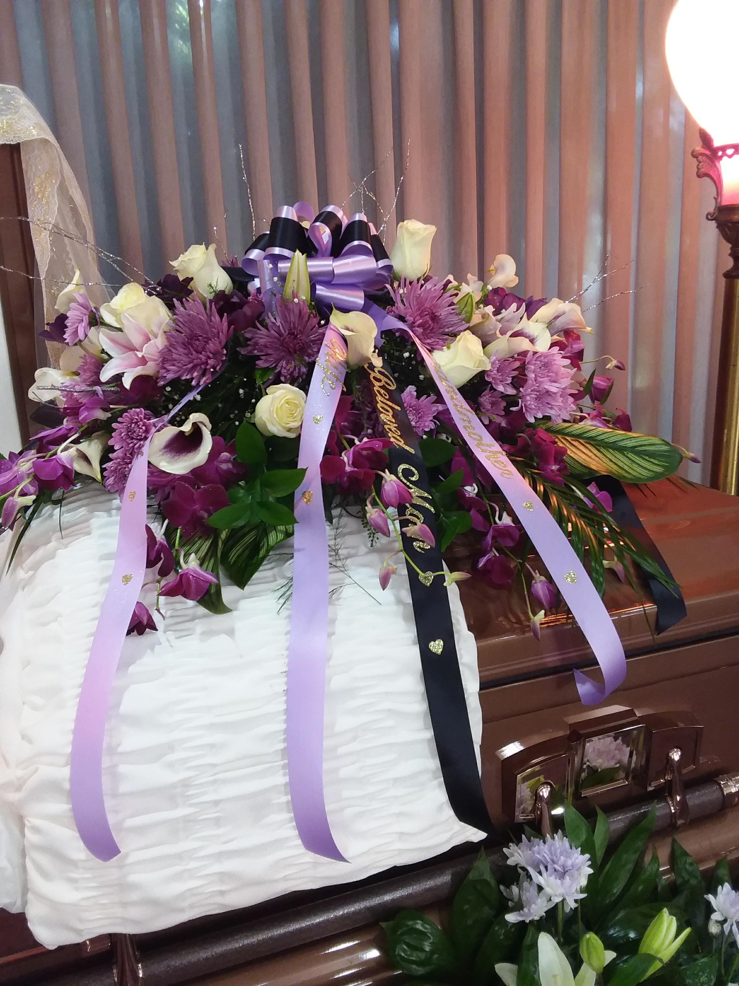 Honor your loved one with this beautiful casket spray it features white Asiatic lillies, purple carnations, red roses, yellow cushions, white Dendrobium orchids nestled in palm leaves. Price includes taxes and delivery fees. We deliver to Miami-Dade and broward counties