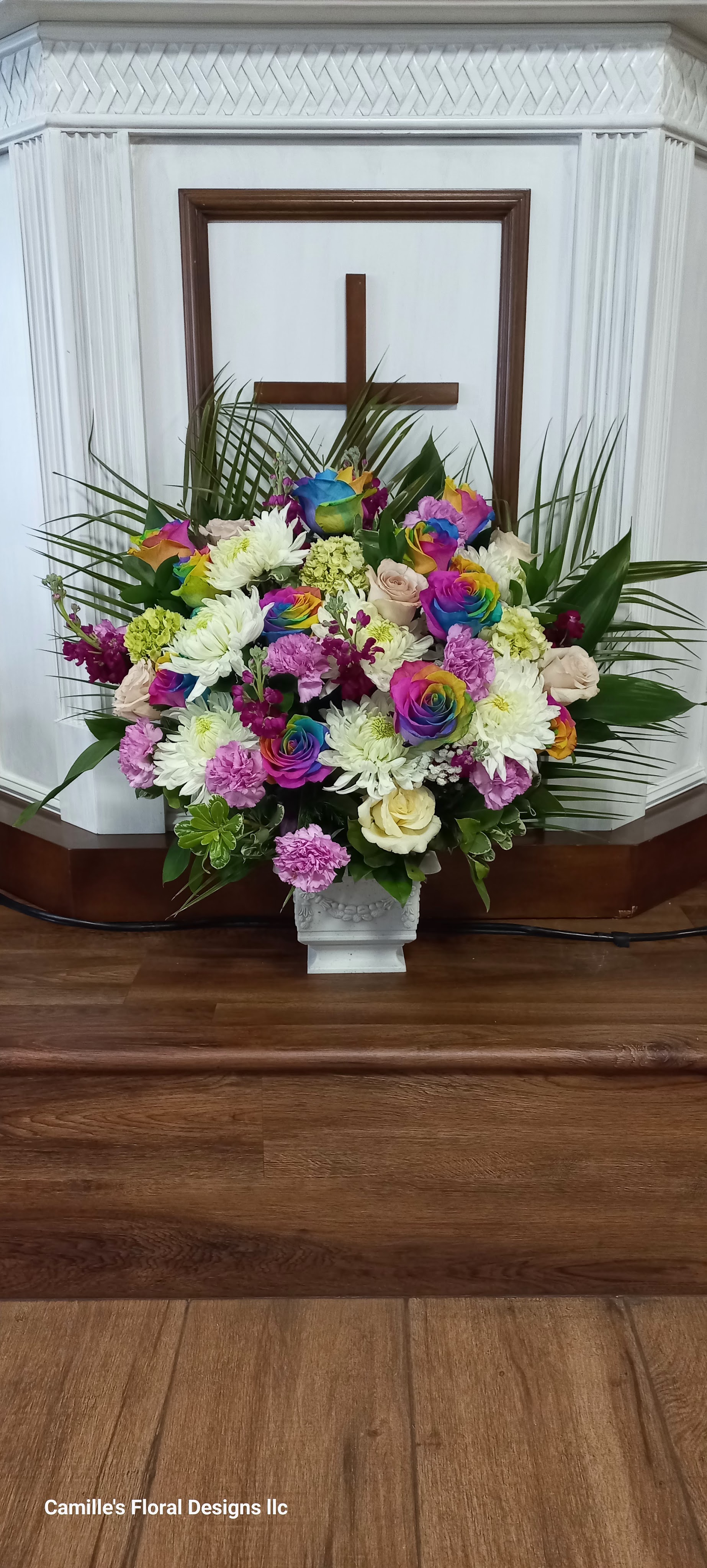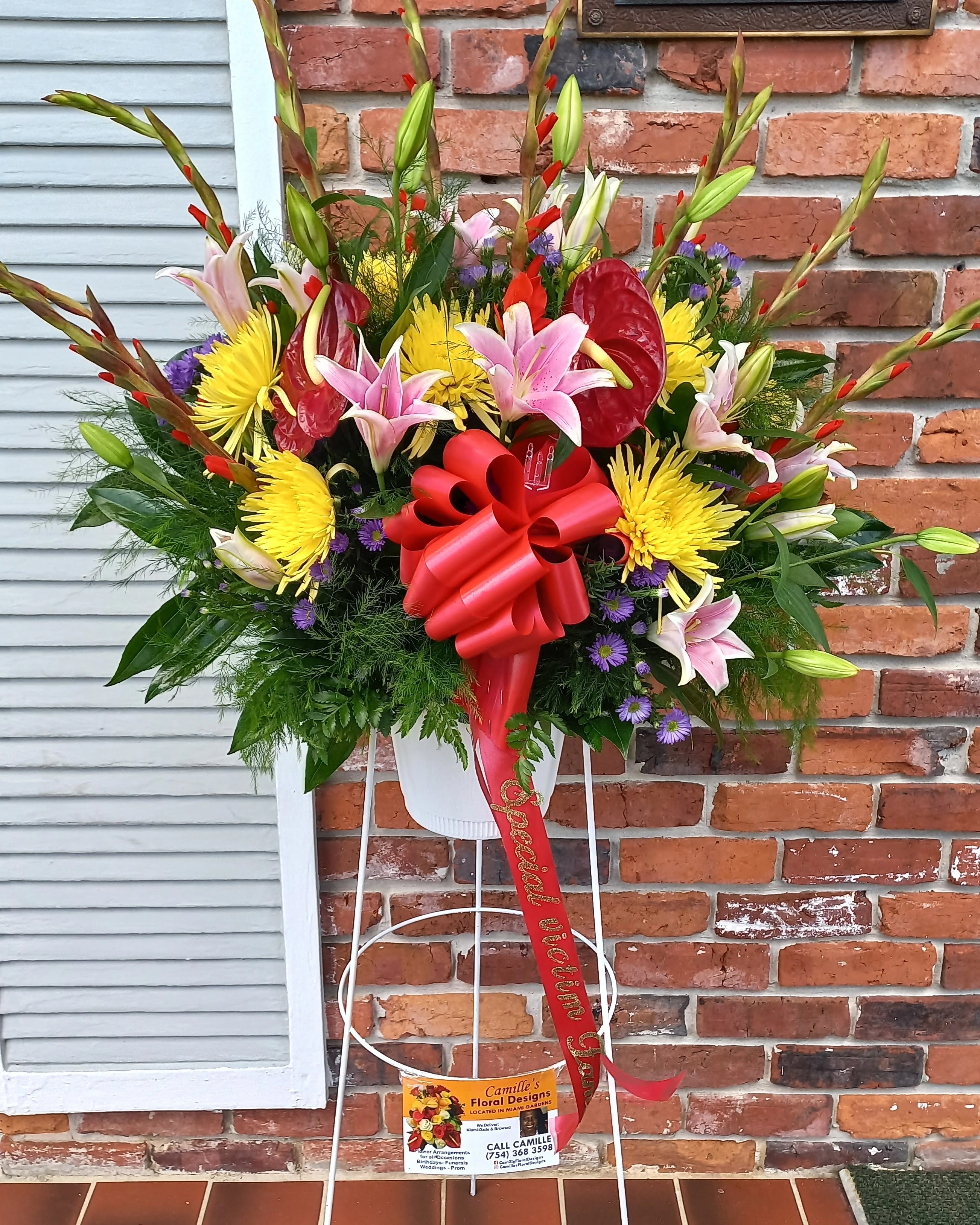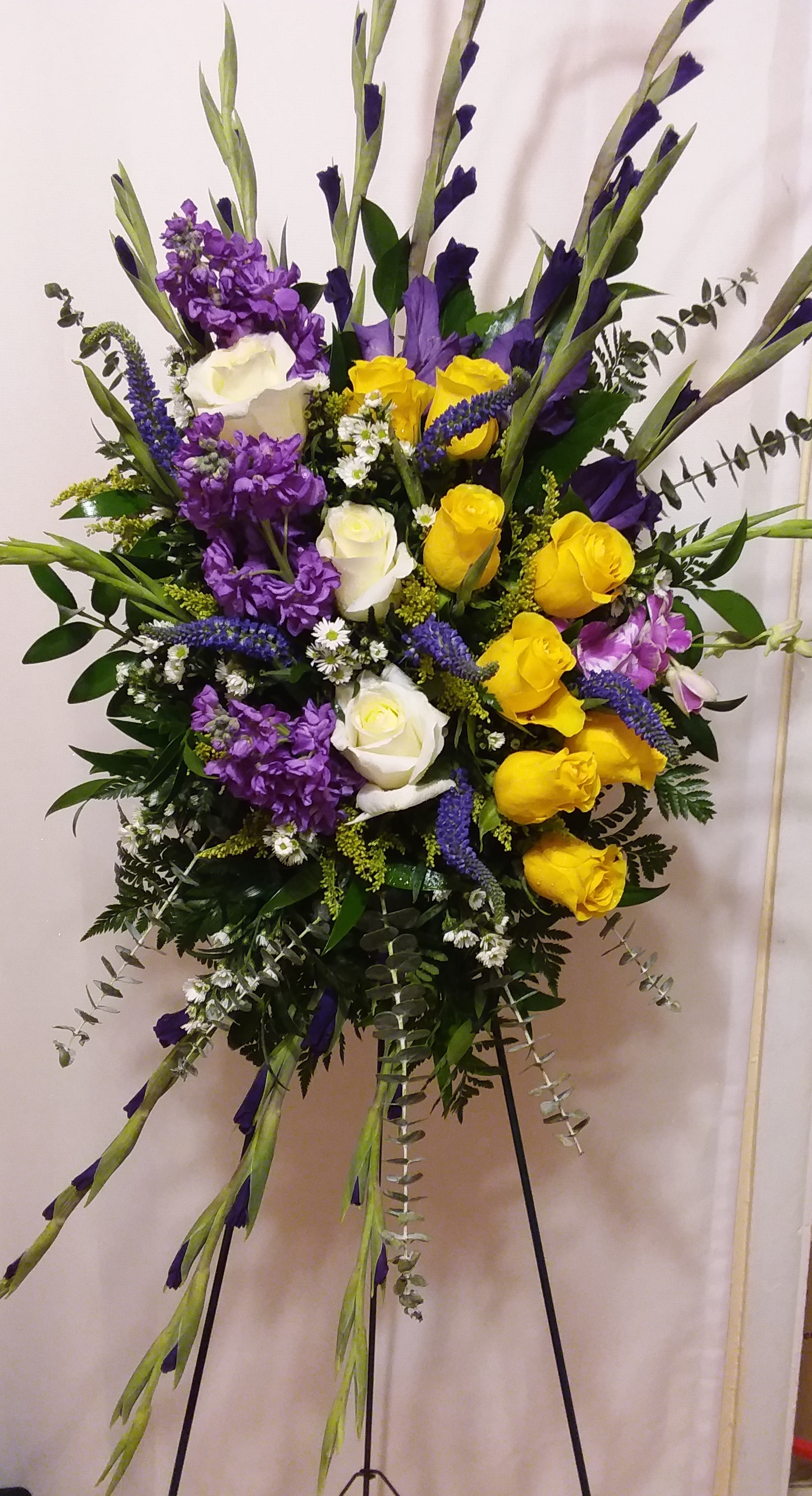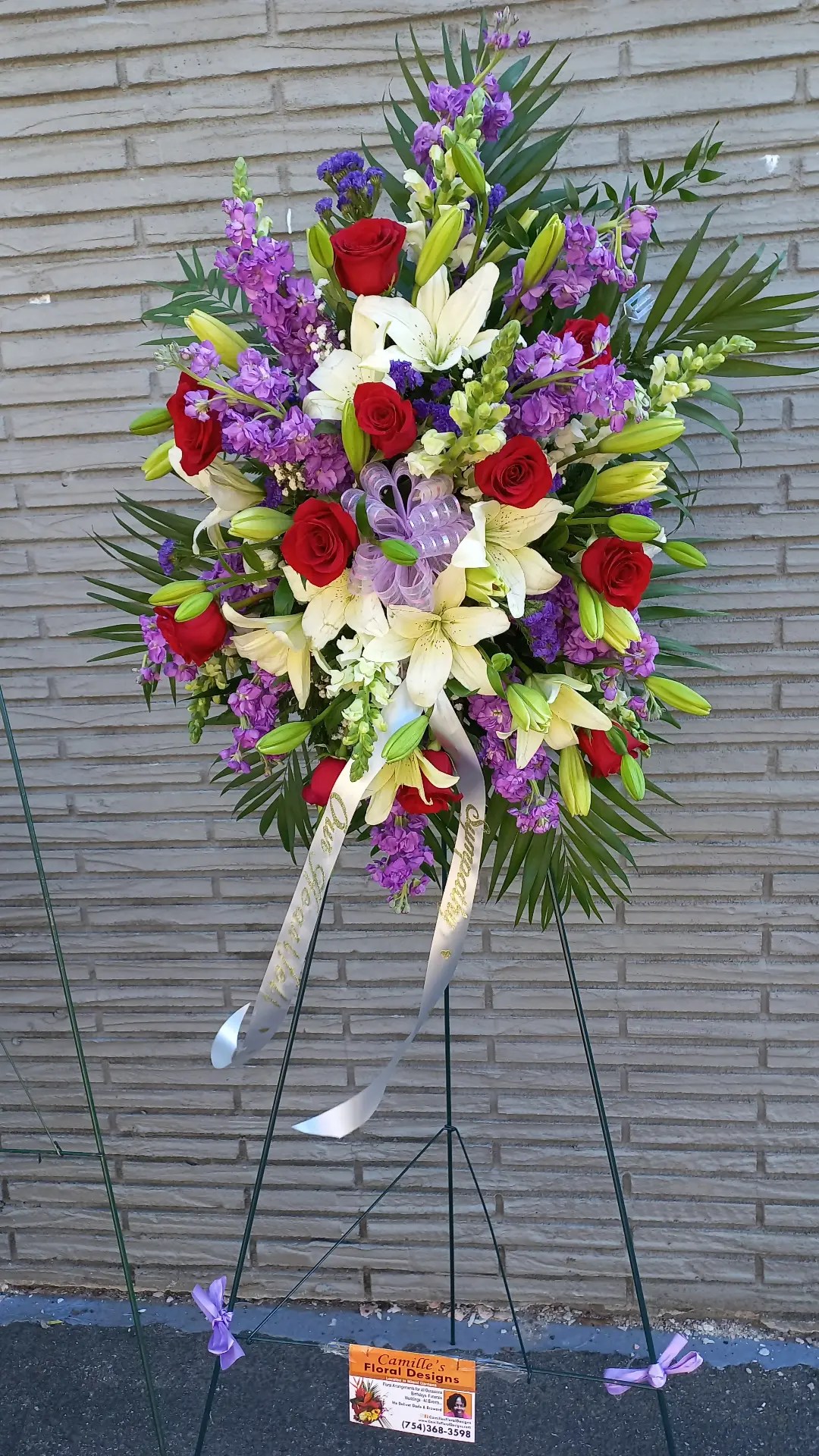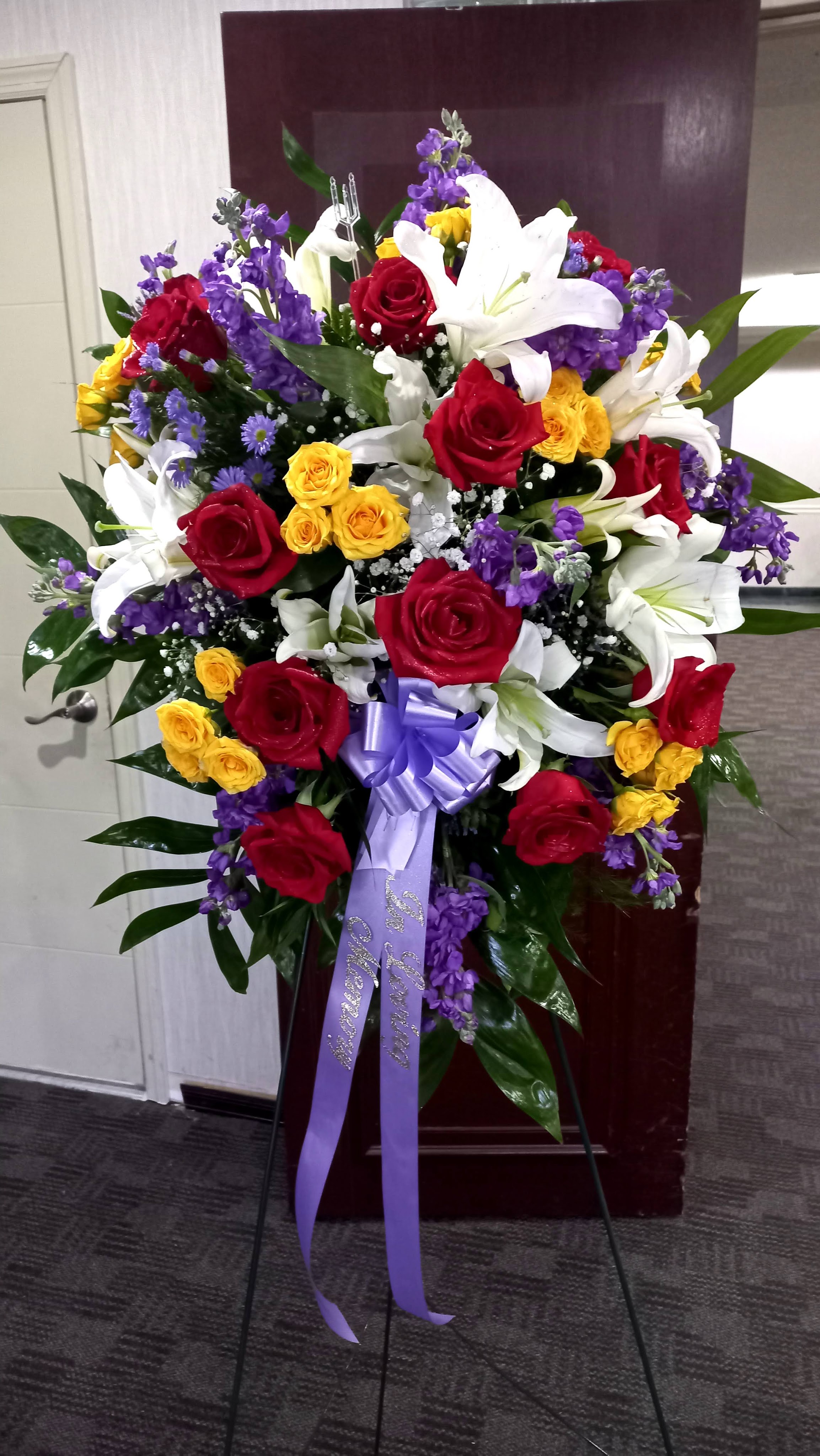 This colorful standing spray features, red roses, purple stock, yellow roses and white roses lifts the mood in the room and create a great trbute. We deliver to Miami-Dade and Broward Counties. Price includes taxes and delivery fees. Order on time withinn 24 hours