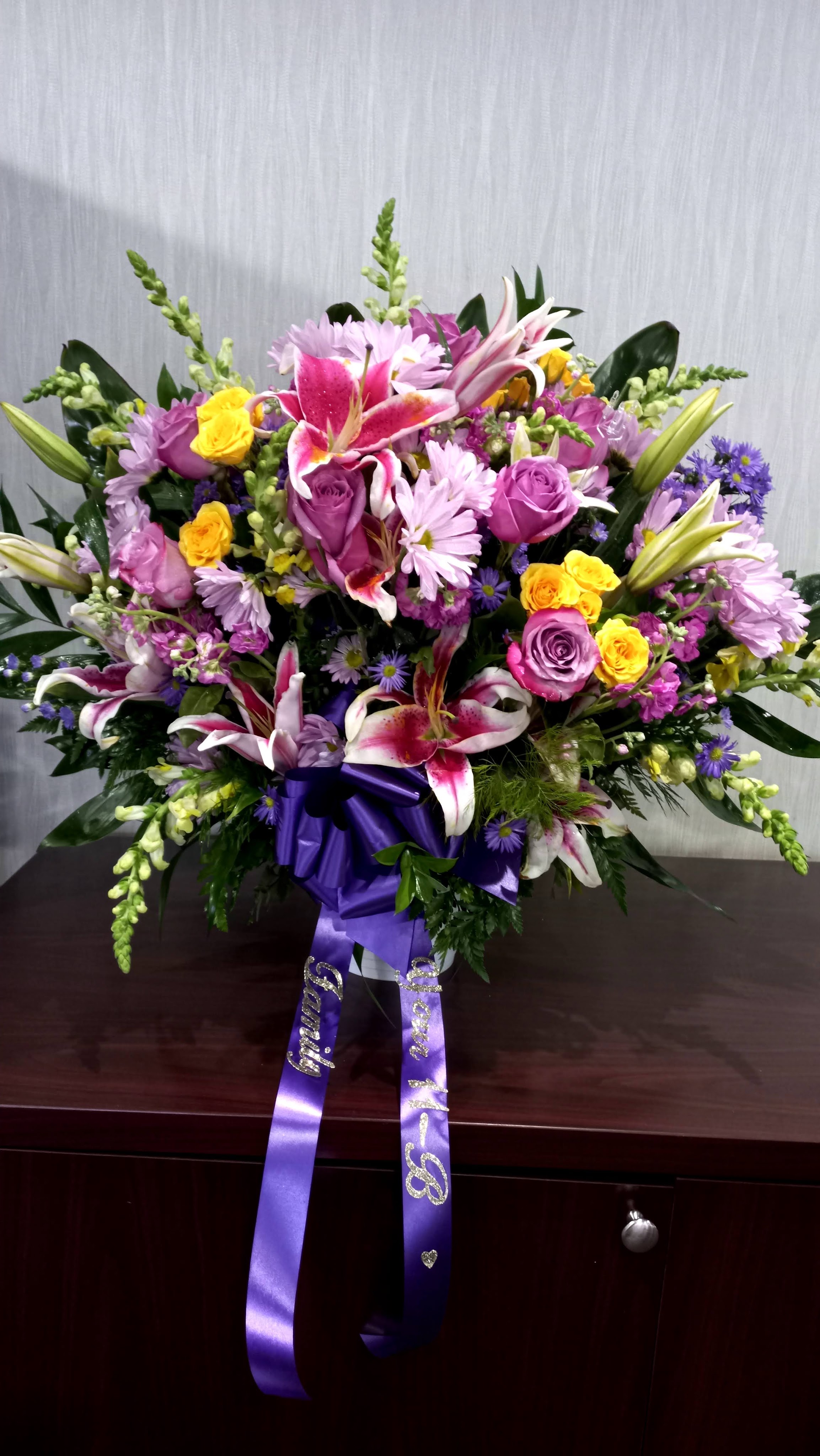 This beautiful Standing spray features pink Asiatic lillies, purple stock, purple roses, purple mums. Stand included. Price includes taxes and delivery fees. We deliver to Miami-Dade and broward counties.