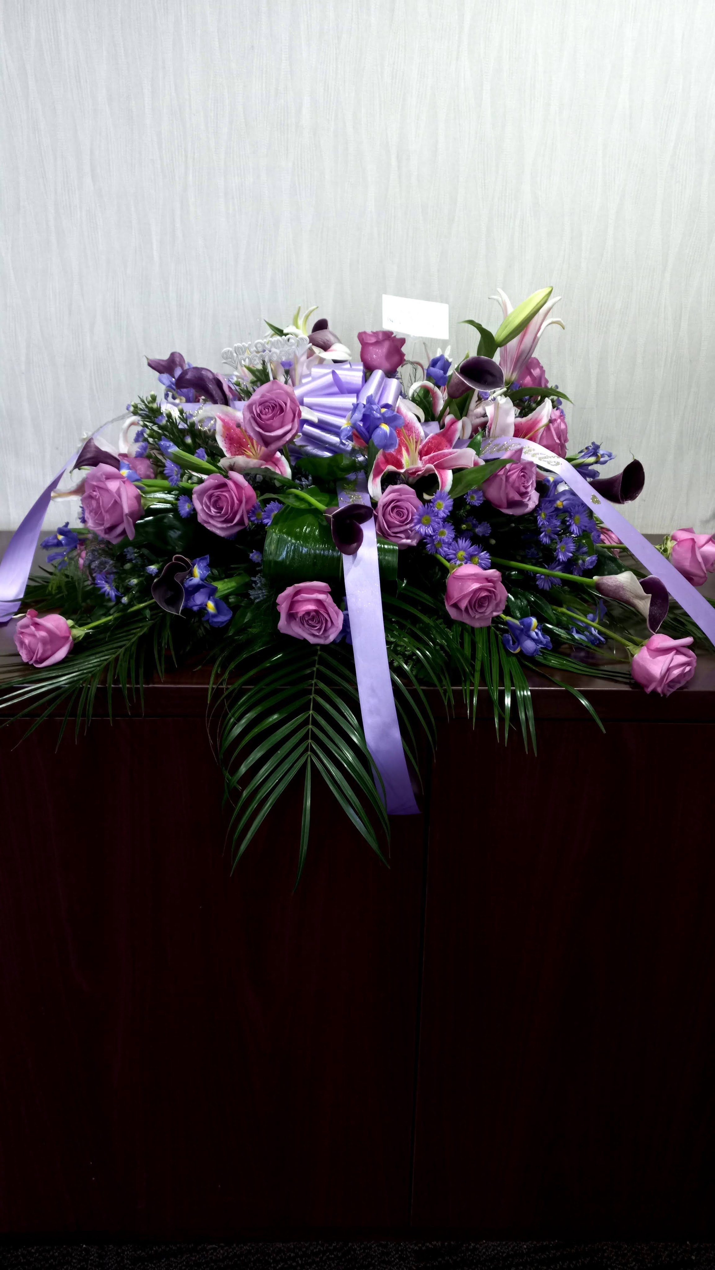 This casket spray says it all when you are expressing your love for your loved one that passed. This beautiful lavender mixed casket spray features, Irises, lavender roses, pink lilies, purple mini calla lilies, Our price includes taxes and delivery fees. We deliver to Miami-Dade and Broward Counties.