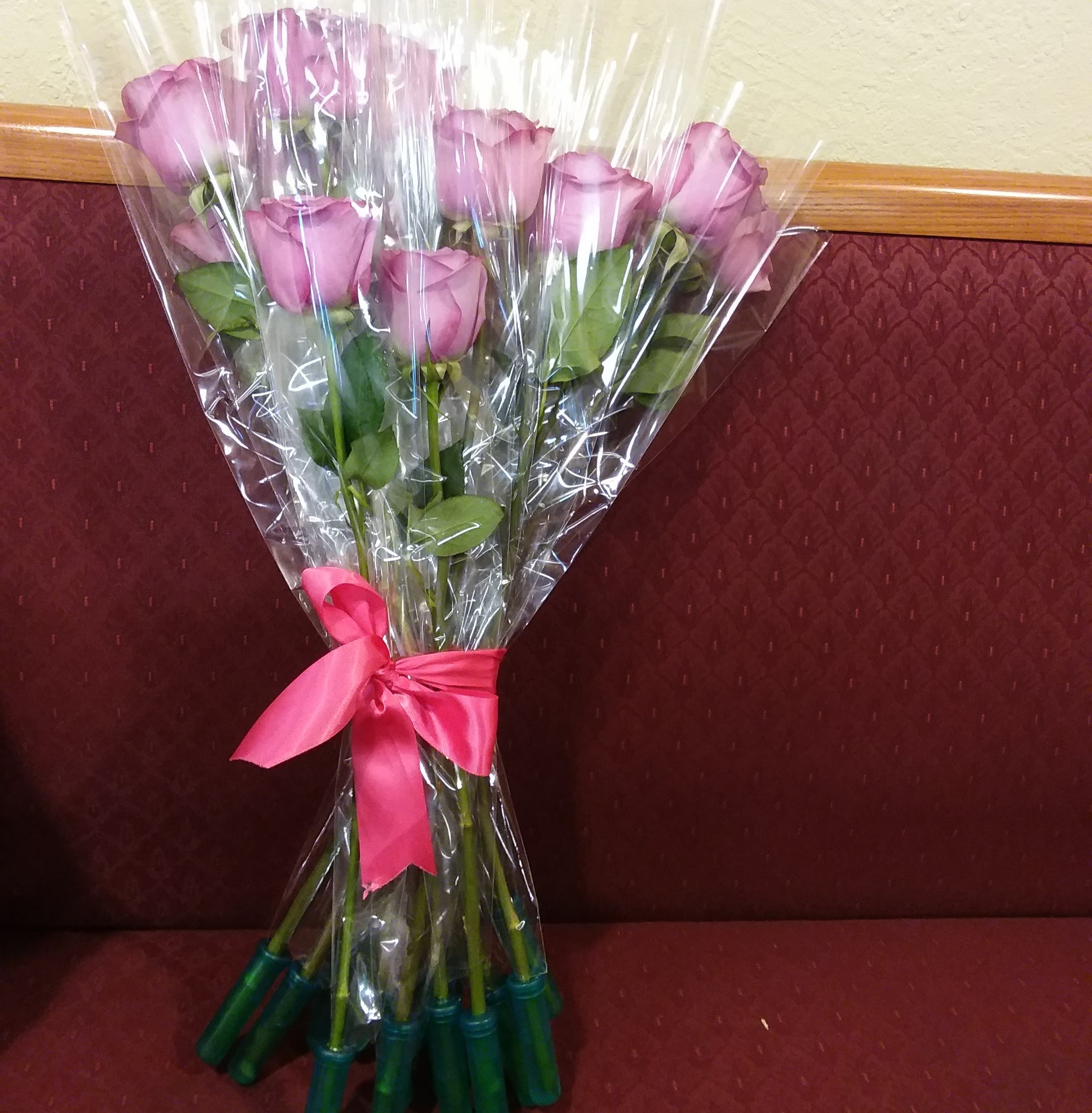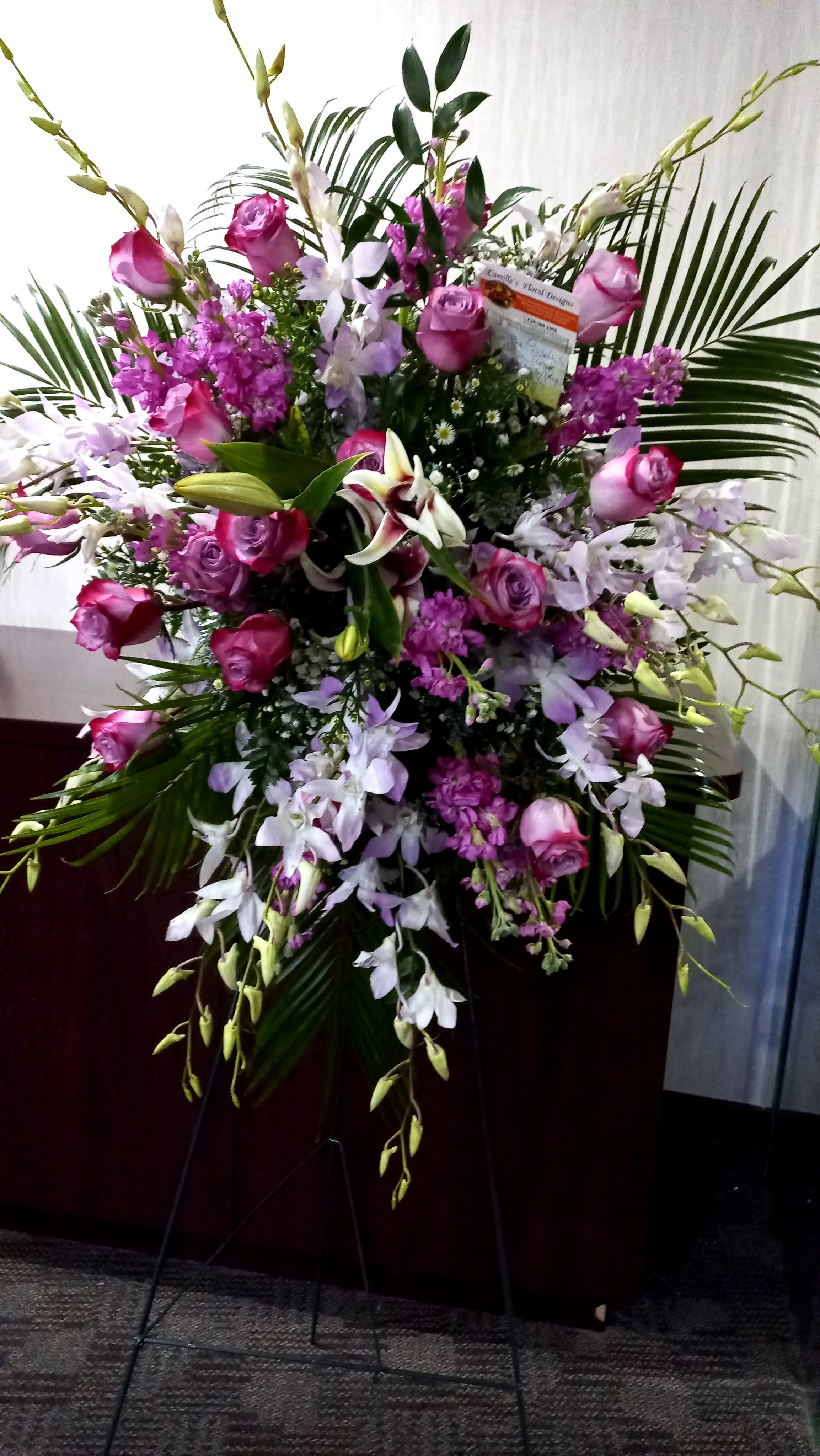 This beautiful standing spray features pink stock, purple lavender roses, lavender and white dendrobium orchids, lily, mixed greens. price includes taxes and delivery fees. We deliver to Miami-Dade and Broward Counties.