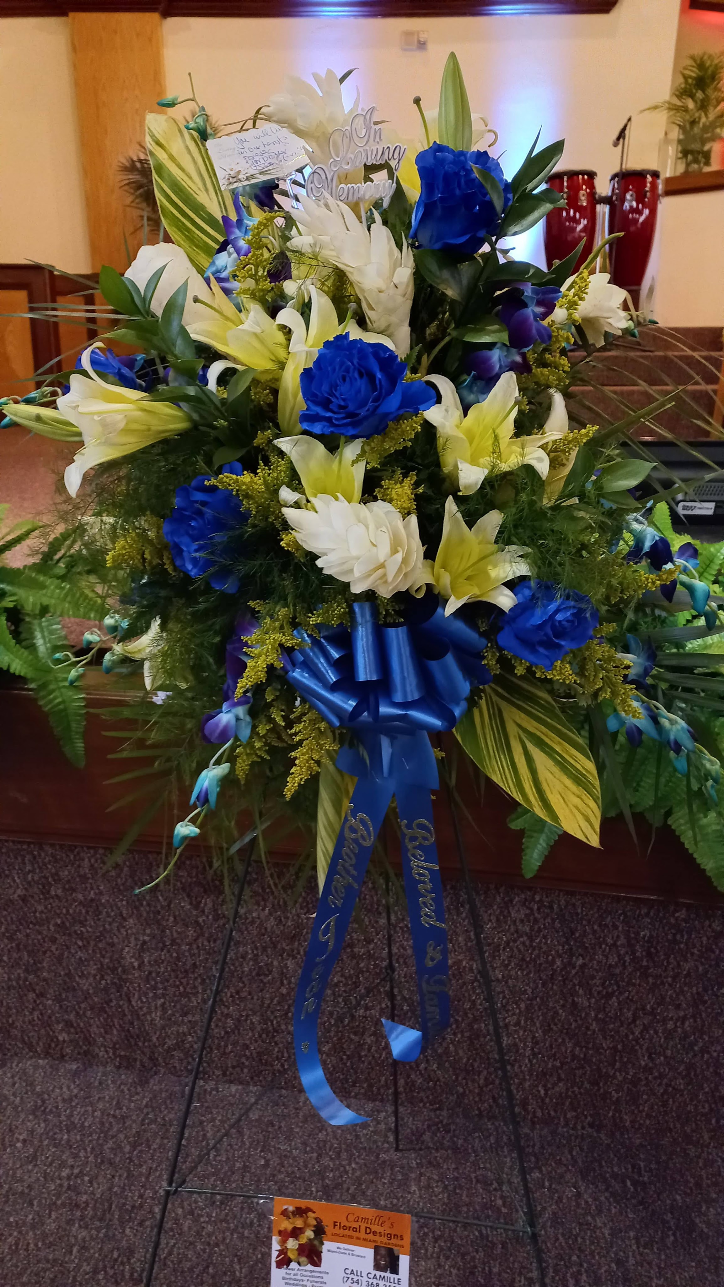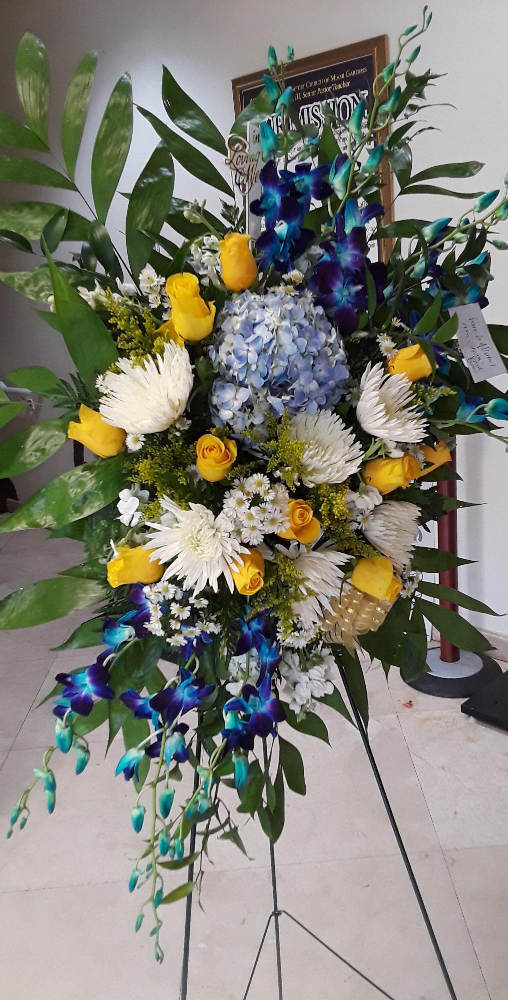 This beautiful standing spray capture your memories from the heart. It features white ginger, light yellow lilies, royal blue roses, blue purple orchids, yellow varigated tea leaves, nestled in solidago, and mixed greens. Price includes taxes and delivery fees. We deliver to Miami-Dade and broward counties.
