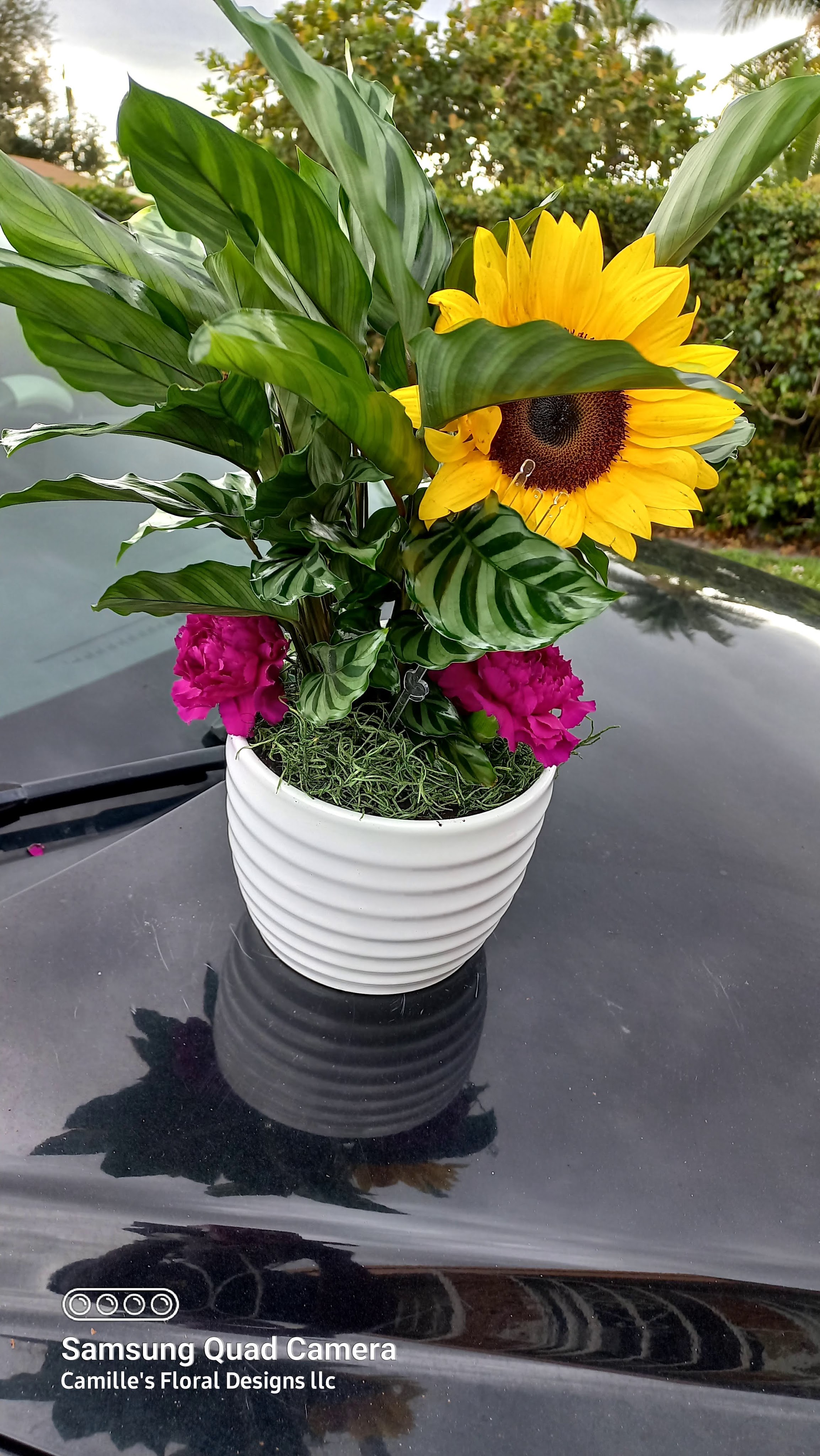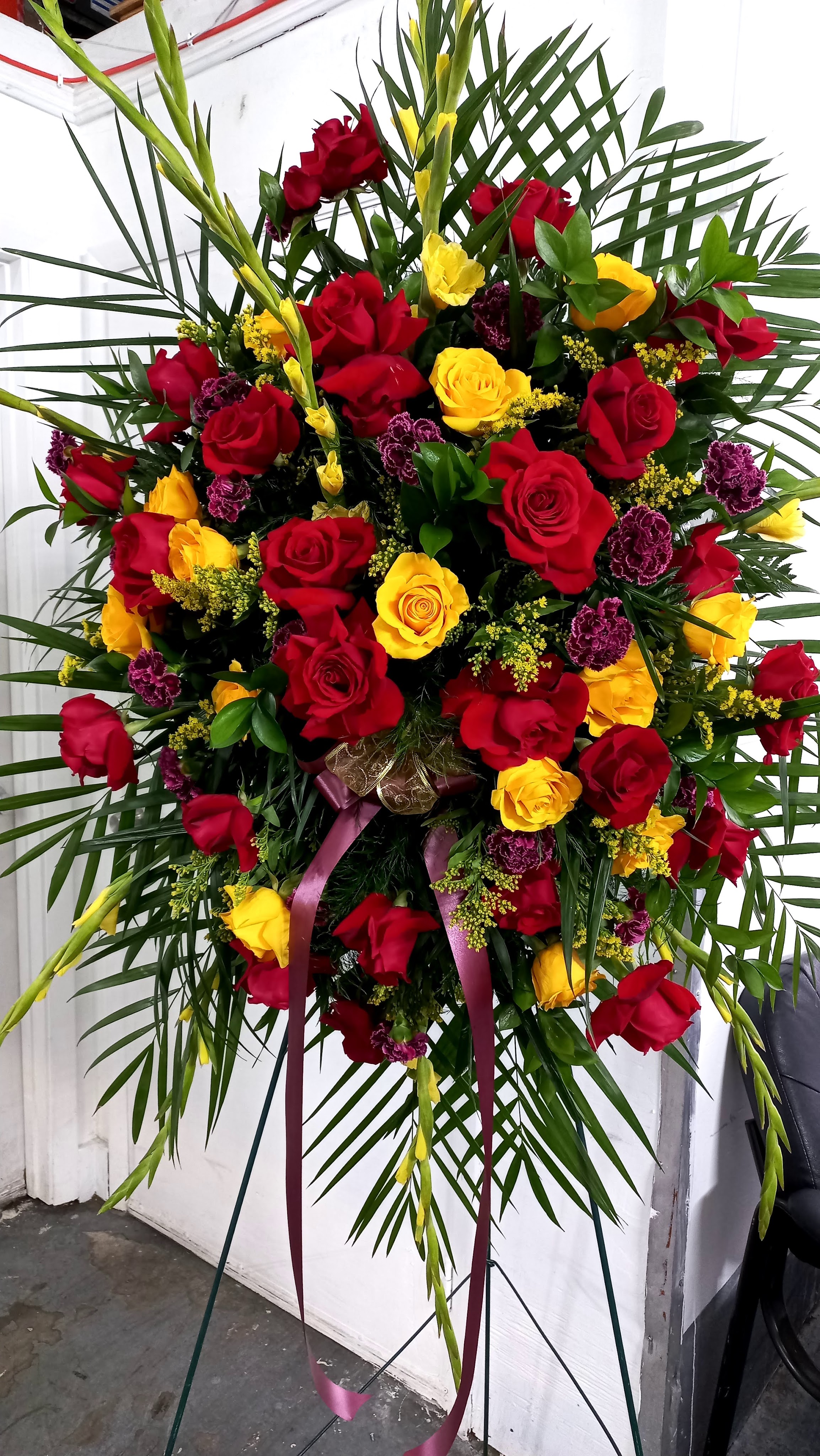 This ex-large rose standing in features red and yellow roses and burgundy carnations nestled in palm leaves, ruscus greens and leather leaves. Price includes taxes and delivery fees. We deliver to Miami-Dade and broward counties.