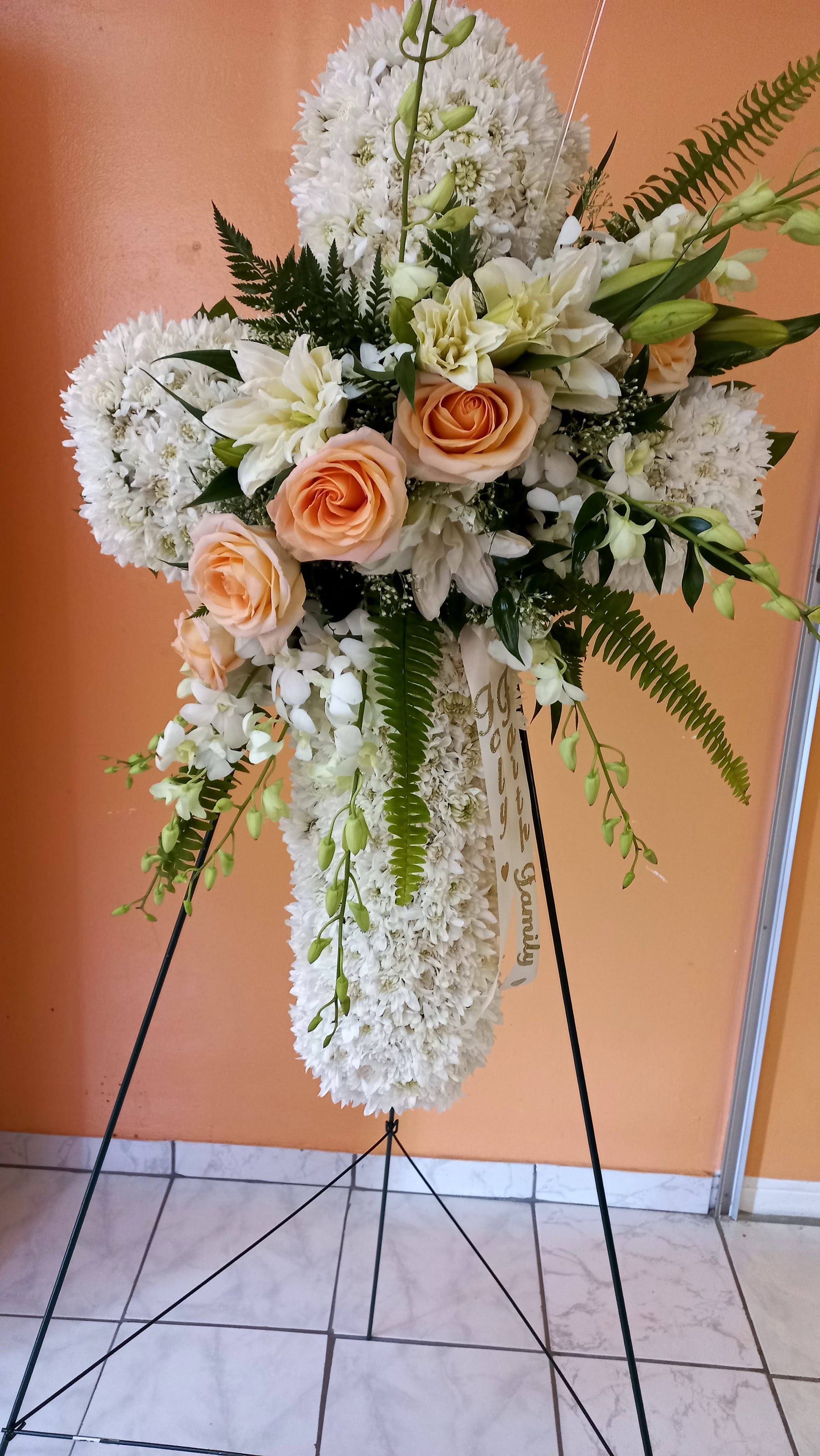 This beautiful large standing spray cross stands 5.7 features peach Equadorian roses, white lilies, white dendrobium orchids nestled in lush greens. Price includes taxes and delivery fees. We deliver to Miami-Dade and broward counties