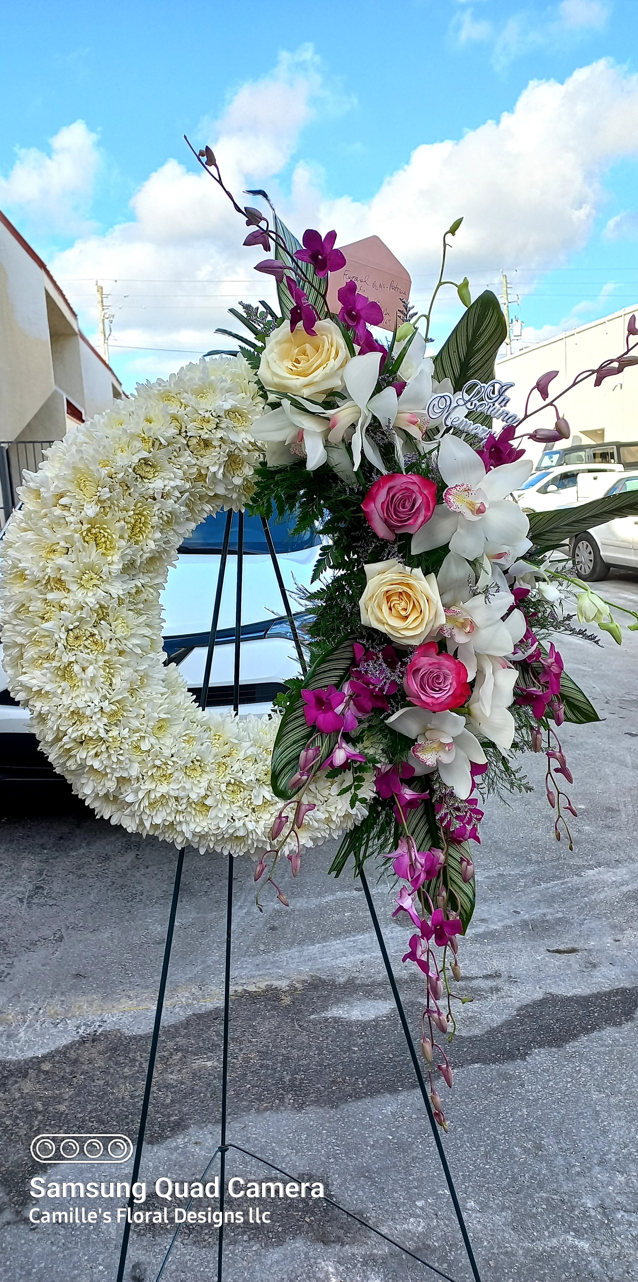 This beautiful large cross is an expression of love and appreciation for your loved one. It features white cremons, white carnations, pink roses pink orchids white Cynbidium Orchids, , nestled in mixed. We deliver to Miami-Dade and broward counties. Price includes taxes and delivery fees