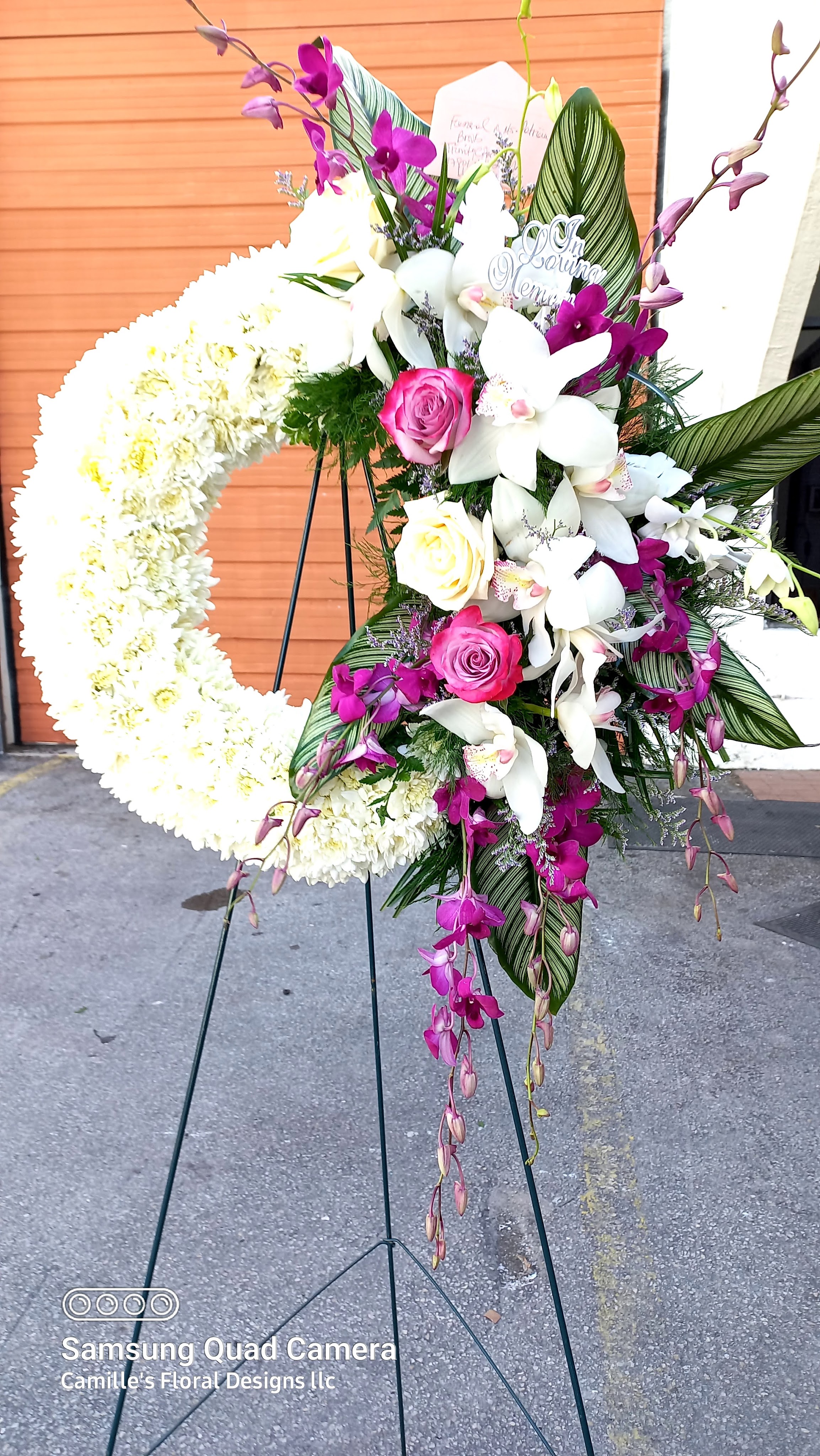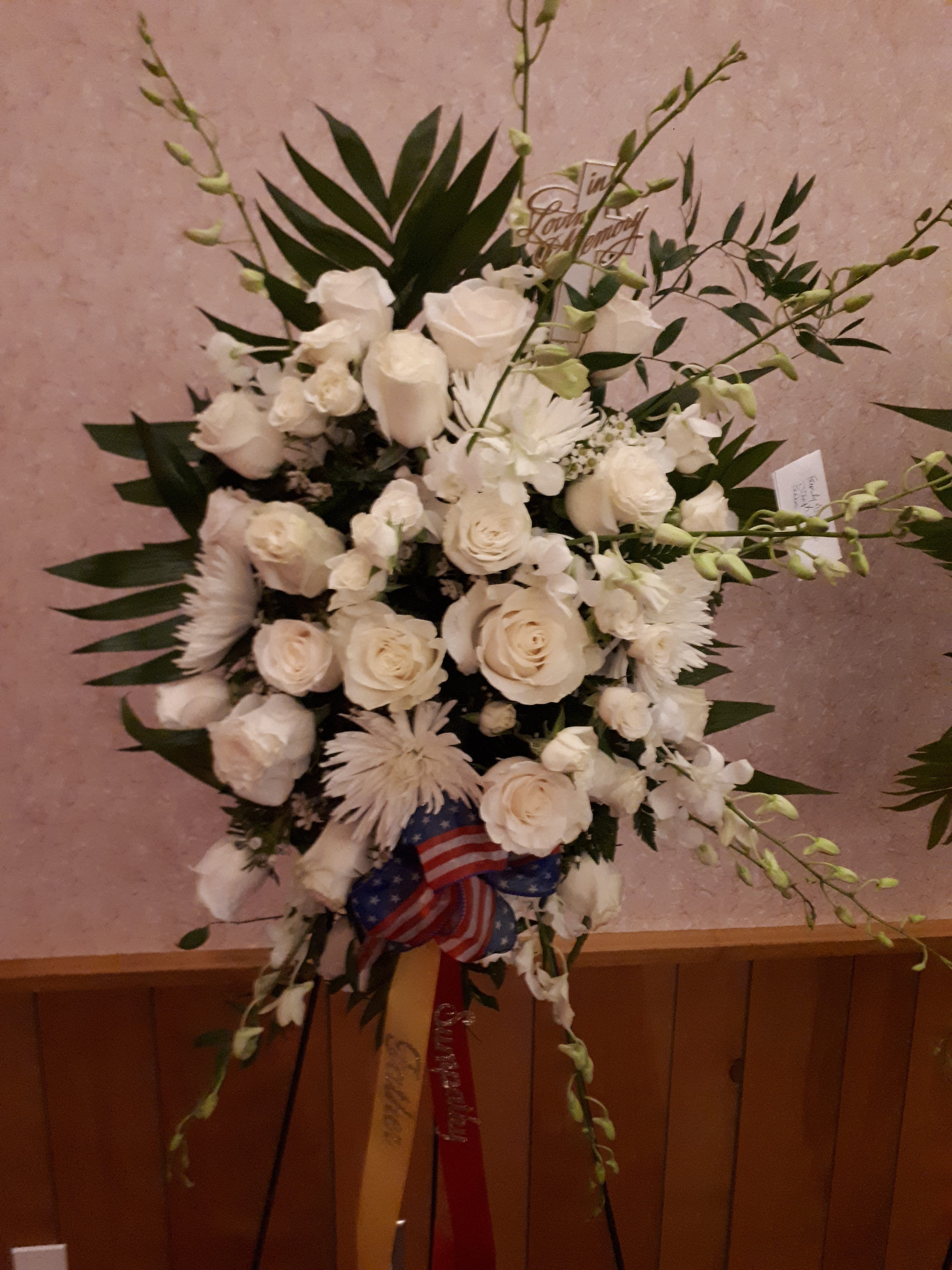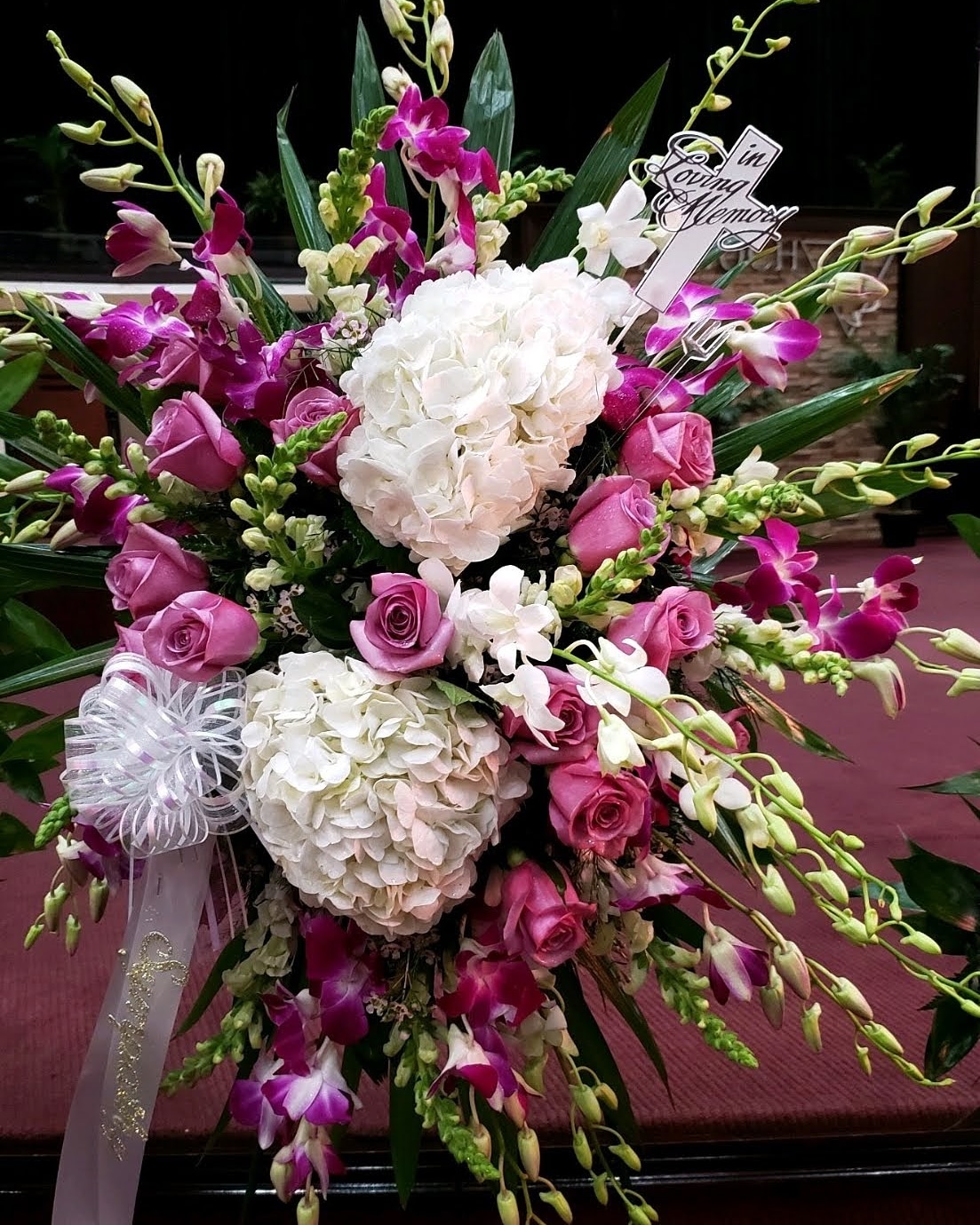 Express your condolences to the memory of your friend or loved one with this beautiful Sympathy Standing spray it features pink roses, white hydrangeas, pink bom bom dendrobium orchids,white orchids and white snapdragons nestled in mixed greens with wax flowers. We deliver to Miami-Dade and broward counties. Delivery fees included