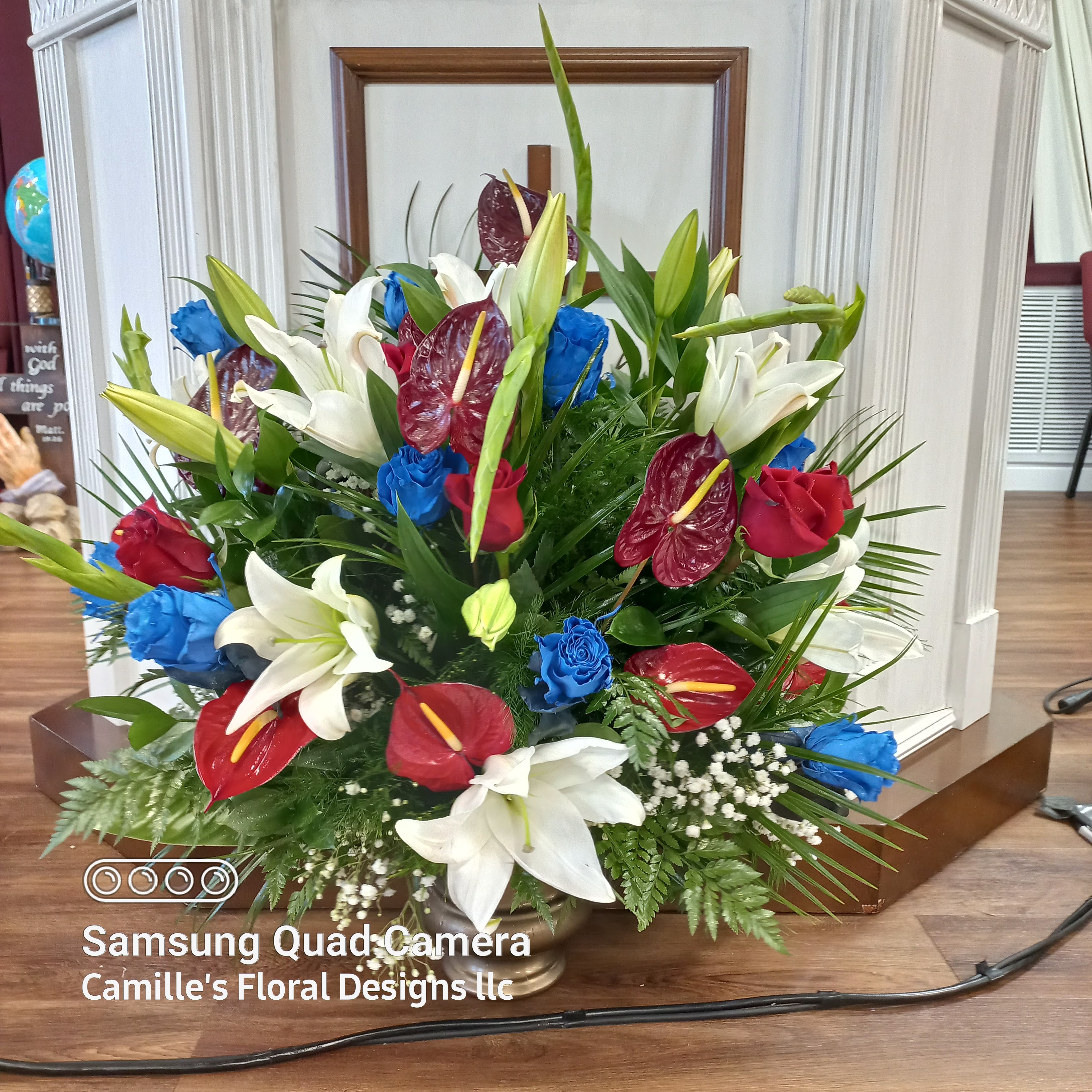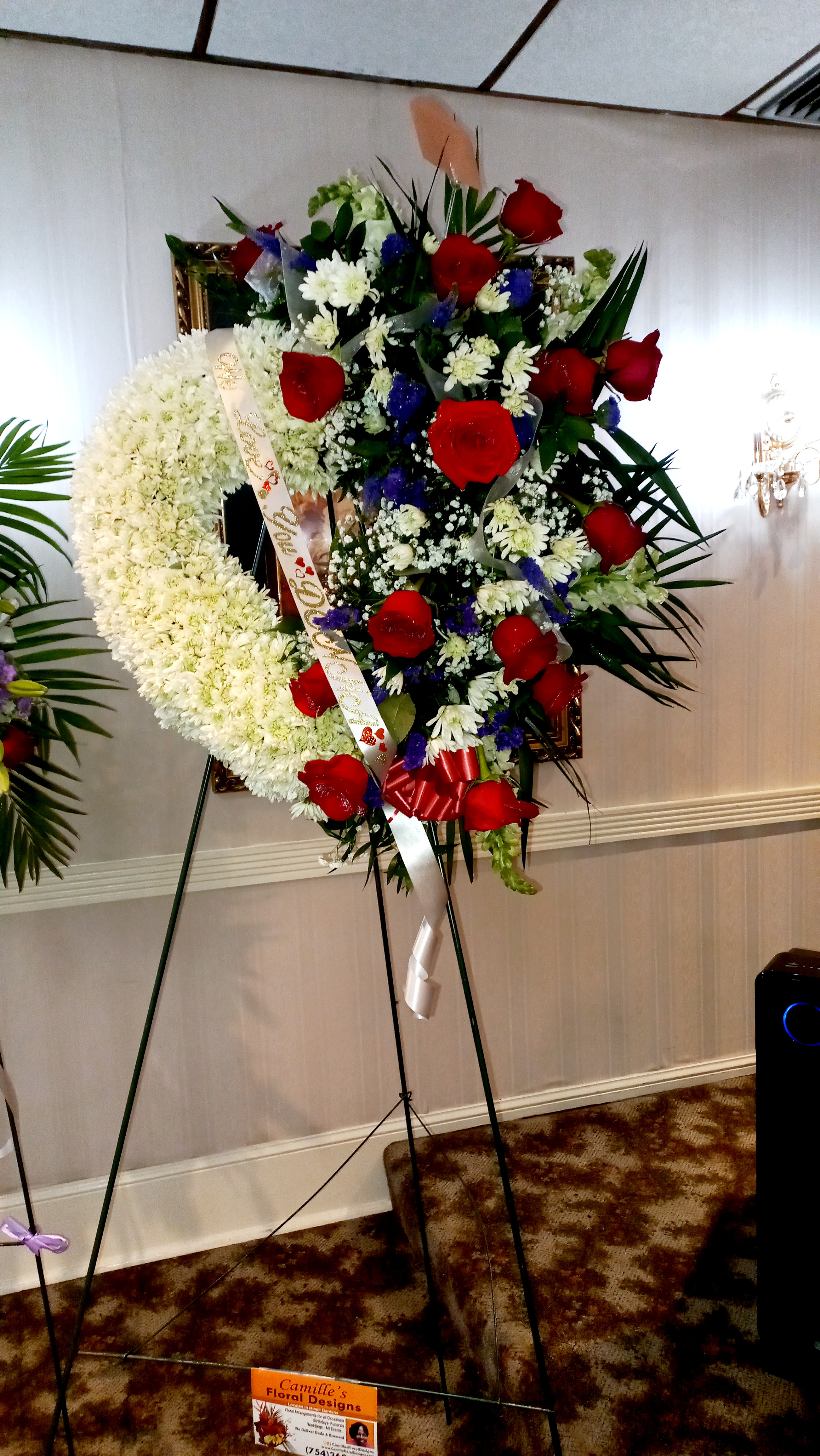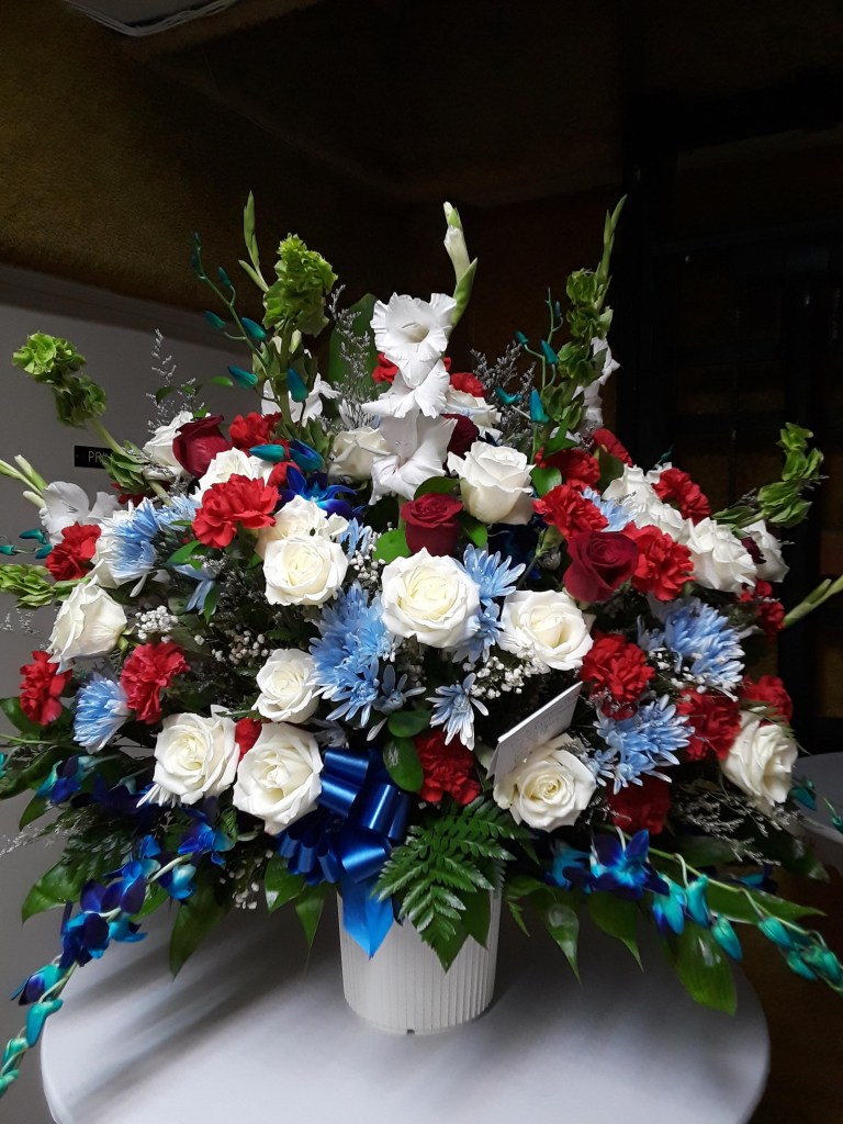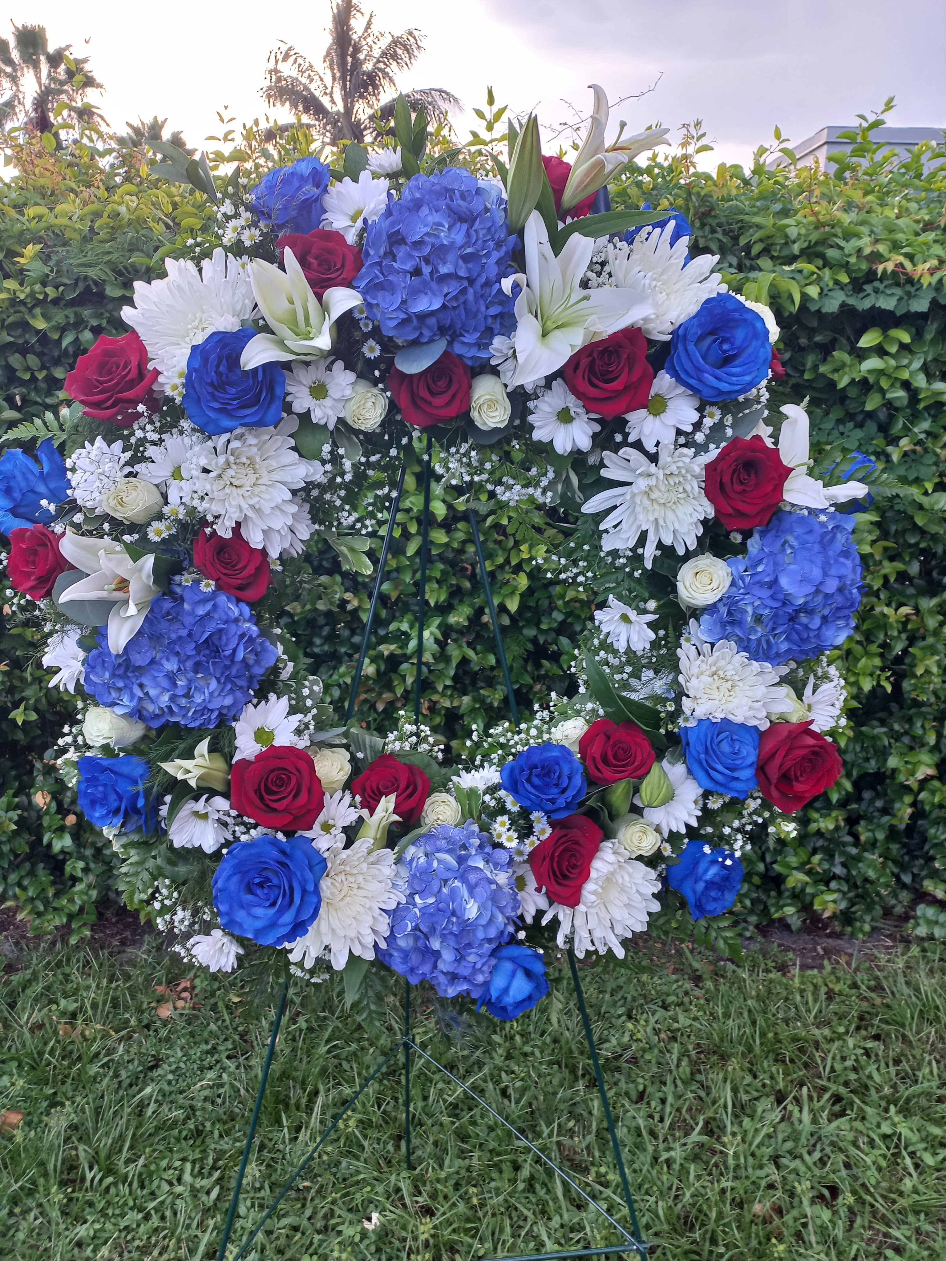 This beautiful wreath can be a celebratory one. It can be used for memorial services, it features red, blue and white colors to reflect service and respect., favorite colors Price includes taxes and delivery fees. We deliver to Miami-Dade and broward counties