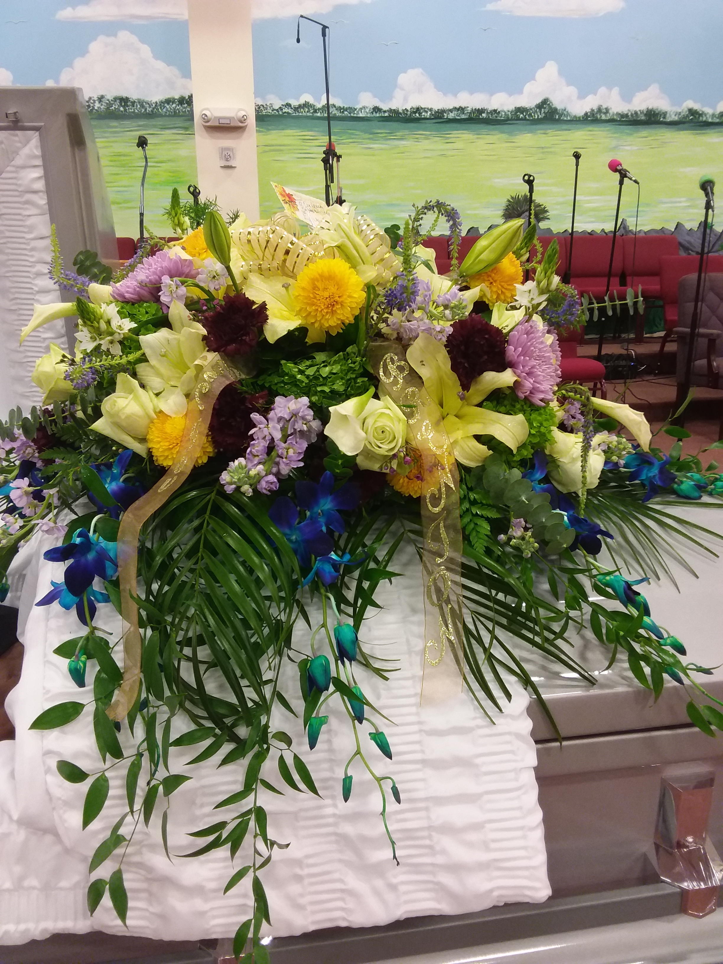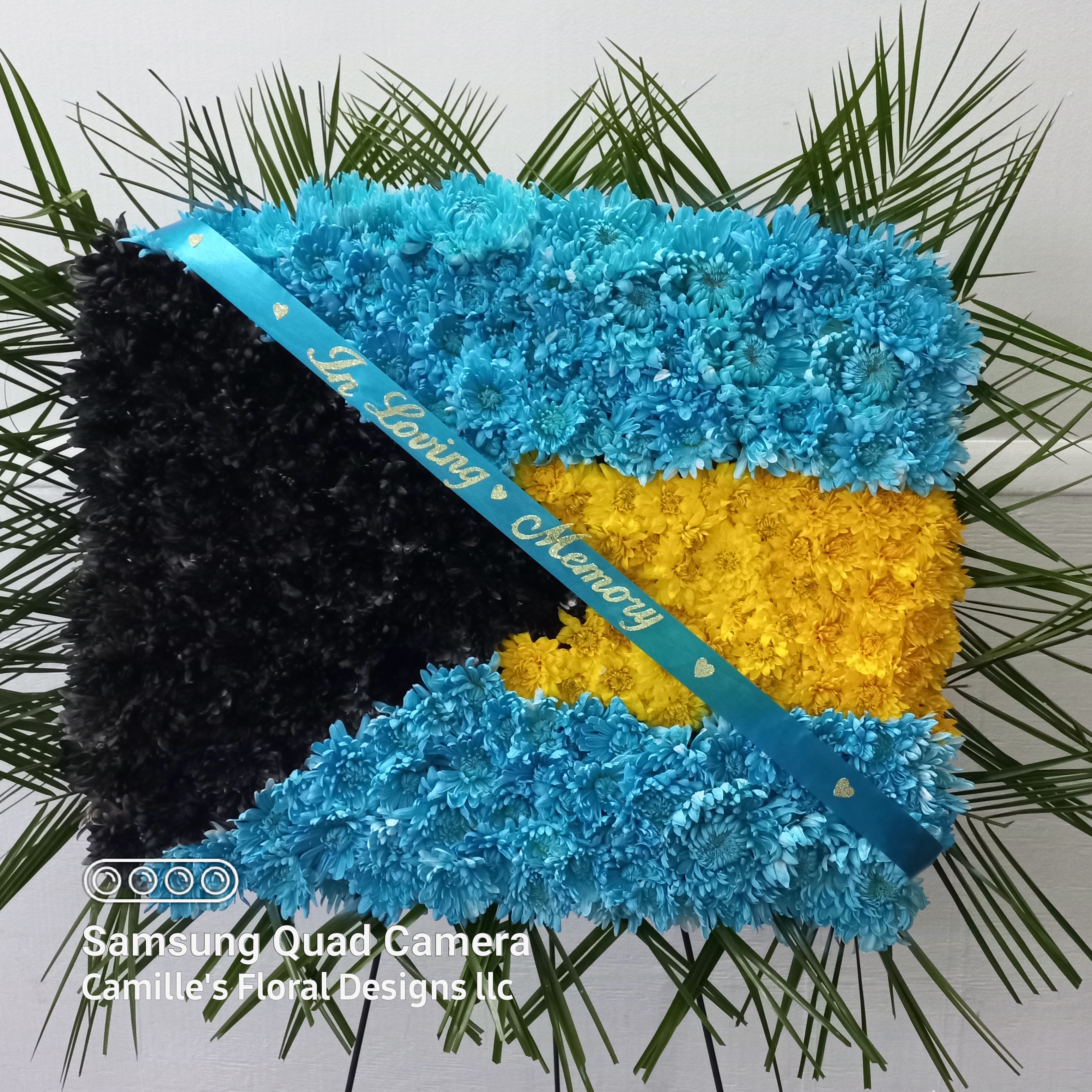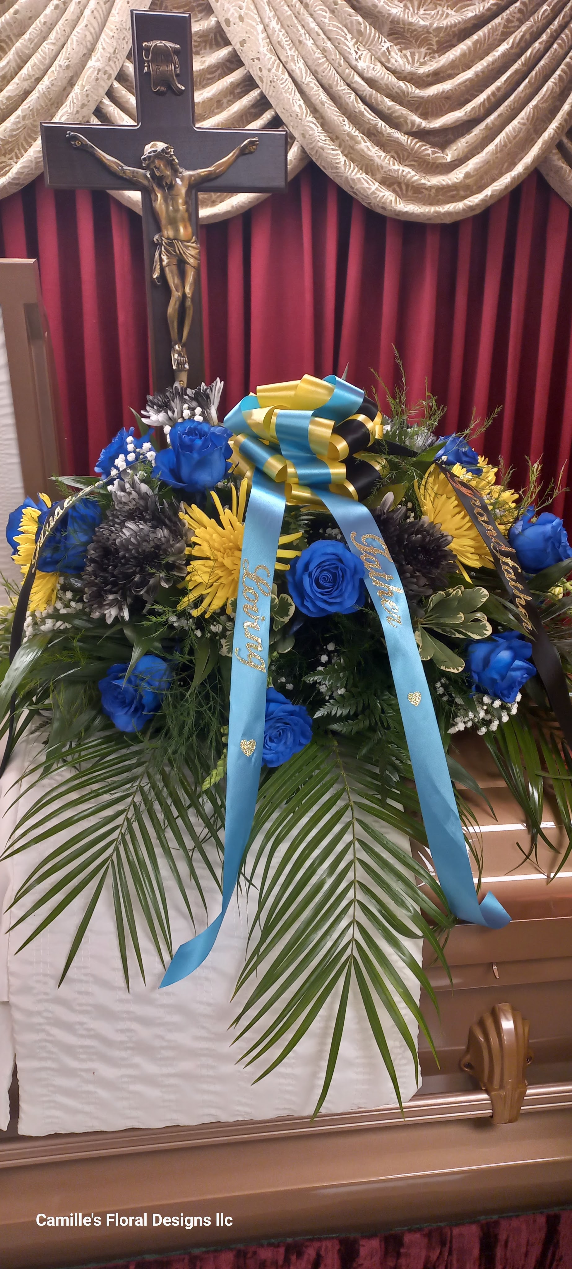 This beautiful standard size casketspray celebrate 🇧🇸 the Bahamanian culture with its our personalizedribbon. We will personalize your loved culture. This arrangement features blue roses, yellow spiders, black chrysanthemums. Price includes taxes and delivery fees. We deliver to Miami-Dade and broward counties.