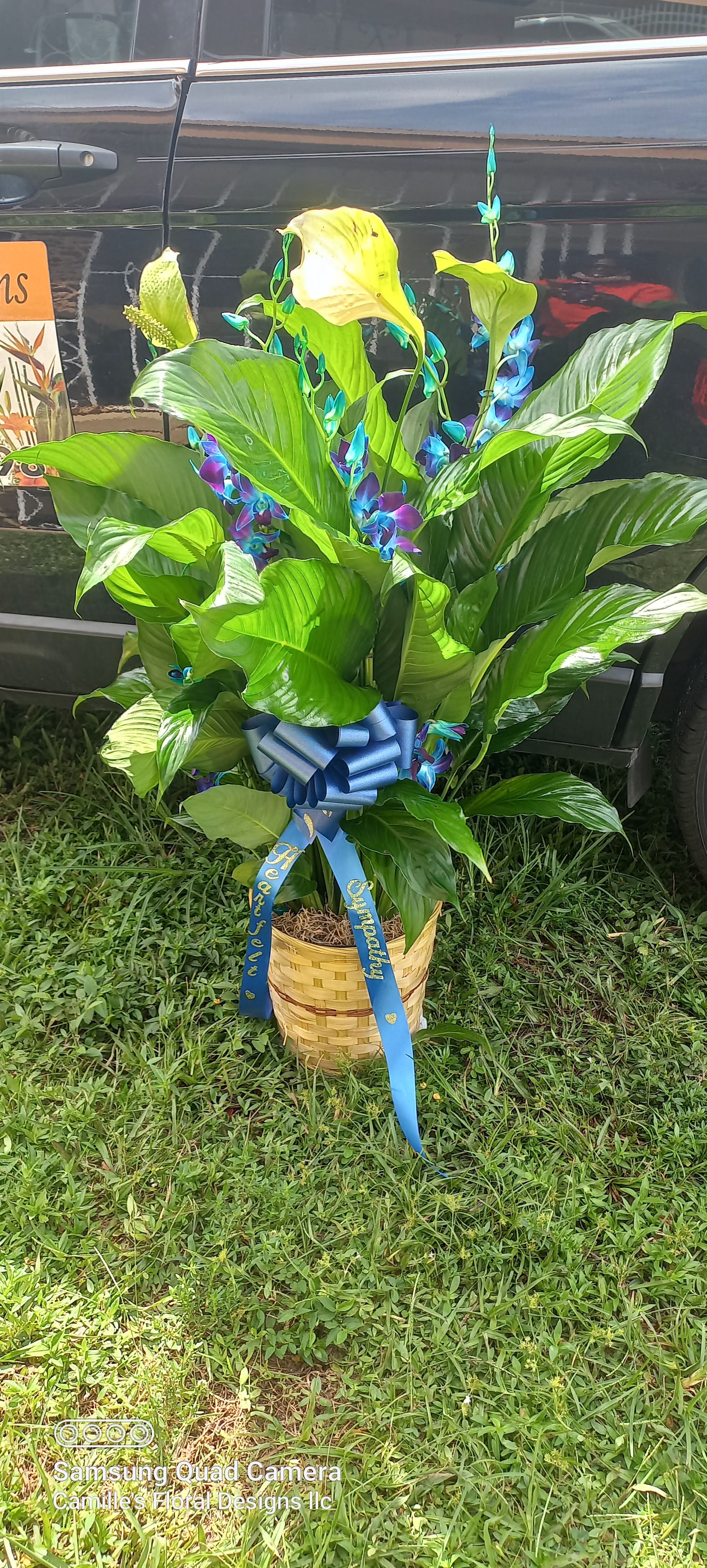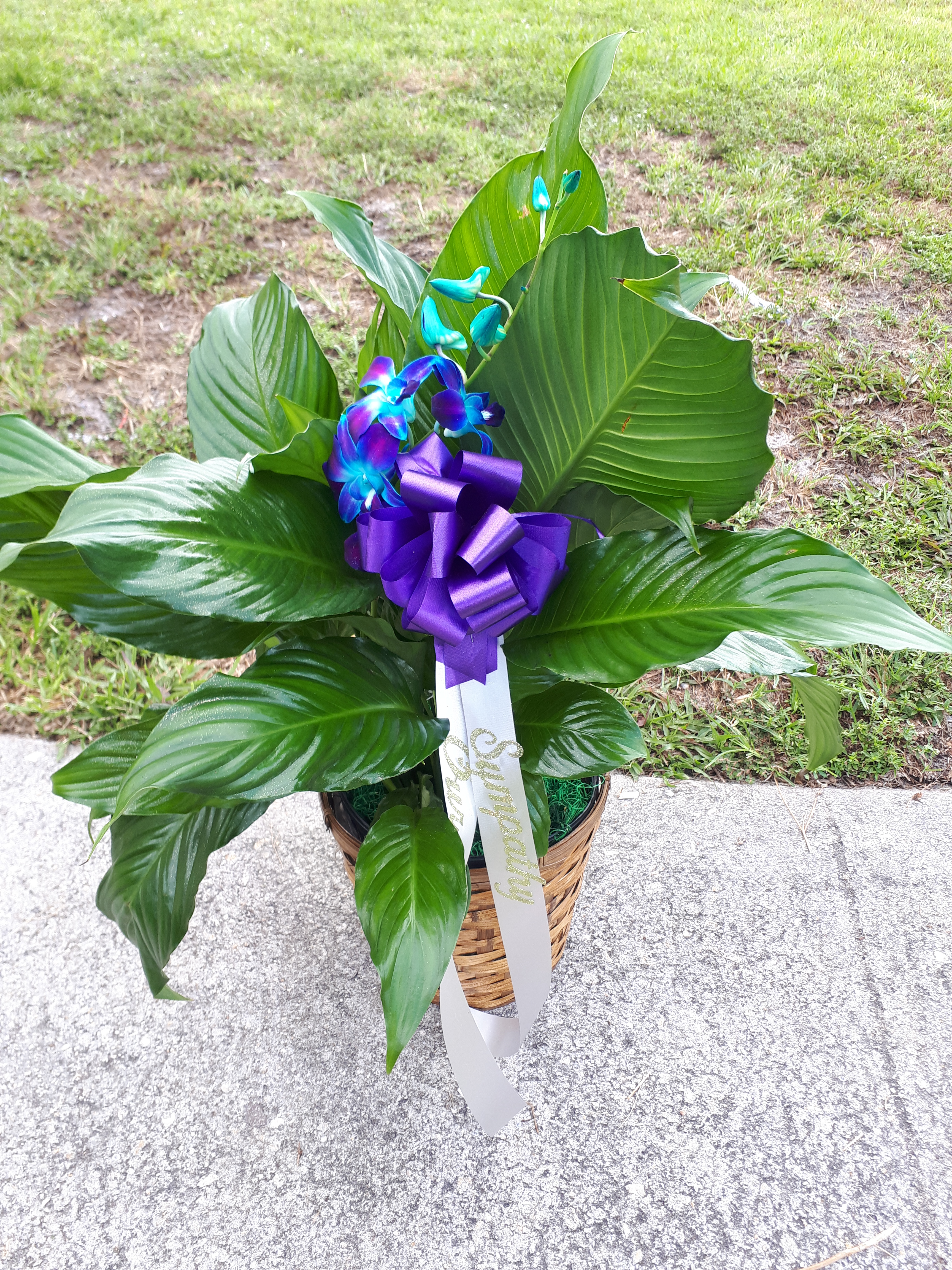 this beautiful healthy peace Lily Sympathy plant beautifully accented with the decased special colors of purple ribbon and blue orchids represents royalty. price include delivery. we deliver to Miami-dade and Browsed counties