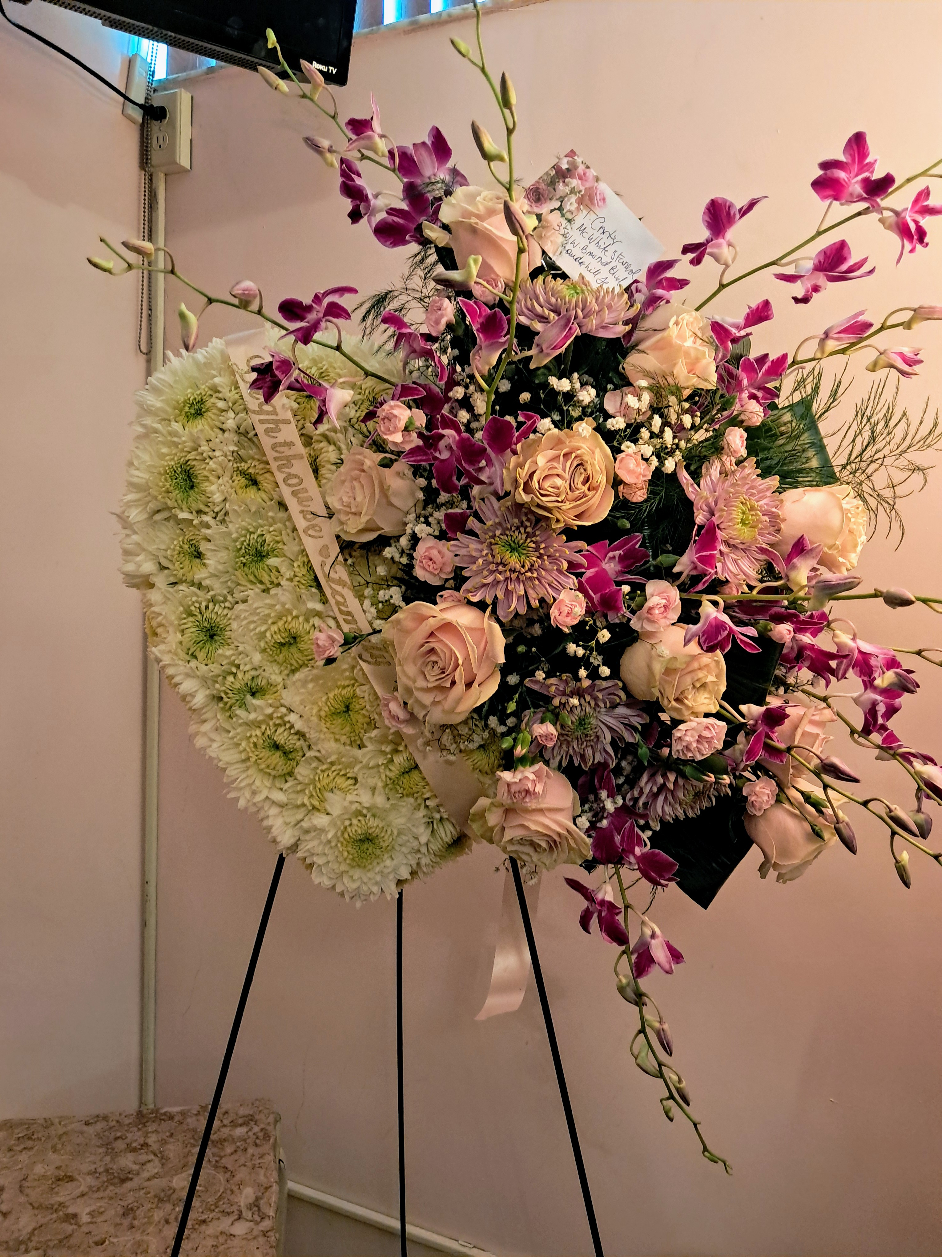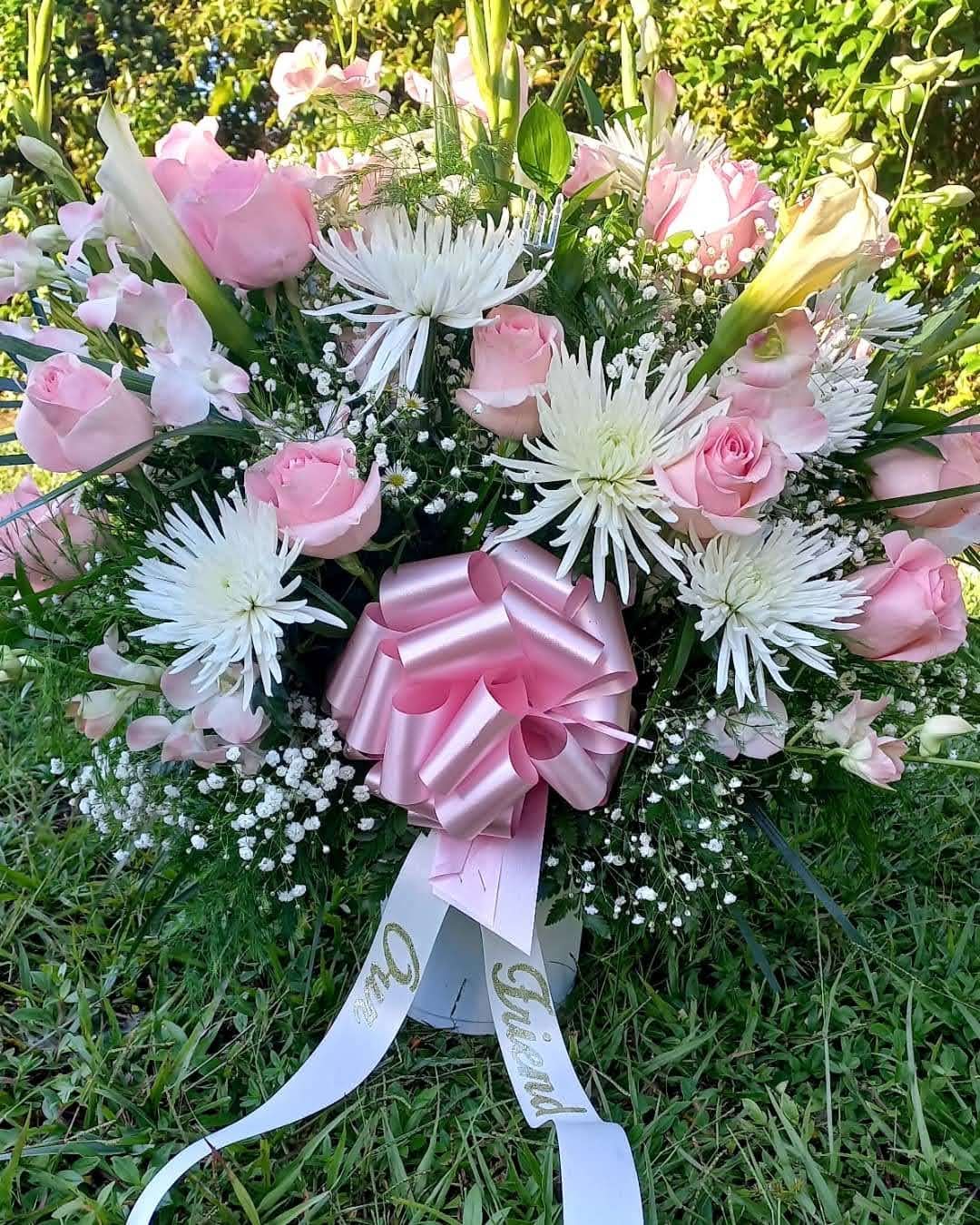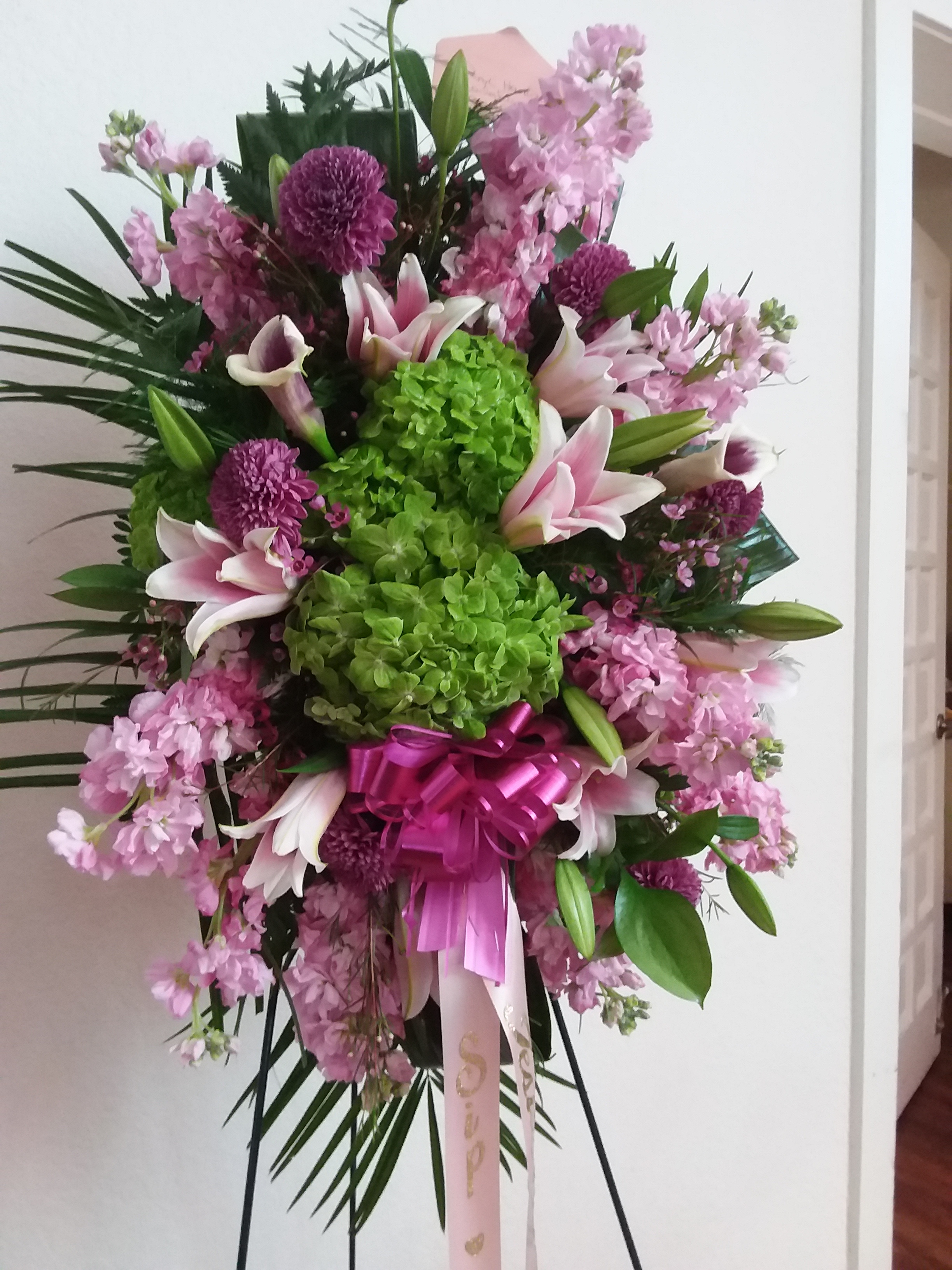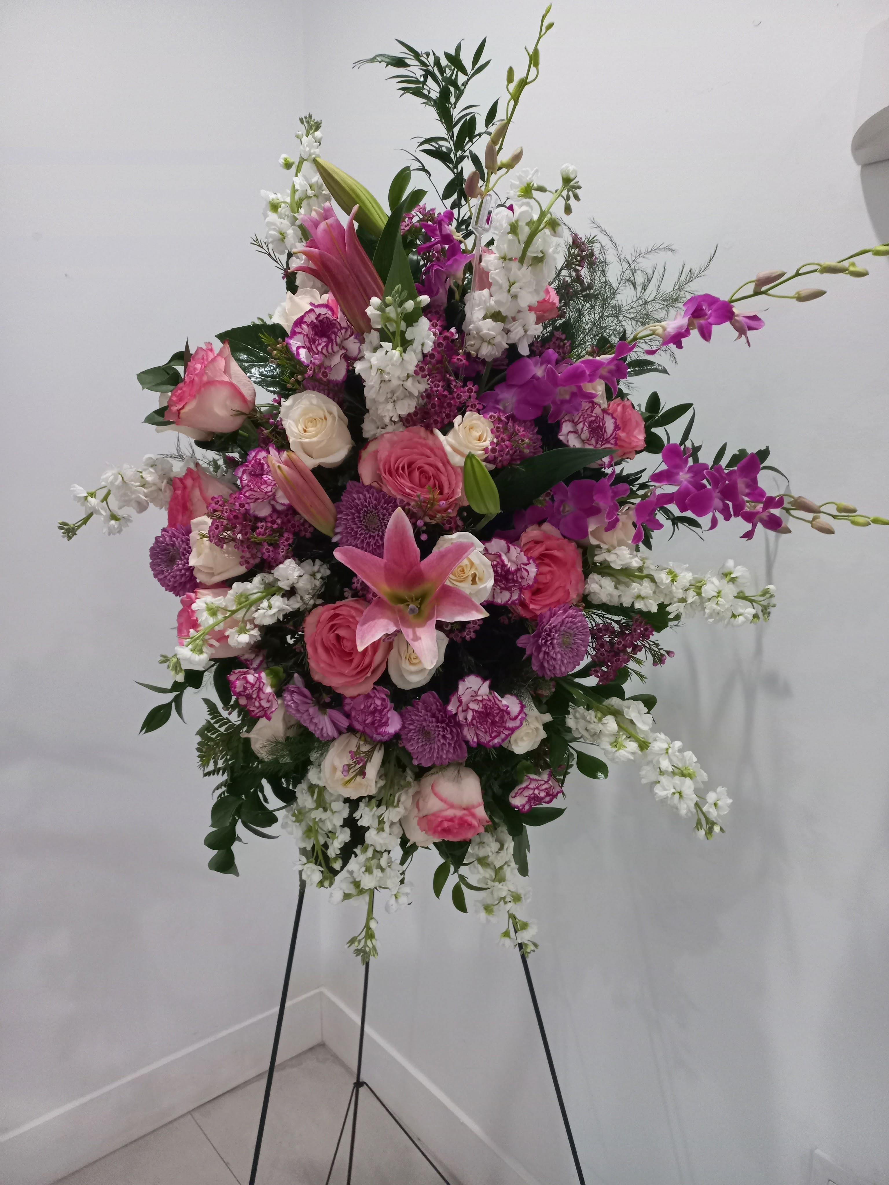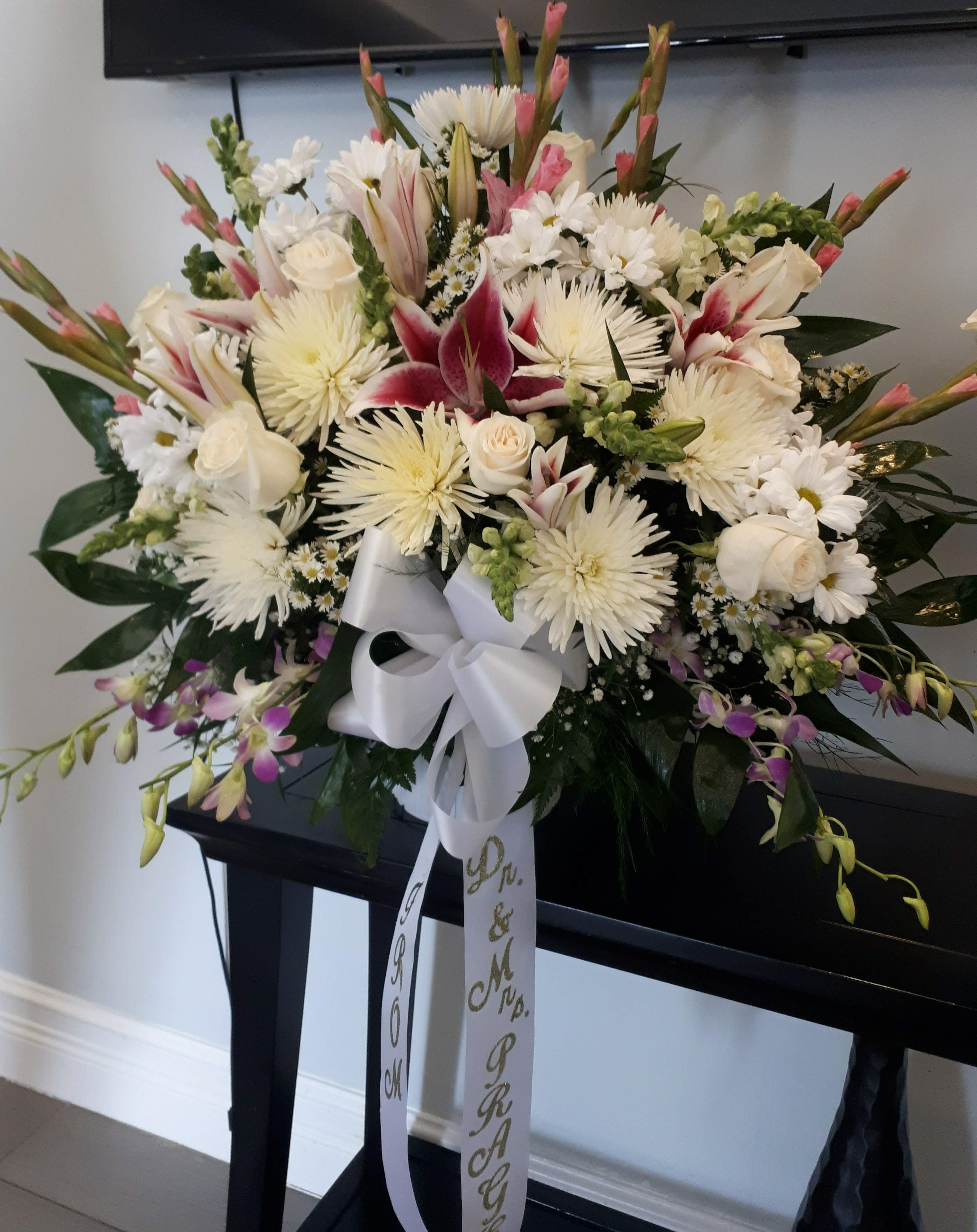 This beautiful standing spray features pink roses and white roses, white stock, pink lilies, lavender mums, bicolor carnations, pink dendrobium nestled in mixed greens. Price includes taxes and delivery fees. We deliver to Miami-Dade and broward counties.