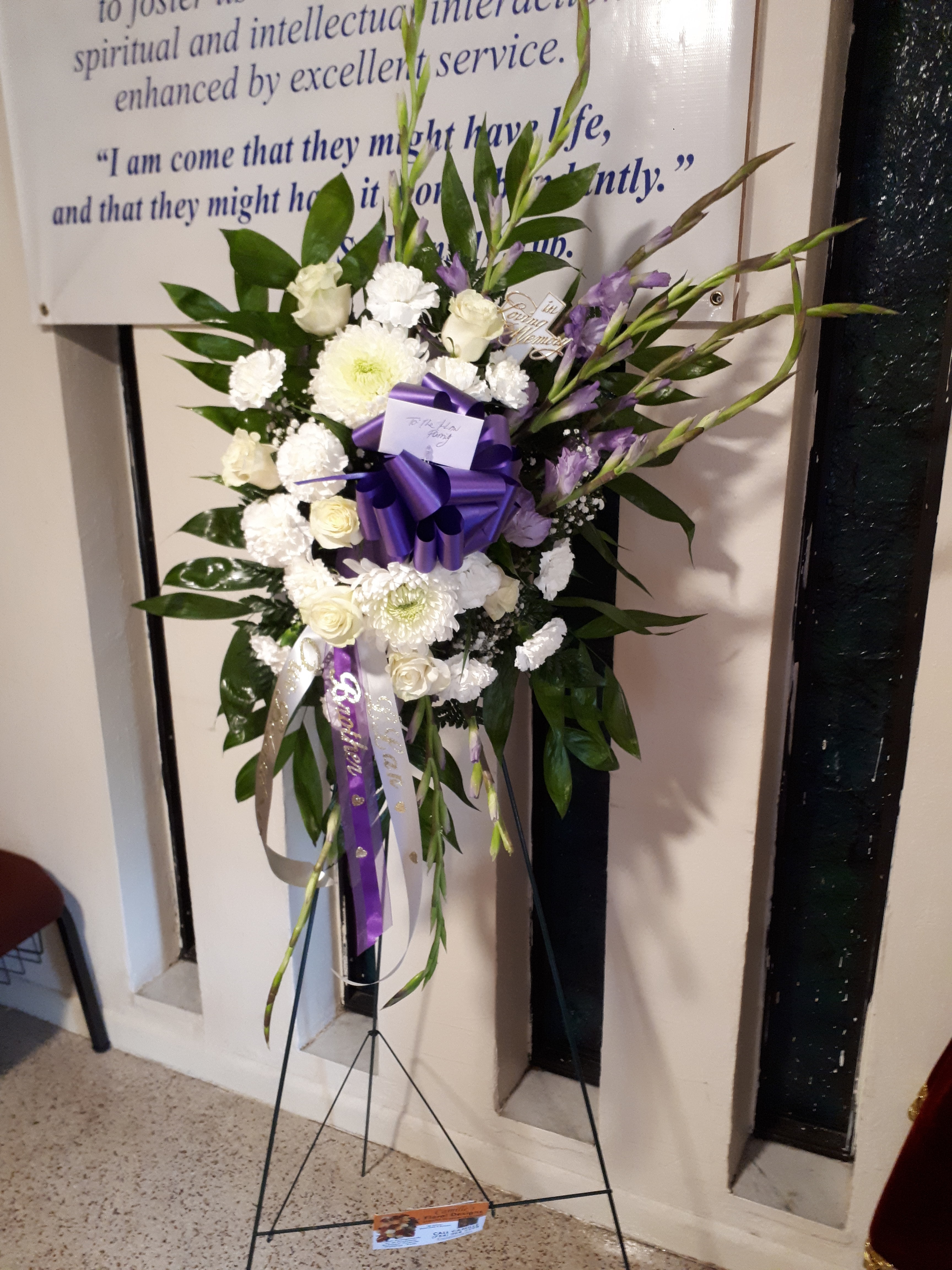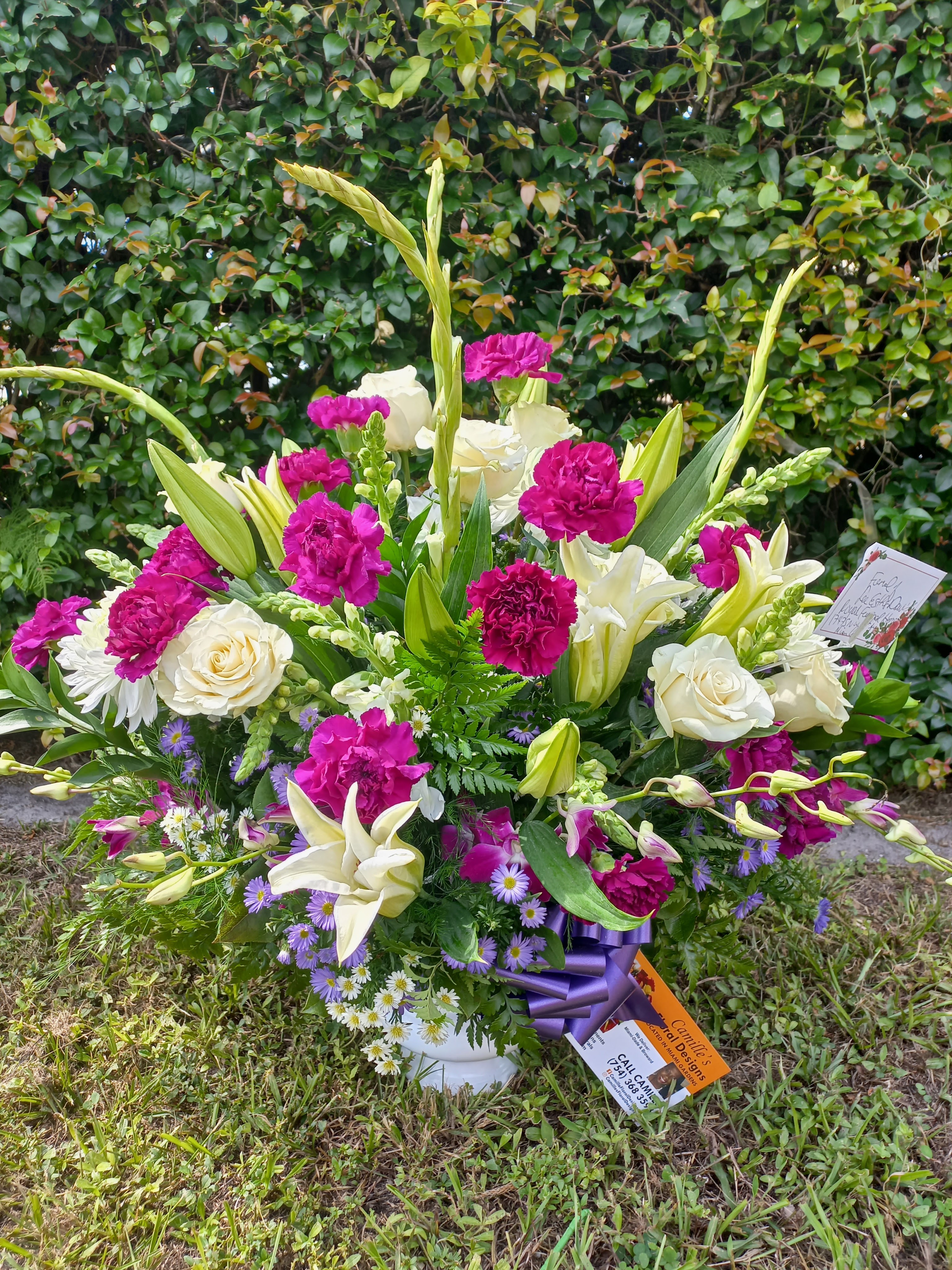 Send hhis beautiful standing spray features purple gladiolas, white mums, white carnations, white roses with jade leaves. Price includes tax and delivery fees. We deliver to Miami-Dade and broward counties.