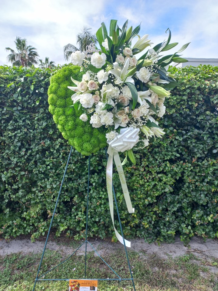 This stunning green and white closed heart i sympathy standing tribute features white lilies, white carnations, spray roses, green beautiful tribute. It features green mums nestled in mixed greens and monsterra leaves. Price includes taxes and delivery fees. We deliver to Miami-Dade and broward counties.