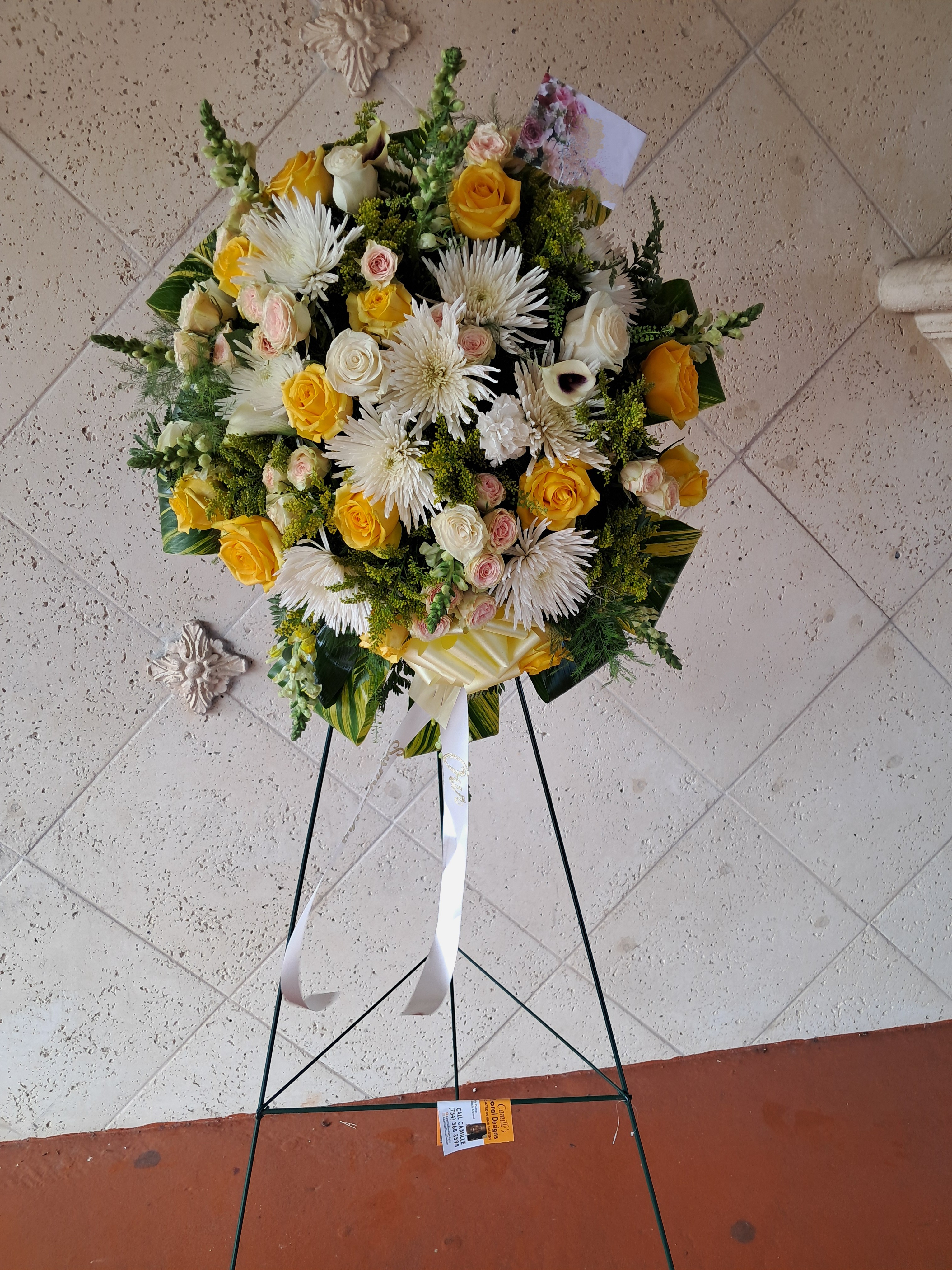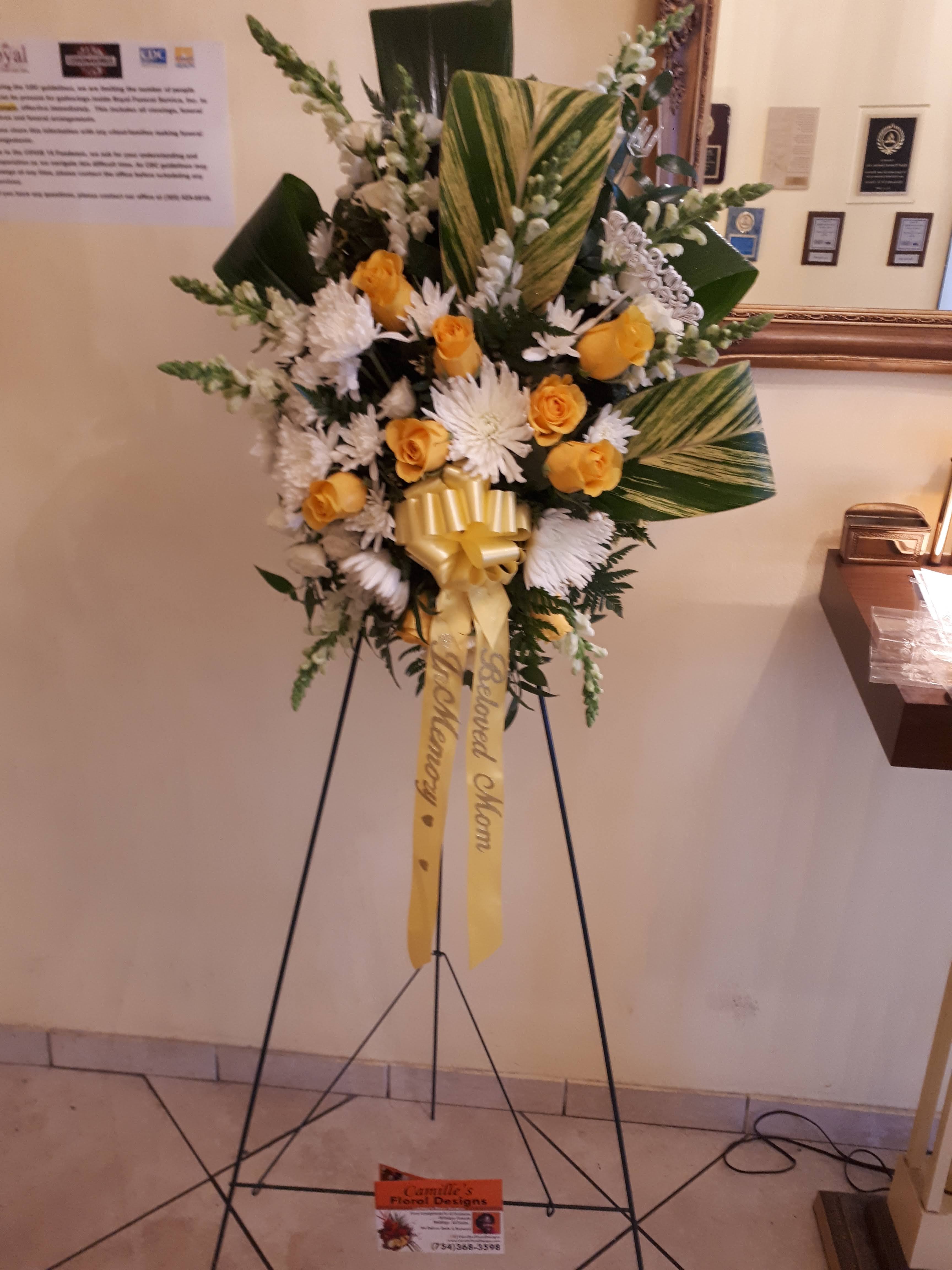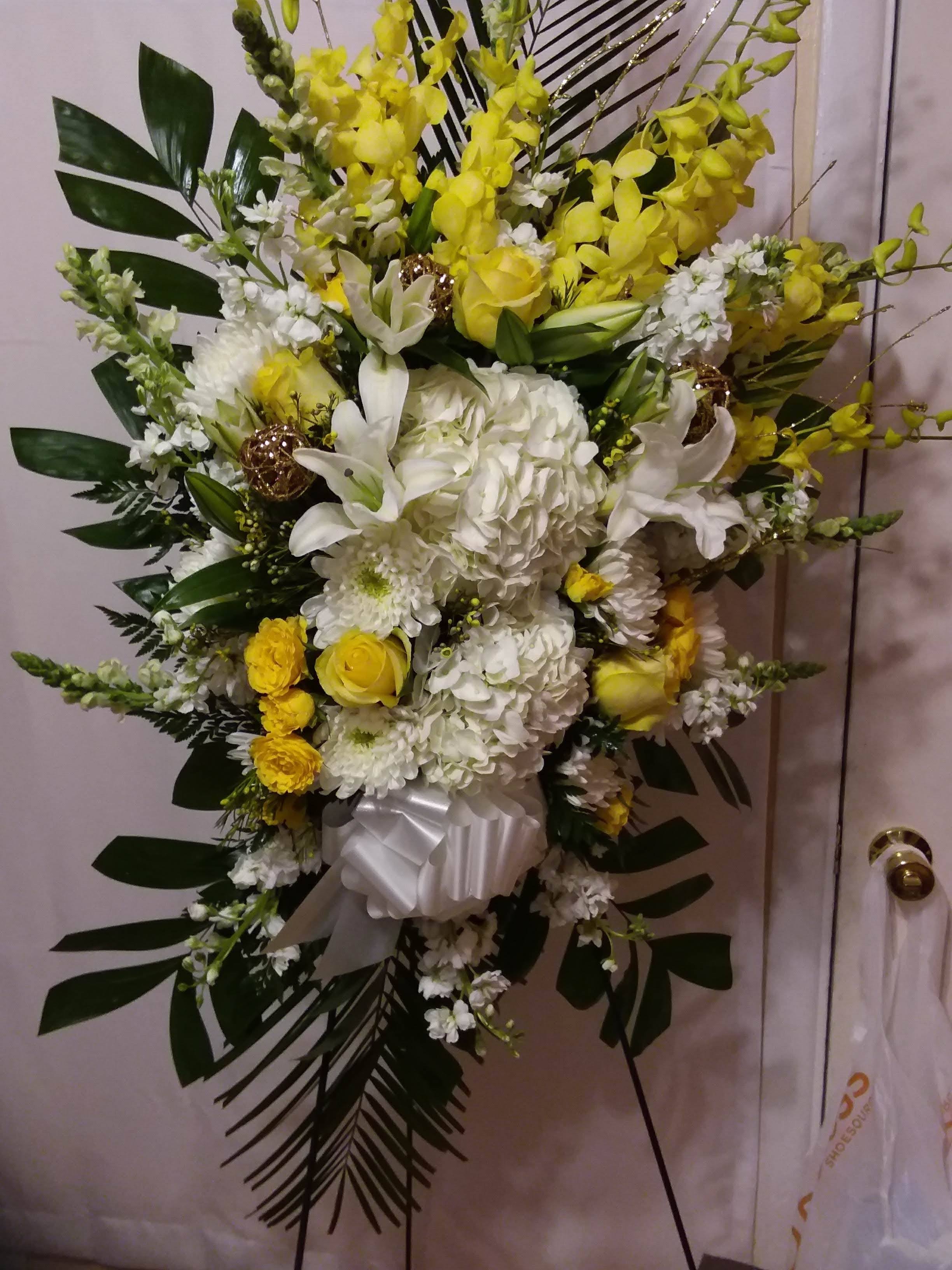 This beautiful standing spray is great for paying tribute to a loved one memorial or funeral service. It features yellow roses, white spiders, snapdragons, spray roses, mini calla lilies varigayed tea leaves ( when available). Price includes taxes and delivery fees. We deliver to Miami-Dade and Broward counties.