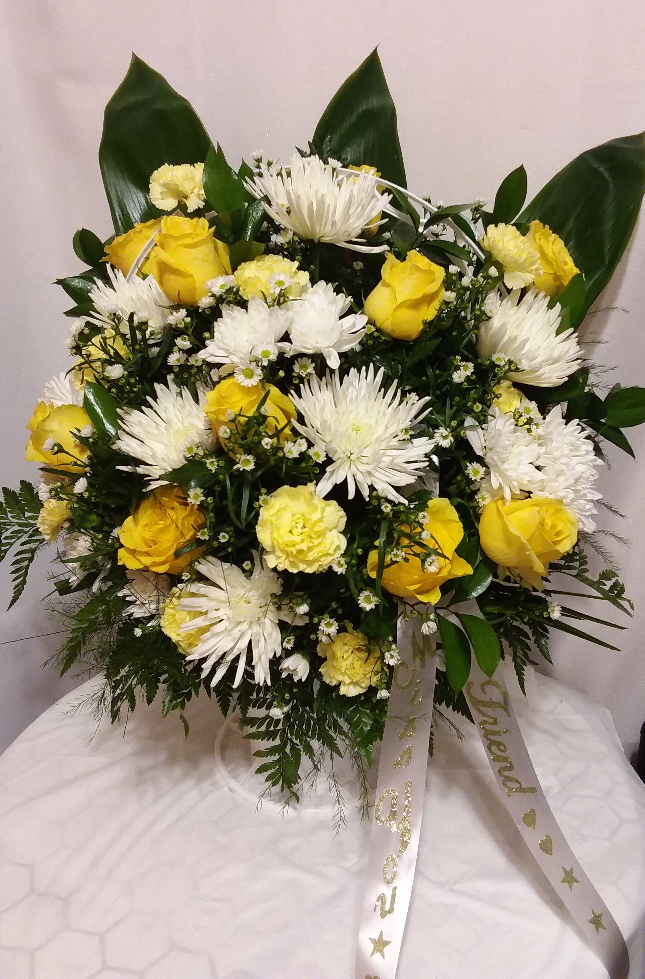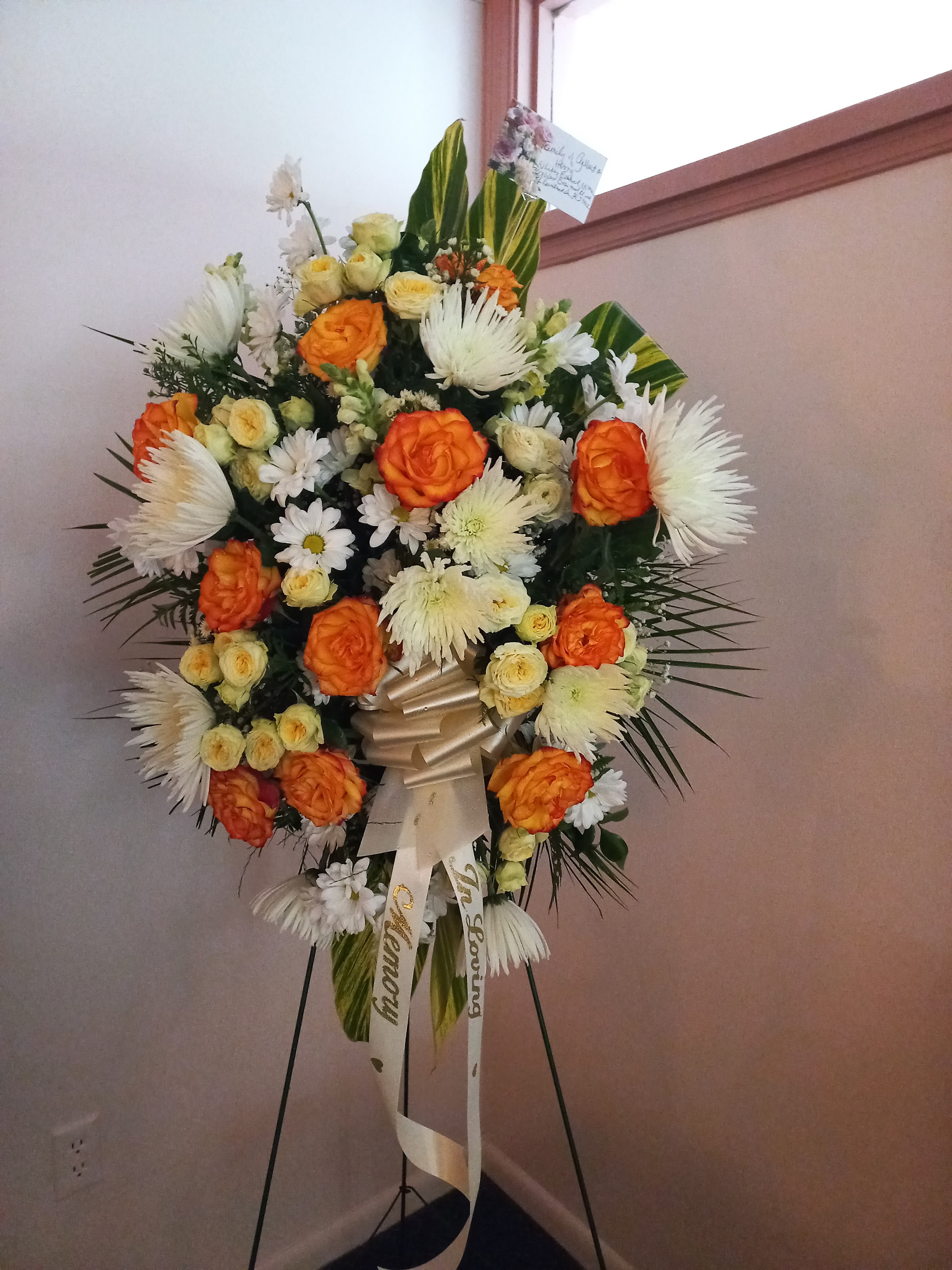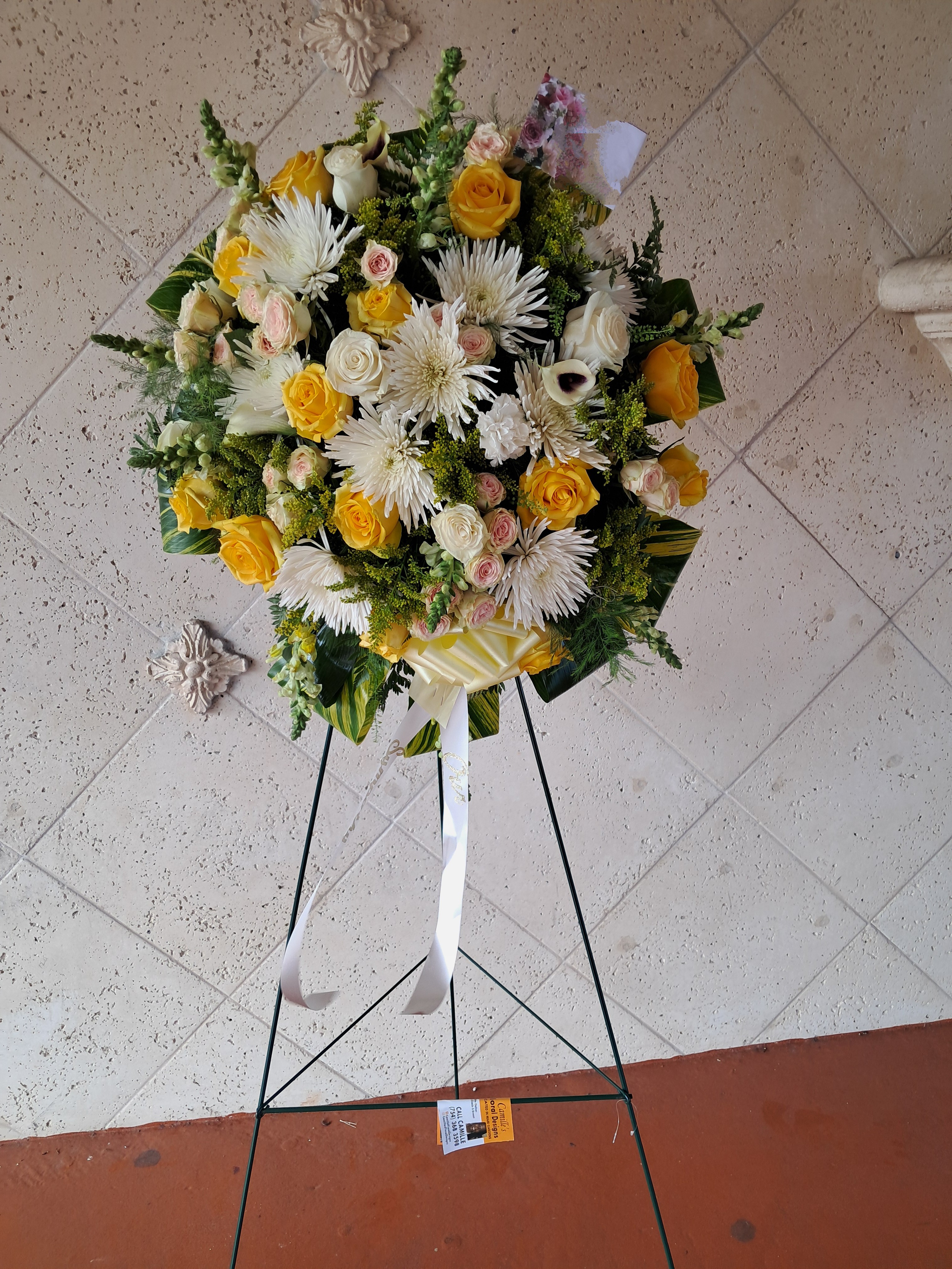 This beautiful standing spray is great for paying tribute to a loved one memorial or funeral service. It features yellow roses, white spiders, snapdragons, spray roses, mini calla lilies varigayed tea leaves ( when available). Price includes taxes and delivery fees. We deliver to Miami-Dade and Broward counties.
