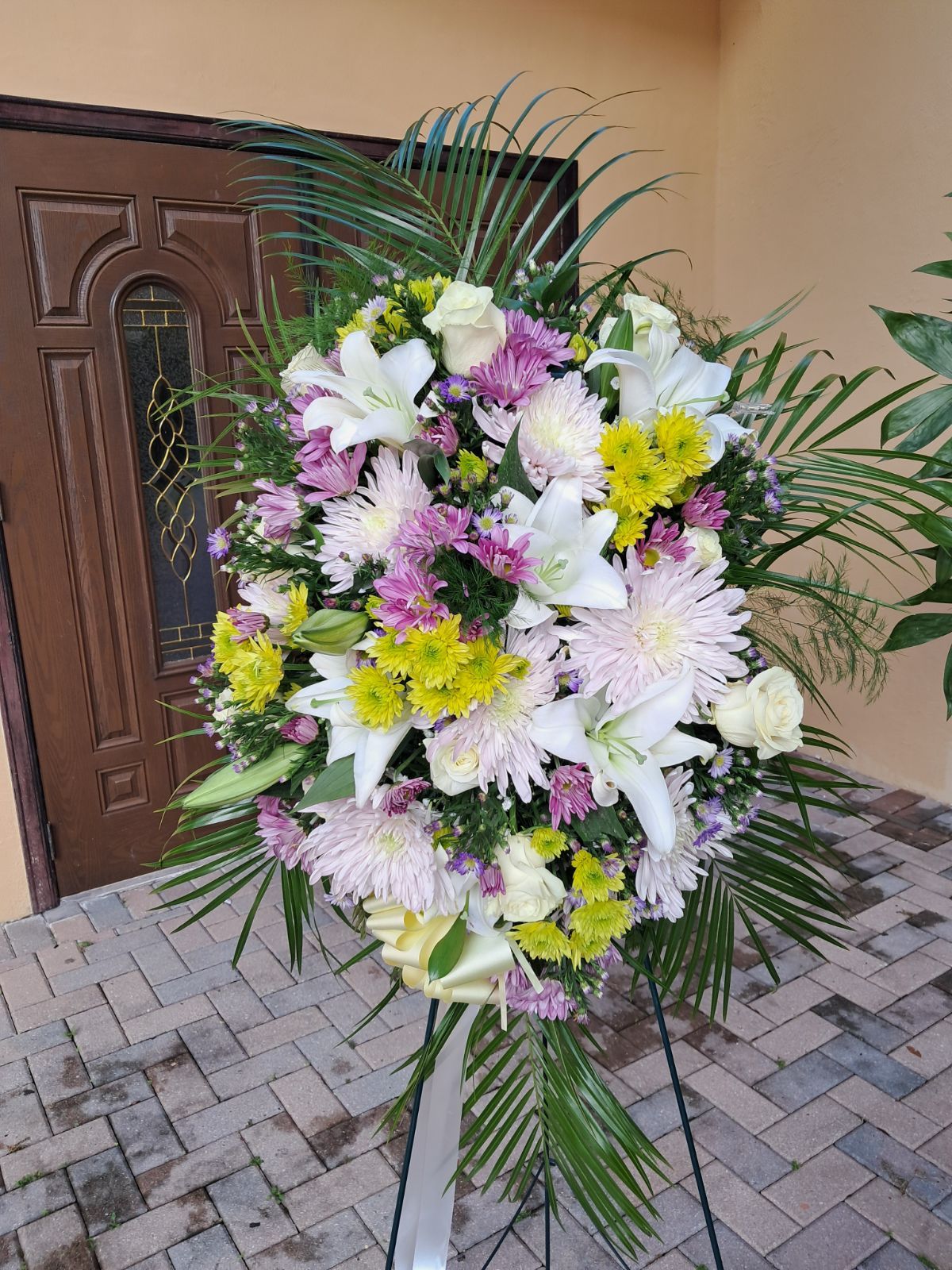 This beautiful light colored sympathy standing spray features lilies, lavender spiders, white or vendela roses, yellow buttons, and lavender chrysanthemums nestled in mixed greens, Asters. Price includes taxes and delivery fees. We deliver Miami Dade and Broward Counties.