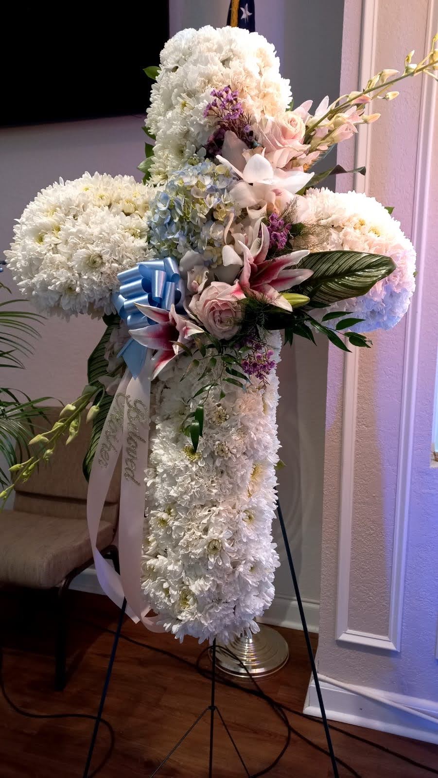 This beautiful large Standing cross express your sympathy on the passing of your loved one. It features white chrysanthemums, pink spray roses, white roses, carnations, pink Asiatic lillies, pink dendrobium orchids. Price includes tax and delivery fees. We deliver to Miami-Dade and broward counties.