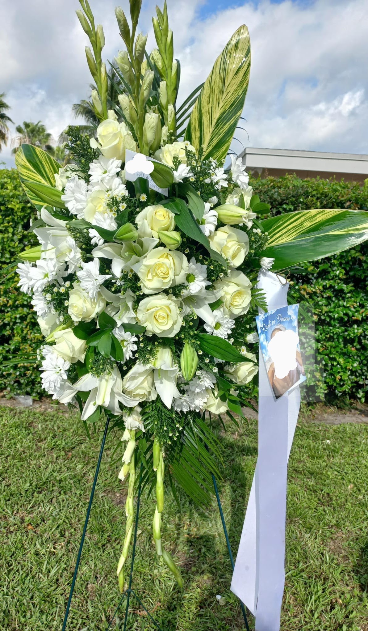 This beautiful all white standing spray features white ginger, white lilies, cream colored roses, white Gladiolas, tree fern, nestled in variegated leaves, tree ferns, ruscus, lemon leaves, accented with silver ribbon and bow. Stand Included. Price includes taxes and delivery fees. We deliver to Miami-Dade and broward counties.