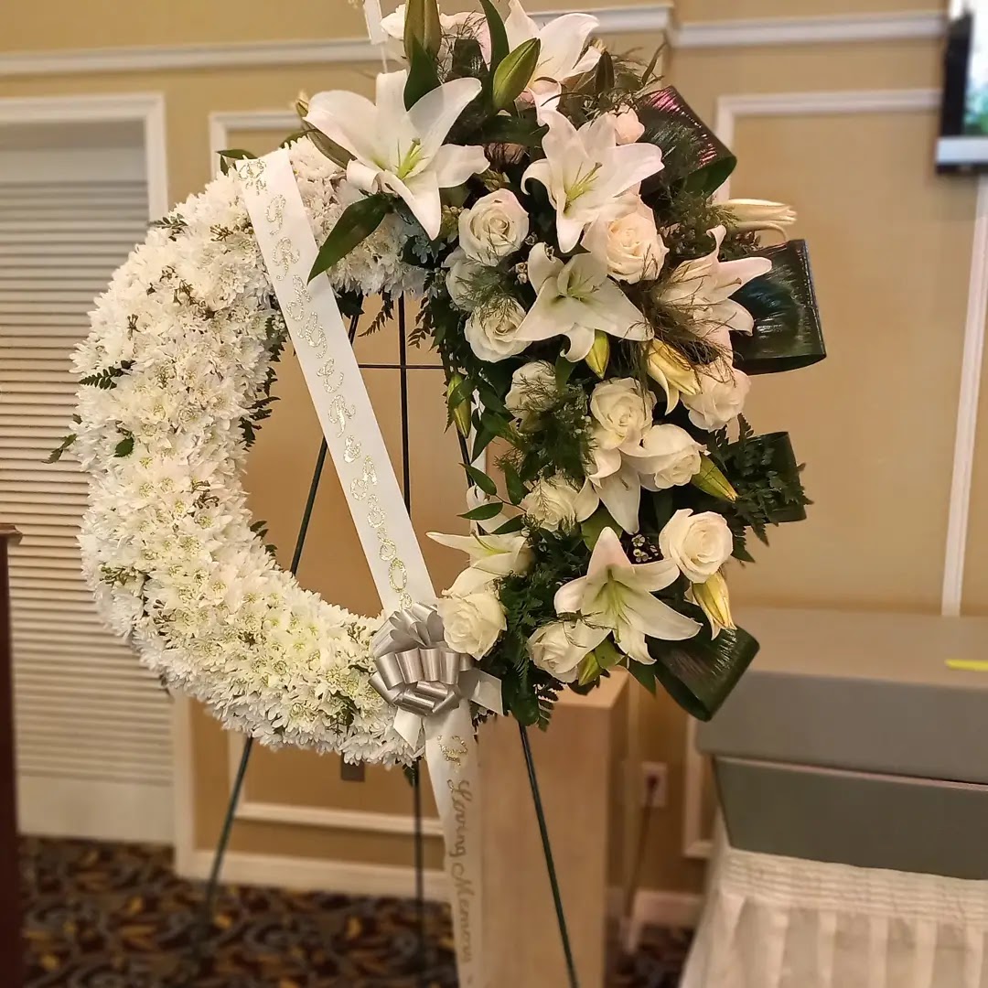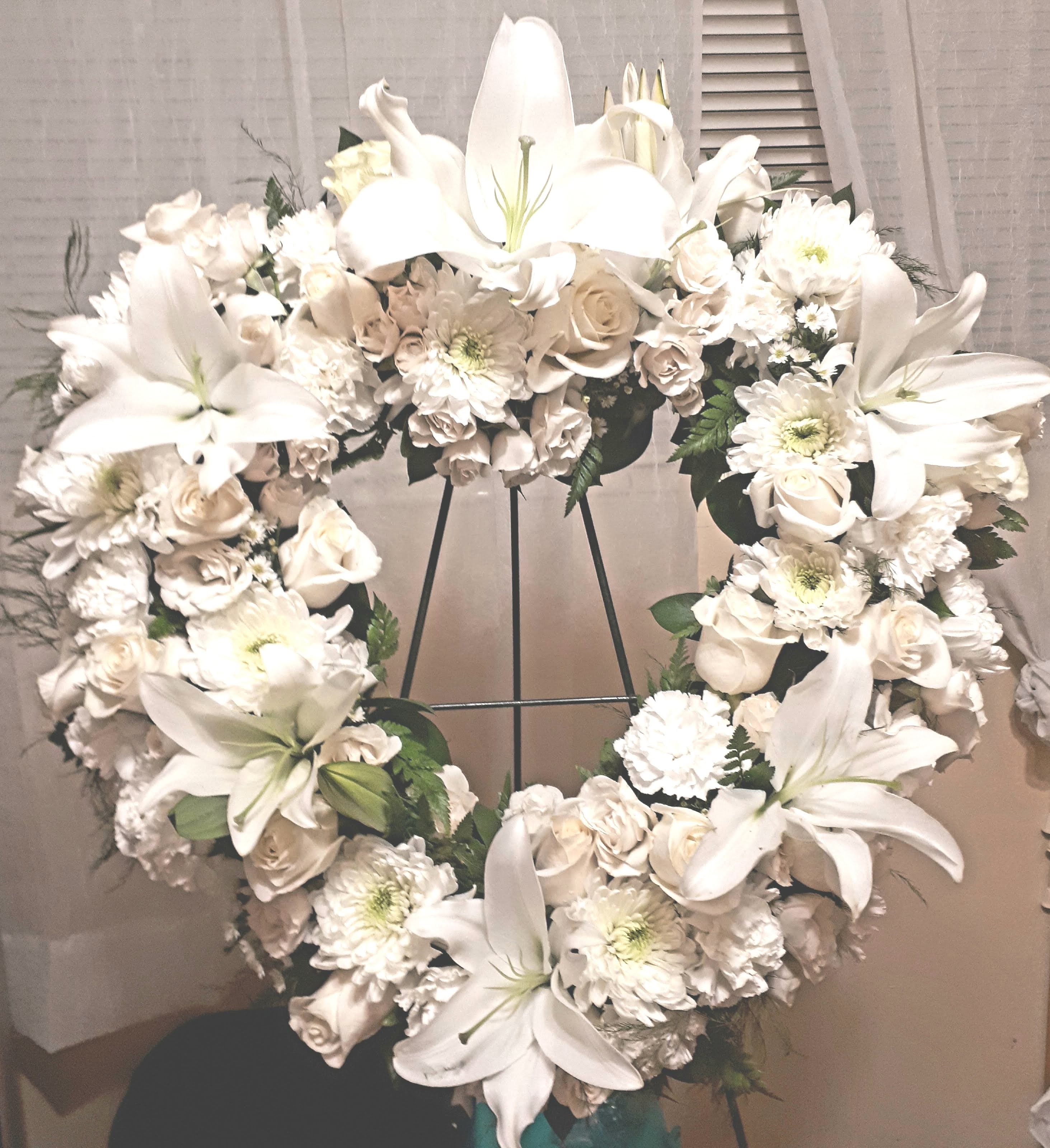 this beautiful ex-large wreath arrangement 36″ features large white lilies, white roses, white chrysanthemums, aspidira leaves. price includes taxes and delivery. We deliver to Miami-Dade and Broward counties. Also available in small, medium and large