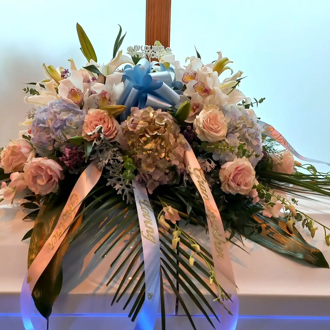 This beautiful pastel color casket spray features light pink garden roses, baby blue hydrangeas, white lilies, pink orchids, dendrobium orchids, palm leaves. price includes taxes and delivery fees. We deliver to Miami-Dade and Broward counties.