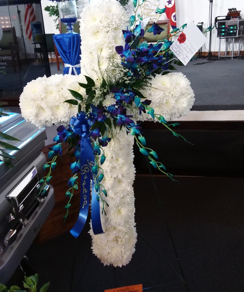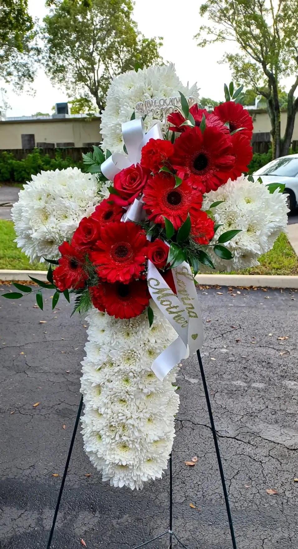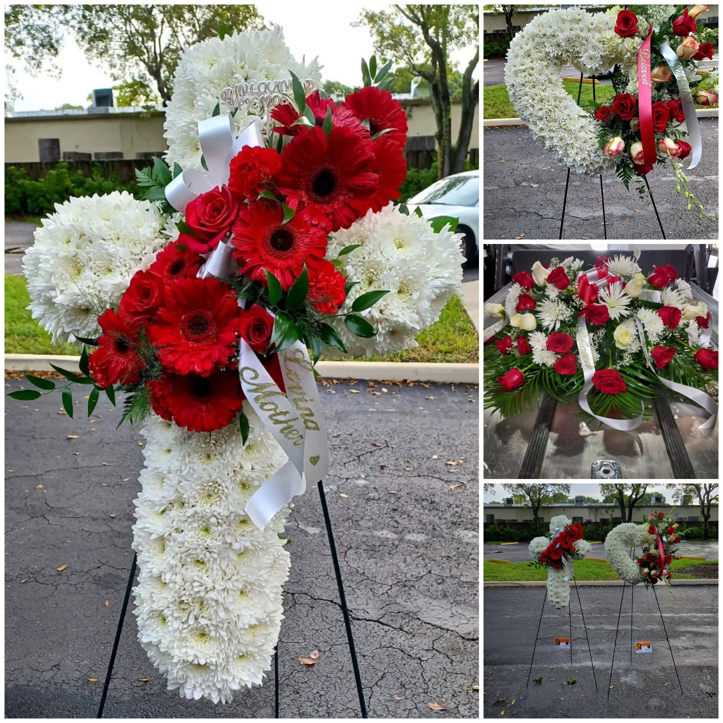 This beautiful cross stands 5ft 6inches, and features white chrysanthemums, gerber daisies, red roses, red carnations, Price includes taxes and delivery fees. We deliver to MIami-Dade and Broward COunties. Price includes taxes and delivery fees.