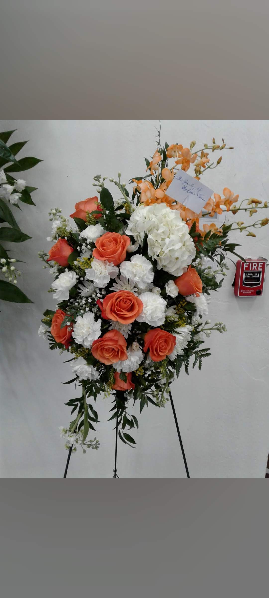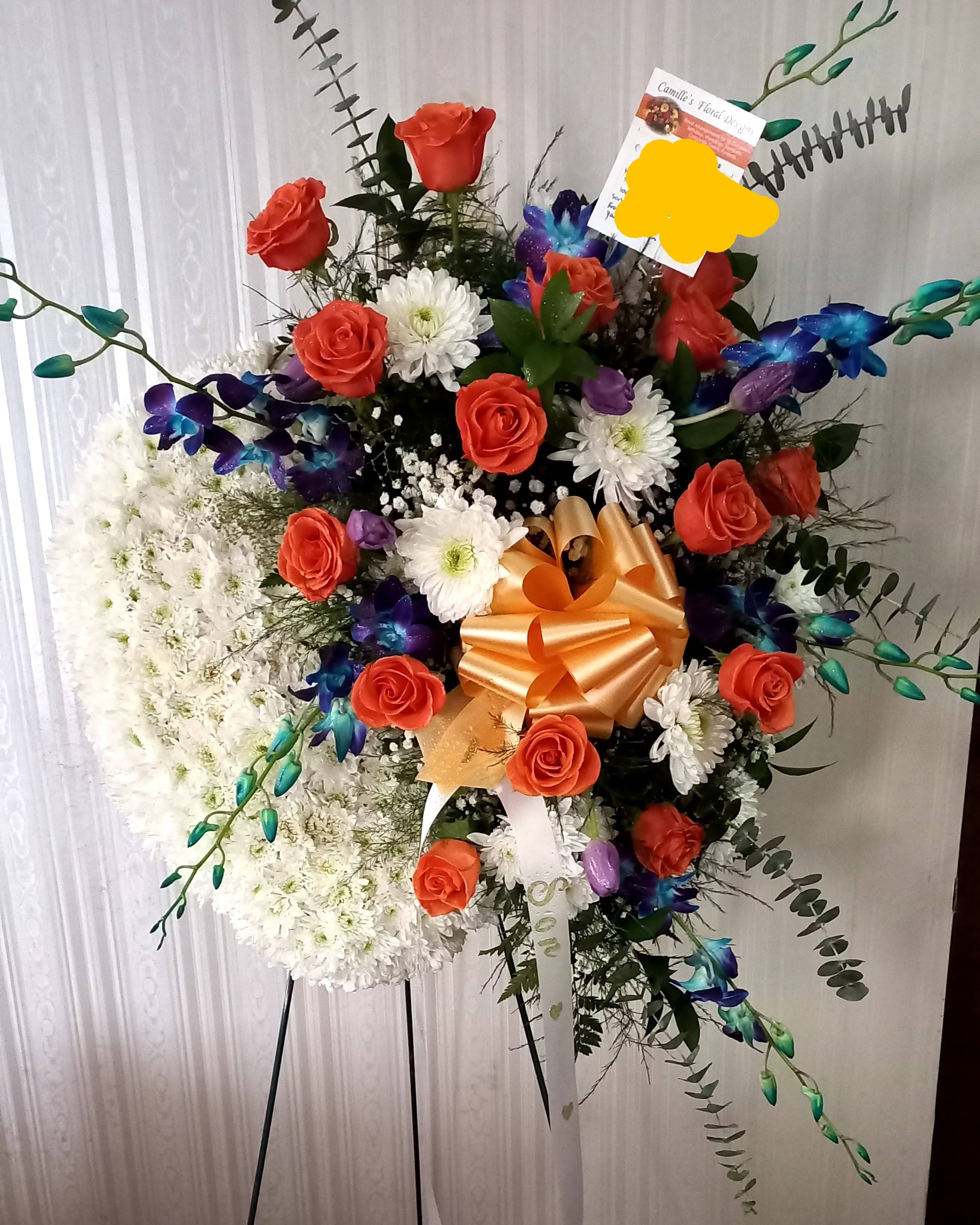 This beautiful standing spray features white spiders, high magic Ecuadorian roses, white daisies, cream colored spray roses, snapdragons, nestled in mixed greens and asters. Price includes taxes and delivery fees. We deliver to Miami-Dade and broward counties. Please include delivery address as Shipping address.