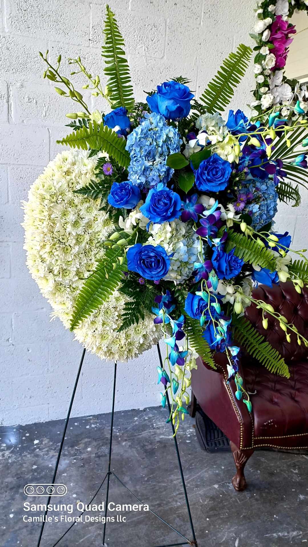 This beautiful blue and white sympathy spray features Royal blue Ecuadorian roses, white Ecuadorian roses, egarium, white spiders, blue purple dendrobium orchids, white daisies with italian ruscus greens and asters. Price includes tax and delivery fees. We deliver to Miami-Dade and broward counties.