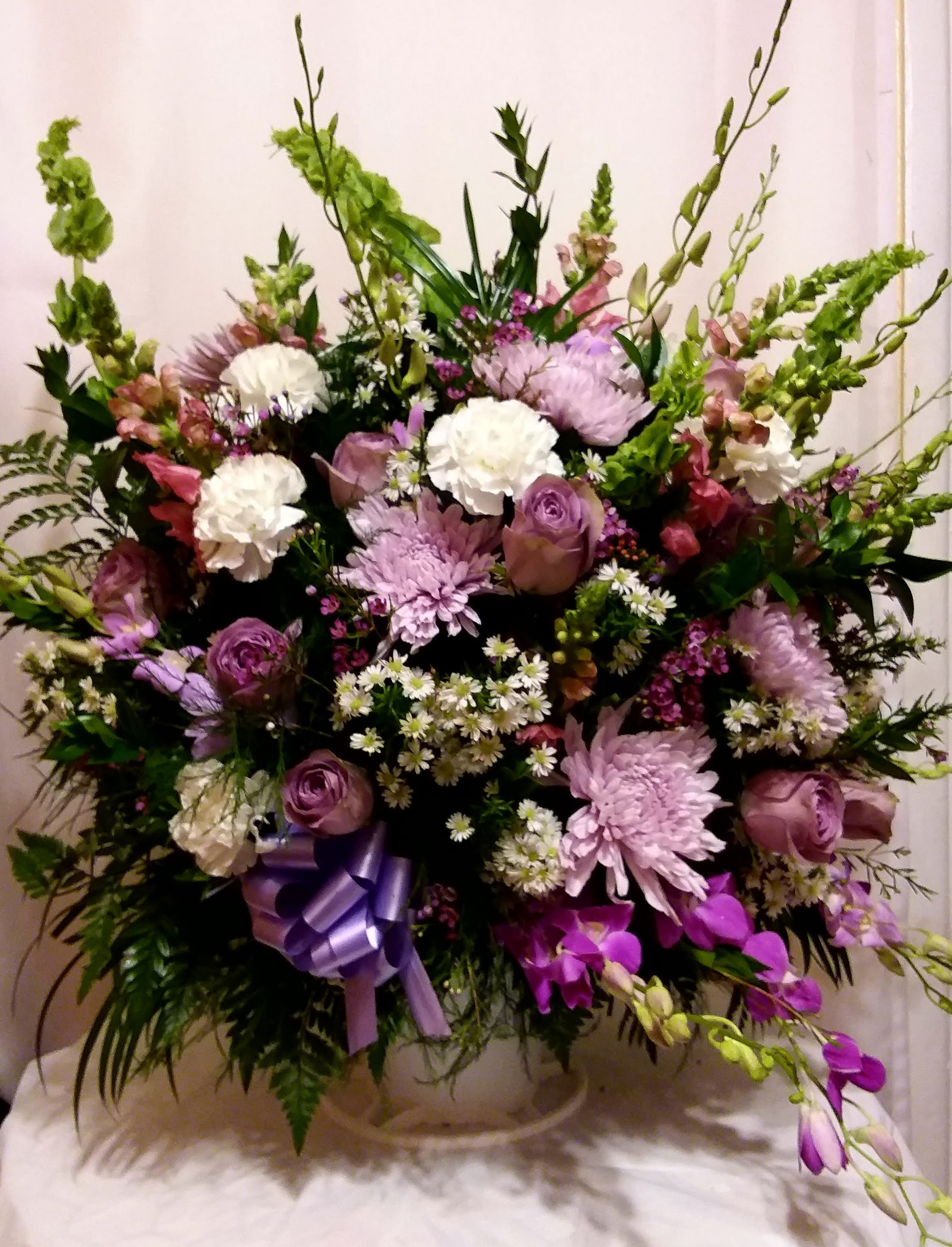 This beautiful mixed standing spray features white spiders, bamboo orchids, oriental lilies, purple roses. White roses nestled in mixed greens and tree fern. Price includes taxes and delivery fees. We deliver to Miami-Dade and broward counties.