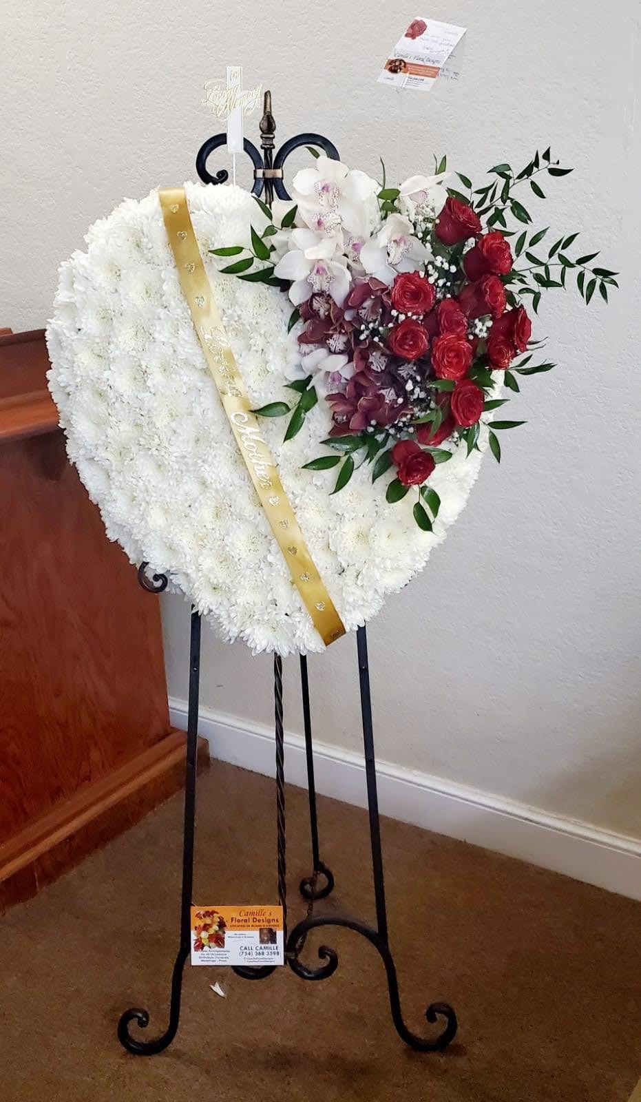 This beautiful large 36″ closed heart, stands at least 5ft tall and makes a statement as it displays its beatutiful heart shape. It features white cremons, burgundy and white Cynbidium orchids and red roses makes a statement at your loved ones funeral or memorial service. Stand is for display only. . We deliver to Miami-dade broward and surrounding counties. Stand used for display not included in price.