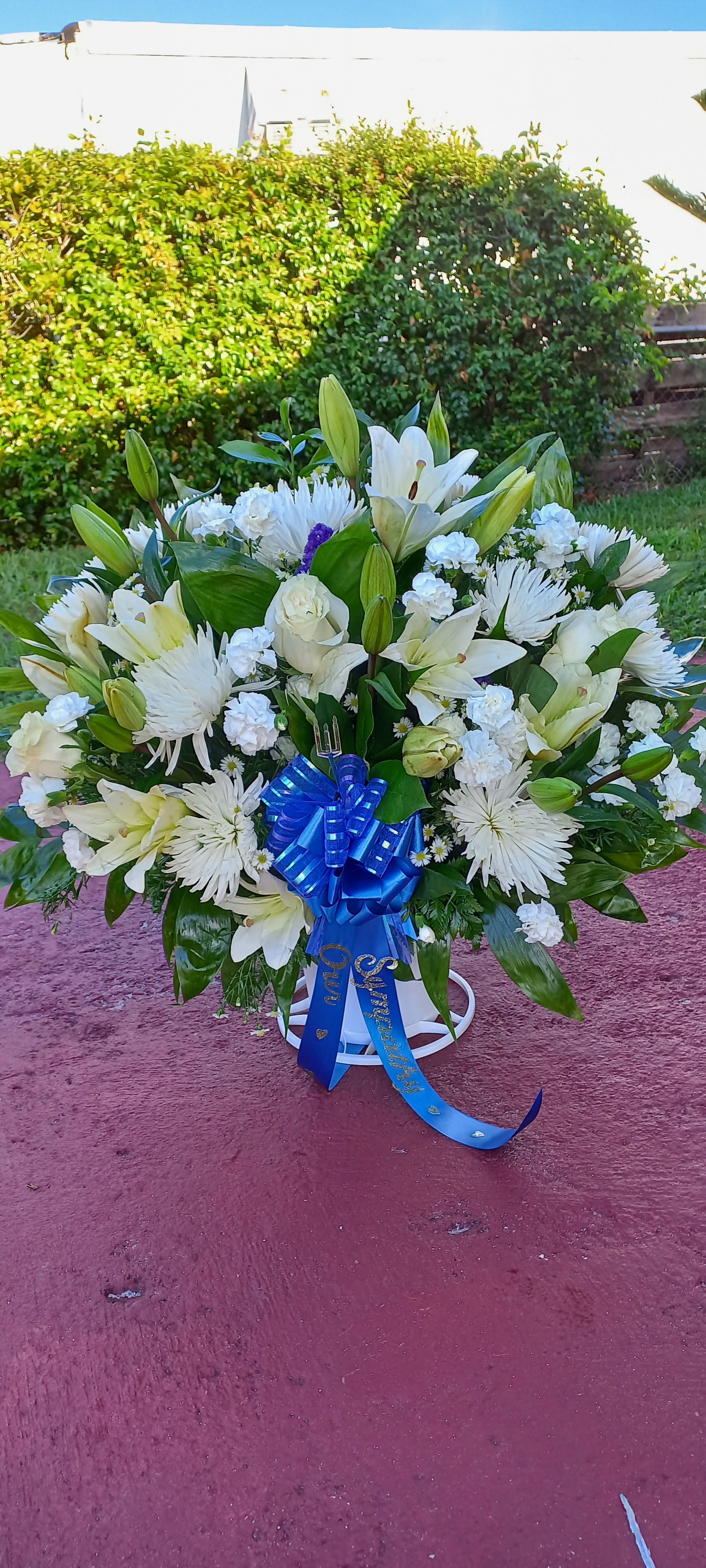 This beautiful large all white Sympathy Vase features white spiders, white lilies, white roses,white mini carnations nestled in mixed greens and beautifully accented with a bow and ribbon your choice in colors. Price includes taxes and delivery fees. We deliver to Miami-Dade and broward counties.