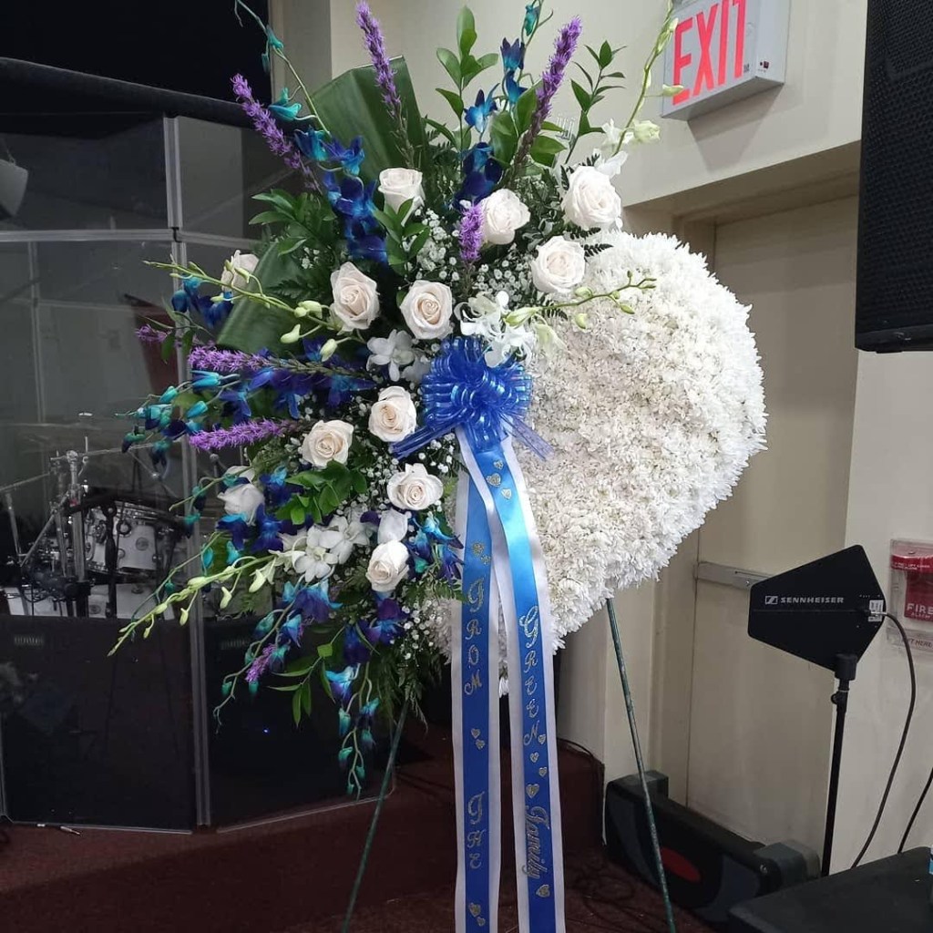 This beautiful large (18″heart features white Chrysanthemums cushions, vendela roses, blue and purple dendrobium orchids and liatris nestled in mixed greens. Includes 5.7ft stand Price includes tax and delivery fees. We deliver to Miami-Dade and broward counties. Colors and size may vary depending on your choice