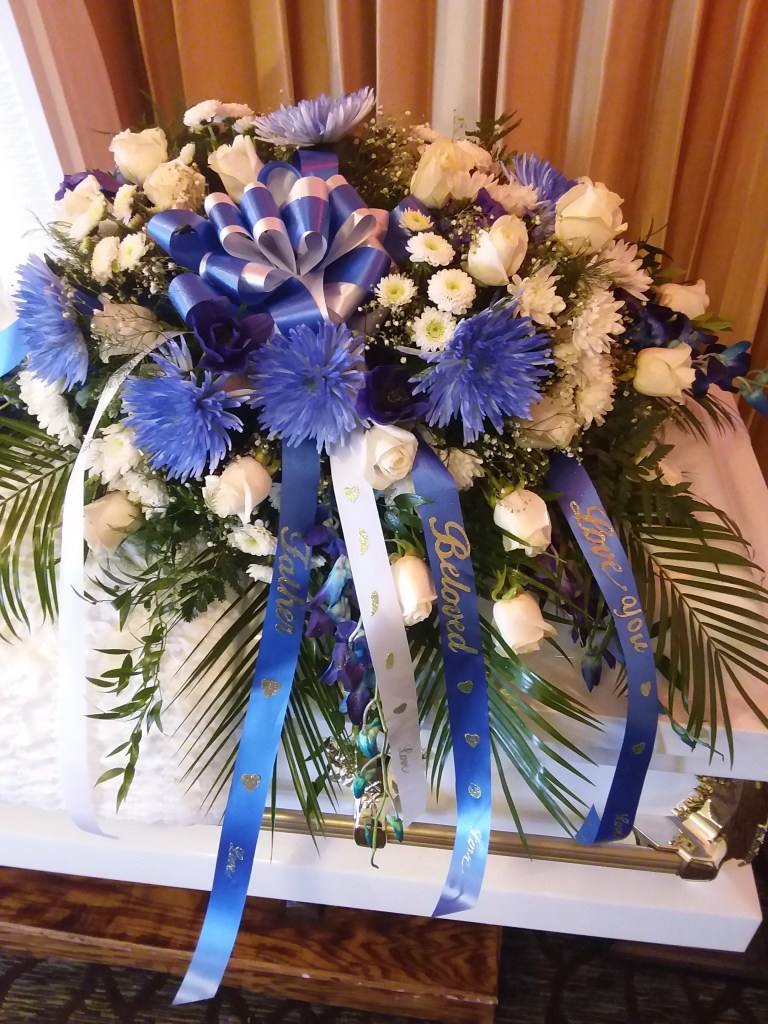Say we love you with this beautiful blue blue and white casket spray features vendella roses, white buttons, blue spiders, white Chrysanthemums, purple anemone, blue purple dendrobium orchids, lush greens of ferns, Italian ruscus greens, leather leaves and baby’s breath. Price includes tax and delivery fees. We deliver to Miami-Dade and broward counties . West Palm Beach delivery fees not included. Available in different sizes