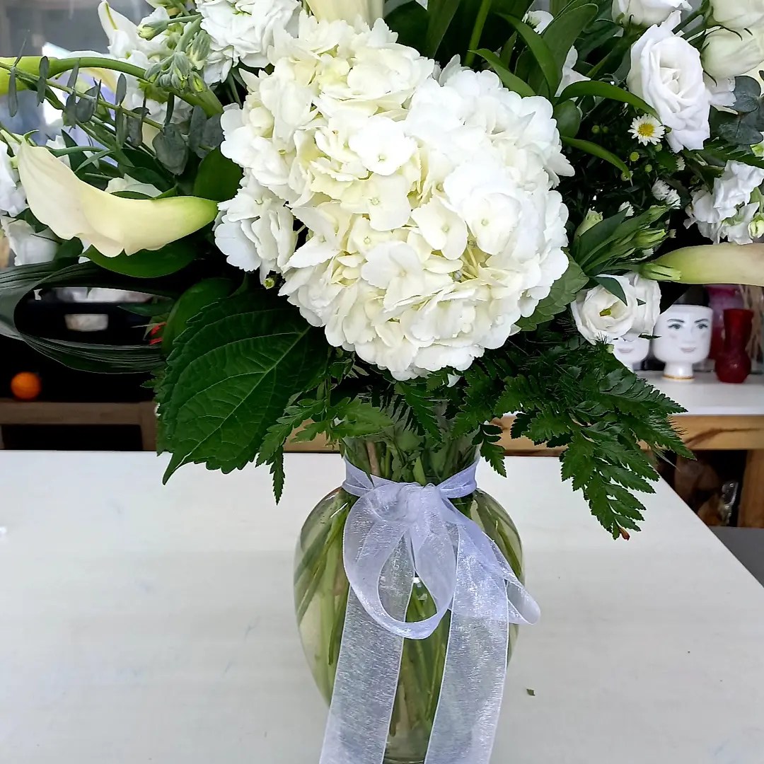 this beautiful all white vase arrangement features a variety of white flowers, such as white hydrangeas, white calla lilies, white lilies, white lisianthus. It symbolize peace and love and calm during a time of mourning. Price includes taxes and delivery fees. we deliver to Miami-Dade and broward counties