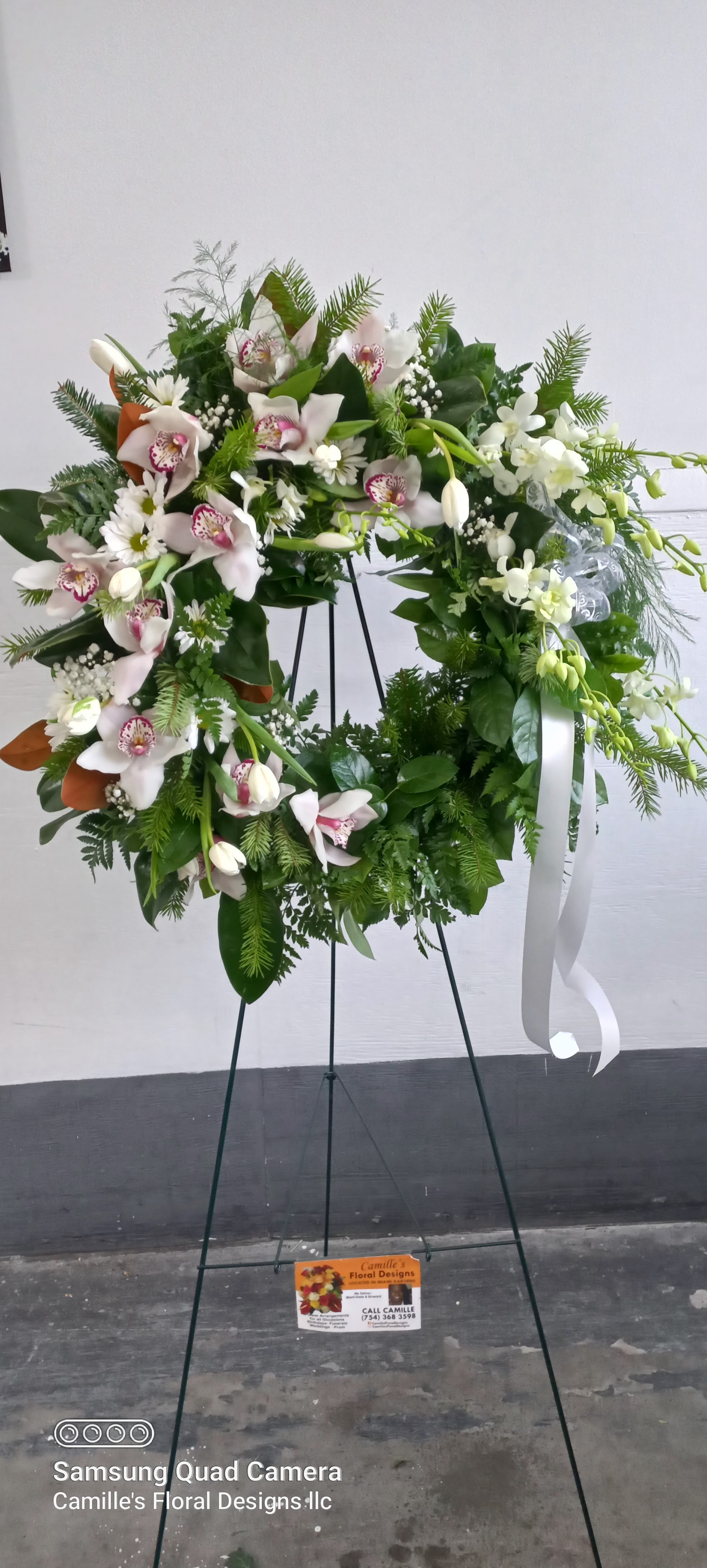 This beautiful round wreath is exotic and stylish. It features white Cynbidiums orchids, purple and white Dendrobium orchids, cream and purple Ecuadorian roses, white Chrysanthemums, nestled in tropical leaves, wax flowers. Price includes taxes and delivery fees. We deliver to Miami-Dade and Broward Counties.
