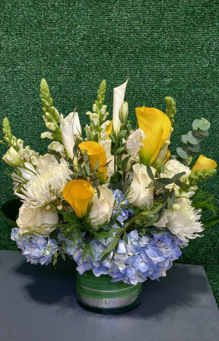 This large arrangement features yellow mini calla lilies, white roses, white calla lilies, snap dragons, white spiders, baby blue hydrangeas, equalypsus, nestled in mixed greens and tree fern in a cylinder glass vase. Great gift for a bereaved family. Price includes taxes and delivery fees. We deliver to Miami-Dade and broward counties.